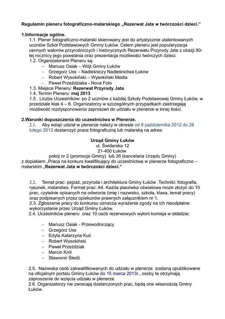 Regulamin pleneru fotograficzno-malarskiego „Rezerwat Jata w twórczości dzieci.” 1.Informacje ogólne. 1.1. Plener fotograficzno-malarski skierowany jest do artystycznie utalentowanych uczniów Szkół Podstawowych Gminy Łuków. Celem pleneru jest popularyzacja cennych walorów przyrodniczych i historycznych Rezerwatu Przyrody Jata z okazji 80tej rocznicy jego powstania oraz prezentacja możliwości twórczych dzieci. 1.2. Organizatorami Pleneru są: − Mariusz Osiak – Wójt Gminy Łuków − Grzegorz Uss – Nadleśniczy Nadleśnictwa Łuków − Robert Wysokiński – Wysokiński Media − Paweł Przeździaka - Nova Foto 1.3. Miejsce Pleneru: Rezerwat Przyrody Jata 1.4. Termin Pleneru: maj 2013 1.5 . Liczba Uczestników: po 2 uczniów z każdej Szkoły Podstawowej Gminy Łuków, w przedziale klas 4 – 6. Organizatorzy w szczególnych przypadkach zastrzegają możliwość rozdysponowania zaproszeń do udziału w plenerze w innej ilości. 2.Warunki dopuszczenia do uczestnictwa w Plenerze. 2.1. Aby wziąć udział w plenerze należy w okresie od 8 października 2012 do 28 lutego 2013 dostarczyć prace fotograficzną lub malarską na adres: Urząd Gminy Łuków ul. Świderska 12 21-400 Łuków pokój nr 2 (promocja Gminy) lub 26 (kancelaria Urzędu Gminy) z dopiskiem „Praca na konkurs kwalifikujący do uczestnictwa w plenerze fotograficzno – malarskim „Rezerwat Jata w twórczości dzieci.” 2.2. Temat prac: pejzaż, przyroda i architektura Gminy Łuków .Techniki: fotografia, rysunek, malarstwo. Format prac: A4. Każda placówka oświatowa może złożyć do 10 prac, czytelnie opisanych na odwrocie (imię i nazwisko, szkoła, klasa, temat pracy) oraz podpisanych przez opiekunów prawnych załącznikiem nr 1. 2.3. Zgłoszenie pracy do konkursu oznacza wyrażenie zgody na ich nieodpłatne wykorzystanie przez Urząd Gminy Łuków. 2.4. Uczestników pleneru oraz 10 osób rezerwowych wyłoni komisja w składzie: − − − − − − − Mariusz Osiak - Przewodniczący Grzegorz Uss Edyta Katarzyna Kuć Robert Wysokiński Paweł Przeździak Marcin Król Sławomir Śledź 2.5. Nazwiska osób zakwalifikowanych do udziału w plenerze zostaną opublikowane na oficjalnym portalu Gminy Łuków do 15 marca 2013r., osoby te otrzymają zaproszenie do wzięcia udziału w plenerze. 2.6. Organizatorzy nie zwracają dostarczonych prac, będą one własnością Gminy Łuków. 3. Potwierdzenie uczestnictwa w plenerze. 3.1. Zgłoszenie uczestnictwa odbywa się poprzez potwierdzenie uczestnictwa na załączniku do zaproszenia wystosowanego przez Organizatorów (załącznik nr 2). Zgłoszenie musi zawierać pisemną zgodę rodziców lub opiekunów na: udział dziecka w plenerze, zgodę na wykorzystanie wizerunku dziecka, zgodę na nieodpłatne wykorzystywanie prac wykonanych przez dziecko podczas pleneru (załączniki nr: 3, 4 i 5). Uwaga !!! Brak któregokolwiek z w/w załączników będzie skutkował skreśleniem z listy Uczestników i zakwalifikowaniem osoby z listy rezerwowej. 3.2. Termin oddawania zgłoszeń – do 29 marca 2013. Brak zgłoszenia w/w terminie będzie skutkował skreśleniem z listy Uczestników i zakwalifikowaniem osoby z listy rezerwowej. 3.3. Uczestnicy Pleneru zobowiązują się do udostępnienia Organizatorom nieodpłatnie dwóch prac powstałych na plenerze: - fotografie - 30x45 w formie pliku JPG w rozdzielczości 300 DPI na płycie CD lub DVD, lub - prace plastyczne - minimalny format A3 3.4. Do każdej pracy należy dołączyć dane autora : imię i nazwisko, wiek, nazwę szkoły i klasę do której uczęszcza autor oraz nr telefonu do opiekuna prawnego. 4. Plener i wyposażenie Uczestników. 4.1. O terminie pleneru Organizatorzy poinformują osoby zakwalifikowane do pleneru oraz szkoły – odrębnym pismem 4.2. Transport na trasie Łuków – Żdżary – Łuków zapewnią Organizatorzy. 4.3. Osoby biorące udział w plenerze zostaną ubezpieczone od następstw nieszczęśliwych wypadków w trakcie trwania pleneru. 4.4. Niezbędny sprzęt i ekwipunek: Zapewnienie sprzętu i ekwipunku nie jest obowiązkiem Organizatorów. Uczestnicy wykonują prace na własnym sprzęcie i materiałach tj. aparat fotograficzny, podobrazia, karton, farby, kredki itp., Odpowiedni do pogody panującej w dniu pleneru ubiór, w tym peleryna lub kurtka przeciwdeszczowa oraz suchy prowiant i napoje. 4.5. Organizatorzy nie biorą odpowiedzialności za wszelki sprzęt zagubiony, zniszczony lub uszkodzony w czasie trwania pleneru. 4.6. Organizatorzy nie ponoszą odpowiedzialności finansowej za szkody powstałe nie z ich winy. Odpowiedzialność finansową za powstałe szkody ponoszą sprawcy/ opiekunowie prawni. 4.7. Rodzice biorą pełną odpowiedzialność za osoby niepełnoletnie biorące udział w plenerze. 4.8. Osoby obecne na plenerze zobowiązane są do zachowywania się w sposób nie zagrażający sobie oraz bezpieczeństwu innych. 4.9. Organizatorzy nie biorą odpowiedzialności za nieszczęśliwe wypadki w czasie trwania pleneru. 4.10. Uczestnictwo w plenerze jest bezpłatne. 4.11. Opiekę nad dziećmi w czasie pleneru sprawuje Nauczyciel delegowany przez Dyrektora szkoły oraz Leśnicy. 4.12. Organizatorzy zastrzegają sobie prawo do odwołania pleneru w przypadku zaistnienia okoliczności uniemożliwiających jego realizację. 5. Wystawa poplenerowa. 5.1. Organizatorzy zrealizują wystawę prac wykonanych podczas pleneru. Wystawa poplenerowa odbędzie się w Urzędzie Gminy Łuków. 5.2. Uczestnicy zobowiązują się do udostępnienia organizatorom prac i nieodpłatnie udzielają na rzecz Organizatorów wyłącznej, nieograniczonej czasowo, nieograniczonej terytorialnie licencji na wystawienie oraz publikację tych prac. 5.3. Organizatorzy zastrzegają sobie prawo wyboru prac przeznaczonych na wystawę. 5.4. Prace należy dostarczyć najpóźniej do dnia 31 maja 2013r. na adres: Urząd Gminy Łuków ul. Świderska 12 21-400 Łuków pokój nr 2 (promocja Gminy) lub 26 (kancelari
