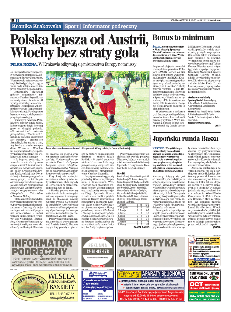 10 B SOBOTA–NIEDZIELA, 19–20 MAJA 2012 Kronika Krakowska Sport | Informator podręczny Polska lepsza od Austrii, Włochy bez straty gola Bonus to minimum ŻUŻEL. Niedzielnym meczem w Pile z Victorią, Speedway Wanda Kraków rozpocznie rundę rewanżową w II lidze. Wynik spotkania będzie niezwykle istotny dla układu tabeli. PIŁKA NOŻNA. W Krakowie odbywają się mistrzostwa Europy notariuszy FOT. WACŁAW KLAG Na Suchych Stawach rozpoczęły się wczoraj piłkarskie 27. Mistrzostwa Europy Notariuszy. Wystartowało osiem reprezentacji. Dziś od godziny 9 rozgrywane będą kolejne mecze, impreza zakończy się po południu. Uczestników przywitał główny organizator mistrzostw Czesław Szynalik, ceremonię otwarcia uświetnił występ orkiestry, a młodzież z Mszany Dolnej niosła w pocznie honorowym flagi uczestników rywalizacji. Po odegraniu hymnów wszystkich państw przystąpiono do gry. Pierwszym rywalem Polaków byli obrońcy tytułu Włosi, którzy wygrali dzięki świetnej grze w drugiej połowie. – Na ostatnich mistrzostwach przegraliśmy z Włochami 0:6, widać, że postęp w naszej grze jest wyraźny – cieszył się Szynalik, który marzy o tym, aby Polska znalazła się na podium. W meczu z Włochami na początku drugiej połowy nasi reprezentanci nie wykorzystali rzutu karnego. – Ta impreza pokazuje, że notariusze nie siedzą zamknięci w swoich kancelariach, ale dbają o aktywność fizyczną – mówi Krzysztof Maj, prezes Krakowskiej Izby Notarialnej. – Jesteśmy zorganizowaną grupą, w lokalnych ośrodkach prowadzone są zajęcia w różnych dyscyplinach sportowych. Naszym sukcesem jest rozgrywana co roku Olimpiada Notarialna w Mszanie Dolnej. Polska w mistrzostwach Europy bierze udział po raz trzeci, pierwszy raz jest ich organizatorem. – Cieszmy się, że jesteśmy w tak znakomitym gronie uczestników – mówi Tomasz Janik, prezes Krajowej Izby Notarialnej. – Staraliśmy się zapewnić naszym rywalom jak najlepsze warunki. Obiekty na Suchych Stawach Polacy bezbramkowo zremisowali z Hiszpanami, którzy należą do faworytów turnieju są idealne, bo można grać na czterech boiskach równocześnie. W Niemczech na poprzednim Euro trzeba było pokonywać spore odległości z ośrodka do ośrodka. Nasi goście są oczarowani Krakowem i zadowoleni z organizacji. Przy okazji mistrzostw, ich uczestnicy zobaczą m.in. zabytki Krakowa, obóz zagłady w Oświęcimiu, w planie znalazł się też rejs po Wiśle. – Bardzo podoba nam się w Krakowie. Zwiedzaliśmy już miasto, w planach mamy wyjazd do Wieliczki. Gramy na razie średnio, ale liczymy, że drugi dzień turnieju będzie dla nas szczęśliwszy i postaramy się o dwa zwycięstwa – powiedział zawodnik reprezentacji Czech Michal Czada. Polacy wczorajsze zmagania zakończyli zwycięstwem nad Austrią 1:0 (0:0). Bramkę dającą trzy punkty – i pierw- INFORMATOR PODRĘCZNY JEŻELI CHCECIE PAŃSTWO UMIEŚCIĆ OGŁOSZENIE Zadzwońcie: (12) 619-91-87, tel. kom. 500-044-866 Wysyłajcie maile: [email protected] REKLAMA Po pięciu kolejkach prowadzi z kompletem punktów Kolejarz RAWAG Rawicz. Za nim stawka jest bardzo wyrównana. Drugie w tabeli KSM Krosno ma 6 pkt, trzy następne drużyny, w tym krakowianie, uzbierały po 4 „oczka”. Tabelę zamyka Victoria – 2 pkt. Dodatkowo teraz walka toczyć się będzie o bonus w dwumeczu, a Speedway Wanda ma w rywalizacji z Piłą 8-punktową zaliczkę. Dla krakowian zdobycie dodatkowego punktu to plan minimum. W pierwszym spotkaniu tych drużyn, przed tygodniem, nowohucianie kontrolowali przebieg wydarzeń. W ich szeregach z bardzo dobrej strony pokazał się Czech Vaclav 1518062/00 szy w historii sukces naszej drużyny – zdobył Jakub Królak. – W dwóch poprzednich mistrzostwach Europy przegraliśmy wszystkie mecze, teraz mamy na koncie remis i wygraną – mówi uradowany Czesław Szynalik. Losy tytułu rozstrzygną się pomiędzy Włochami, Hiszpanami a Francuzami. Włochów do boju prowadzą Daniele Rossi (4 gole na koncie) oraz znakomity rozgrywający Diego Apostolo. Goście z Italii nie stracili w piątek bramki. Bardzo skuteczni są zawodnicy z Hiszpanii. Kapitan ekipy Chimo Calvo liczy na pierwsze miejsce: – Mamy przed sobą mecze z Włochami i Francją i one będą decydujące dla losów tego turnieju. To bardzo dobrze zorganizowana impreza, bardzo podoba się nam w Krakowie, macie tu dobrą kuchnię i wyborne piwo. REKLAMA 12-61-99-178 [email protected] REKLAMA 1508363/00 serwis samochodów auto myjnia przeglądy rejestracyjne ± ± KRAKÓW; UL. WIENIAWSKIEGO 61, TEL. 12 411 40 02 KRAKÓW; UL. OBROŃCÓW MODLINA 1D, TEL. 12 398 18 83 Pewnym zaskoczeniem jest słabsza niż zwykle postawa Niemców, którzy w ostatnich mistrzostwach należeli do najlepszych. Dziś rywalami Polaków będą Belgia i Niemcy. Wyniki Austria – Francja 0:1, Austria – Hiszpania 0:3, Belgia – Francja 0:2, Austria – Niemcy 1:0, Belgia – Hiszpania 0:0, Włochy – Austria 3:0, Belgia – Niemcy 2:1, Włochy – Belgia 0:2, Czechy – Francja 0:0, Czechy – Hiszpania 2:3, Niemcy – Czechy 0:5, Polska – Czechy 1:4, Włochy – Polska 0:0, Francja – Polska 1:0, Polska – Hiszpania 0:0, Niemcy – Hiszpania 5:0, Czechy – Belgia 0:1, Francja – Włochy 0:0, Polska – Austria 1:0. 1. Włochy 5 13 10–0 2. Hiszpania 5 11 11–2 3. Francja 5 11 4–0 4. Czechy 5 7 11–5 5. Belgia 5 7 3–5 6. Polska 5 4 2–7 7. Austria 5 3 1–8 8. Niemcy 5 0 1–16 PAWEŁ PANUŚ Milik junior. Debiutant wywalczył 12 punktów, walnie przyczyniając się do zwycięstwa. Znalazł się także w awizowanym składzie na rewanż. W niedzielę być może w nowych barwach wystąpi Tobias Kroner. Niemiec został w tym tygodniu wypożyczony przez Speedway Wandę (z I-ligowej Ostrovii Ostrów Wlkp.), a PZM potwierdził go do startów. Z krakowską ekipą związał się także Piotr Dziatkowiak, ale w tym przypadku nie zostały dopełnione wszystkie formalności. Awizowane skła