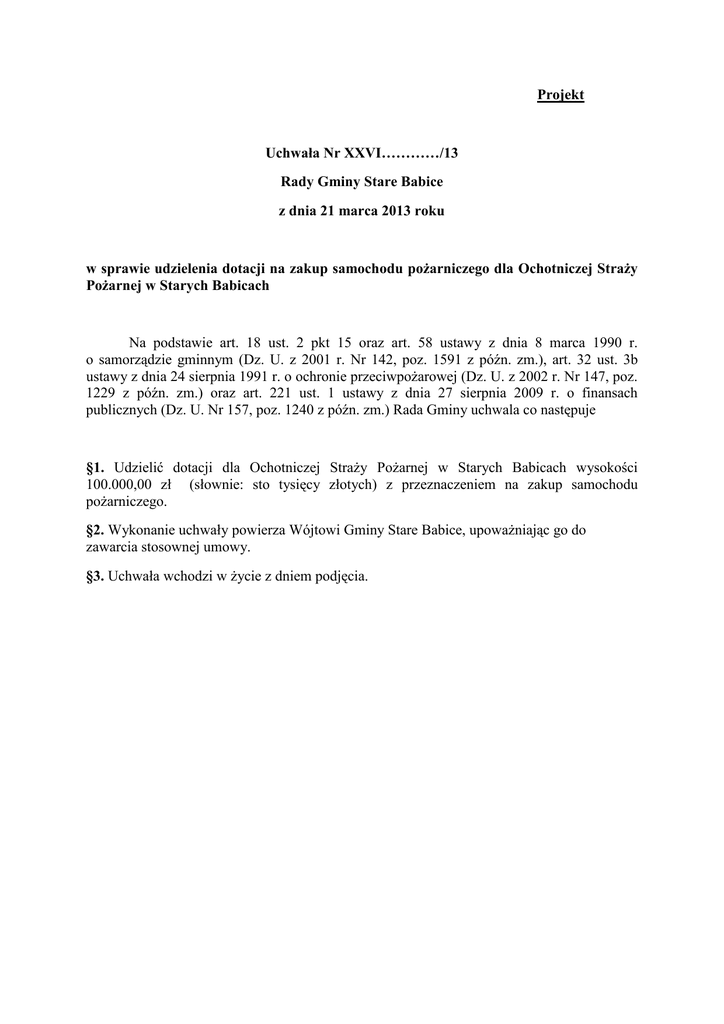 Projekt Uchwała Nr XXVI…………/13 Rady Gminy Stare Babice z dnia 21 marca 2013 roku w sprawie udzielenia dotacji na zakup samochodu pożarniczego dla Ochotniczej Straży Pożarnej w Starych Babicach Na podstawie art. 18 ust. 2 pkt 15 oraz art. 58 ustawy z dnia 8 marca 1990 r. o samorządzie gminnym (Dz. U. z 2001 r. Nr 142, poz. 1591 z późn. zm.), art. 32 ust. 3b ustawy z dnia 24 sierpnia 1991 r. o ochronie przeciwpożarowej (Dz. U. z 2002 r. Nr 147, poz. 1229 z późn. zm.) oraz art. 221 ust. 1 ustawy z dnia 27 sierpnia 2009 r. o finansach publicznych (Dz. U. Nr 157, poz. 1240 z późn. zm.) Rada Gminy uchwala co następuje §1. Udzielić dotacji dla Ochotniczej Straży Pożarnej w Starych Babicach wysokości 100.000,00 zł (słownie: sto tysięcy złotych) z przeznaczeniem na zakup samochodu pożarniczego. §2. Wykonanie uchwały powierza Wójtowi Gminy Stare Babice, upoważniając go do zawarcia stosownej umowy. §3. Uchwała wchodzi w życie z dniem podjęcia. Uzasadnienie Uchwała dotyczy dotacji dla Ochotniczej Straży Pożarnej w Starych Babicach z przeznaczeniem na zakup ciężkiego samochodu pożarniczego. Samochód ten przyczyni się do poprawy bezpieczeństwa przeciwpożarowego na terenie gminy Stare Babice. Szacunkowy koszt zakupu ww. pojazdu to kwota ok. 700 000 PLN.