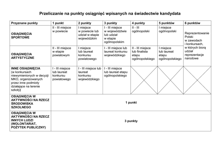 Przeliczanie na punkty osiągnięć wpisanych na świadectwie kandydata Przyznane punkty OSIĄGNIĘCIA SPORTOWE OSIĄGNIĘCIA ARTYSTYCZNE INNE OSIĄGNIĘCIA (w konkursach niewymienionych w decyzji MKO, organizowanych przez inne podmioty działające na terenie szkoły) 1 punkt II - III miejsce w powiecie 2 punkty I miejsce w powiecie lub udział w etapie wojewódzkim 3 punkty I - III miejsce w województwie lub udział w etapie ogólnopolskim 4 punkty II - III ogólnopolski 5 punktów I miejsce ogólnopolski II - III miejsce w etapie powiatowym I miejsce lub laureat konkursu powiatowego I - III miejsce lub laureat konkursu wojewódzkiego II - III miejsce lub finalista etapu ogólnopolskiego I miejsce lub laureat etapu ogólnopolskiego I - III miejsce lub laureat konkursu powiatowego I - III miejsce lub I - III miejsce laureat lub laureat etapu konkursu ogólnopolskiego wojewódzkiego OSIĄGNIĘCIA W AKTYWNOŚCI NA RZECZ ŚRODOWISKA SZKOLNEGO 1 punkt OSIĄGNIĘCIA W AKTYWNOŚCI NA RZECZ INNYCH LUDZI (WOLONTARIAT, POŻYTEK PUBLICZNY) 3 punkty 6 punktów Reprezentowanie Polski w zawodach i konkursach, w których biorą udział reprezentacje narodowe Lista dyscyplin sportu, których osiągnięcia kandydatów punktowane są w procesie rekrutacji do szkół ponadgimnazjalnych Dyscypliny indywidualne: akrobatyka sportowa, badminton, biathlon, biathlon letni, bieg na orientację, biegi przełajowe, boks, bowling sportowy, brydż sportowy, gimnastyka artystyczna, gimnastyka sportowa, jeździectwo, judo, kajakarstwo, karate tradycyjne, karate WKF, kolarstwo szosowe, kolarstwo torowe, kręglarstwo, lekkoatletyka, łucznictwo, łyżwiarstwo figurowe, łyżwiarstwo szybkie, łyżwiarstwo szybkie - short track, narciarstwo alpejskie, narciarstwo klasyczne (biegi, skoki, kombinacja norweska), pięciobój nowoczesny, pływanie, pływanie synchroniczne, podnoszenie ciężarów, saneczkarstwo, skoki do wody, snowboard, sport kartingowy, strzelectwo sportowe, szachy, szermierka, taekwon-do ITF, taekwondo WAF, taniec sportowy, tenis, tenis stołowy, triathlon, wioślarstwo, wspinaczka sportowa, zapasy styl klasyczny, zapasy styl wolny, żeglarstwo, żeglarstwo lodowe, modelarstwo kołowe. Gry zespołowe : baseball, golf, hokej na lodzie, hokej na trawie, kajak polo, koszykówka, piłka nożna, piłka ręczna, piłka siatkowa, piłka siatkowa plażowa, piłka wodna, psie zaprzęgi, rugby, unihokej. W przypadku, gdy dyscyplina sportu nie jest umieszczona w w/w załączniku, a absolwent gimnazjum legitymuje się odpowiednim dokumentem potwierdzającym uzyskanie osiągnięć sportowych, szkolne komisje rekrutacyjno-kwalifikacyjne decydują o uwzględnieniu tej dyscypliny sportu w procesie rekrutacji.