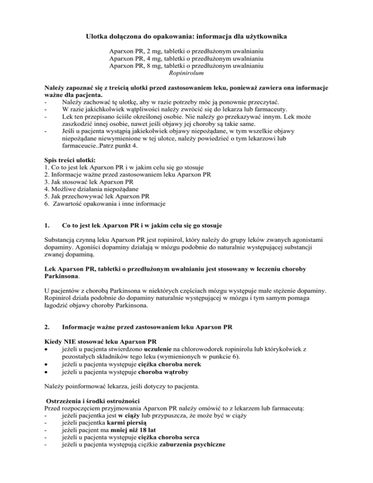 Ulotka dołączona do opakowania: informacja dla użytkownika Aparxon PR, 2 mg, tabletki o przedłużonym uwalnianiu Aparxon PR, 4 mg, tabletki o przedłużonym uwalnianiu Aparxon PR, 8 mg, tabletki o przedłużonym uwalnianiu Ropinirolum Należy zapoznać się z treścią ulotki przed zastosowaniem leku, ponieważ zawiera ona informacje ważne dla pacjenta. Należy zachować tę ulotkę, aby w razie potrzeby móc ją ponownie przeczytać. W razie jakichkolwiek wątpliwości należy zwrócić się do lekarza lub farmaceuty. Lek ten przepisano ściśle określonej osobie. Nie należy go przekazywać innym. Lek może zaszkodzić innej osobie, nawet jeśli objawy jej choroby są takie same. Jeśli u pacjenta wystąpią jakiekolwiek objawy niepożądane, w tym wszelkie objawy niepożądane niewymienione w tej ulotce, należy powiedzieć o tym lekarzowi lub farmaceucie..Patrz punkt 4. Spis treści ulotki: 1. Co to jest lek Aparxon PR i w jakim celu się go stosuje 2. Informacje ważne przed zastosowaniem leku Aparxon PR 3. Jak stosować lek Aparxon PR 4. Możliwe działania niepożądane 5. Jak przechowywać lek Aparxon PR 6. Zawartość opakowania i inne informacje 1. Co to jest lek Aparxon PR i w jakim celu się go stosuje Substancją czynną leku Aparxon PR jest ropinirol, który należy do grupy leków zwanych agonistami dopaminy. Agoniści dopaminy działają w mózgu podobnie do naturalnie występującej substancji zwanej dopaminą. Lek Aparxon PR, tabletki o przedłużonym uwalnianiu jest stosowany w leczeniu choroby Parkinsona. U pacjentów z chorobą Parkinsona w niektórych częściach mózgu występuje małe stężenie dopaminy. Ropinirol działa podobnie do dopaminy naturalnie występującej w mózgu i tym samym pomaga łagodzić objawy choroby Parkinsona. 2. Informacje ważne przed zastosowaniem leku Aparxon PR Kiedy NIE stosować leku Aparxon PR • jeżeli u pacjenta stwierdzono uczulenie na chlorowodorek ropinirolu lub którykolwiek z pozostałych składników tego leku (wymienionych w punkcie 6). • jeżeli u pacjenta występuje ciężka choroba nerek • jeżeli u pacjenta występuje choroba wątroby Należy poinformować lekarza, jeśli dotyczy to pacjenta. Ostrzeżenia i środki ostrożności Przed rozpoczęciem przyjmowania Aparxon PR należy omówić to z lekarzem lub farmaceutą: jeżeli pacjentka jest w ciąży lub przypuszcza, że może być w ciąży jeżeli pacjentka karmi piersią jeżeli pacjent ma mniej niż 18 lat jeżeli u pacjenta występuje ciężka choroba serca jeżeli u pacjenta występują ciężkie zaburzenia psychiczne - - jeżeli u pacjenta występują szczególne skłonności i (lub) zachowania (takie jak niepohamowana skłonność do gier hazardowych lub nadmierna aktywność seksualna) (patrz punkt 4 „Możliwe działania niepożądane”) jeżeli u pacjenta występuje nietolerancja cukrów (np. laktozy) Należy poinformować lekarza, jeśli dotyczy to pacjenta. Lekarz może zdecydować, że lek Aparxon PR nie jest odpowiednim lekiem dla pacjenta lub może zalecić wykonanie dodatkowych badań kontrolnych w trakcie leczenia. W czasie stosowania leku Aparxon PR Należy poinformować lekarza, jeśli pacjent lub jego opiekunowie zauważą zwiększoną skłonność lub chęć do zachowań nietypowych dla pacjenta, lub jeśli pacjent nie może powstrzymać się od wykonania pewnych czynności, w których może skrzywdzić siebie lub inną osobę. Zachowania te, nazywane zaburzeniami kontrolowania odruchów mogą dotyczyć takich zachowań jak: hazard, nadmierny apetyt, przesadne wydawanie pieniędzy, nienaturalnie wysoki popęd płciowy i wzrost zachowań i myśli seksualnych. Lekarz może zmienić dawkę lub przerwać stosowanie leku. Palenie tytoniu i stosowanie leku Aparxon PR Należy poinformować lekarza o rozpoczęciu lub zaprzestaniu palenia tytoniu podczas stosowania leku Aparxon PR. Lekarz może stwierdzić potrzebę dostosowania dawki leku. Lek Apraxon PR a inne leki Należy powiedzieć lekarzowi lub farmaceucie o wszystkich lekach przyjmowanych przez pacjenta obecnie lub ostatnio, a także o lekach, które pacjent planuje stosować. Należy pamiętać o poinformowaniu lekarza lub farmaceuty o rozpoczęciu przyjmowania jakiegokolwiek innego leku podczas stosowania leku Aparxon PR. Niektóre leki mogą mieć wpływ na działanie leku Aparxon PR lub też zwiększać ryzyko działań niepożądanych. Lek Aparxon PR może też mieć wpływ na działanie innych leków. Należy powiadomić lekarza o przyjmowaniu: fluwoksaminy (lek przeciwdepresyjny) leków stosowanych w innych zaburzeniach psychicznych, na przykład sulpirydu HTZ (hormonalna terapia zastępcza) metoklopramidu, który jest lekiem stosowanym w leczeniu nudności i zgagi antybiotyków: cyprofloksacyny i enoksacyny innych leków stosowanych w chorobie Parkinsona. Należy poinformować lekarza, jeżeli pacjent przyjmuje lub niedawno przyjmował którykolwiek z tych leków. U pacjentów, stosujących Apraxon PR z poniższymi lekami, będą wymagane dodatkowe badania krwi: • antagoniści witaminy K (stosowane w celu zmniejszenia krzepliwości krwi), takie jak warfaryna (kumadyna). Aparxon PR z jedzeniem, piciem i alkoholem Lek Aparxon PR może być przyjmowany z jedzeniem lub niezależnie od posiłków. Spożywanie alkoholu z jednoczesnym przyjmowaniem leku Aparxon PR nie jest wskazane. Ciąża i karmienie piersią Jeśli pacjentka jest w ciąży lub karmi piersią, przypuszcza że może być w ciąży lub gdy planuje mieć dziecko, powinna poradzić się lekarza lub farmaceuty przed zastosowaniem tego leku. Aparxon PR nie jest zalecany do stosowania w czasie ciąży, chyba że lekarz stwierdzi, że zastosowanie leku Aparxon PR spowoduje korzyść dla pacjentki przeważającą nad ryzykiem dla nienarodzonego dziecka. Aparxon PR nie jest zalecany do stosowania w czasie karmienia piersią, ponieważ może mieć wpływ na wytwarzanie mleka przez pacjentkę. Lekarz udzieli porady, jeżeli p