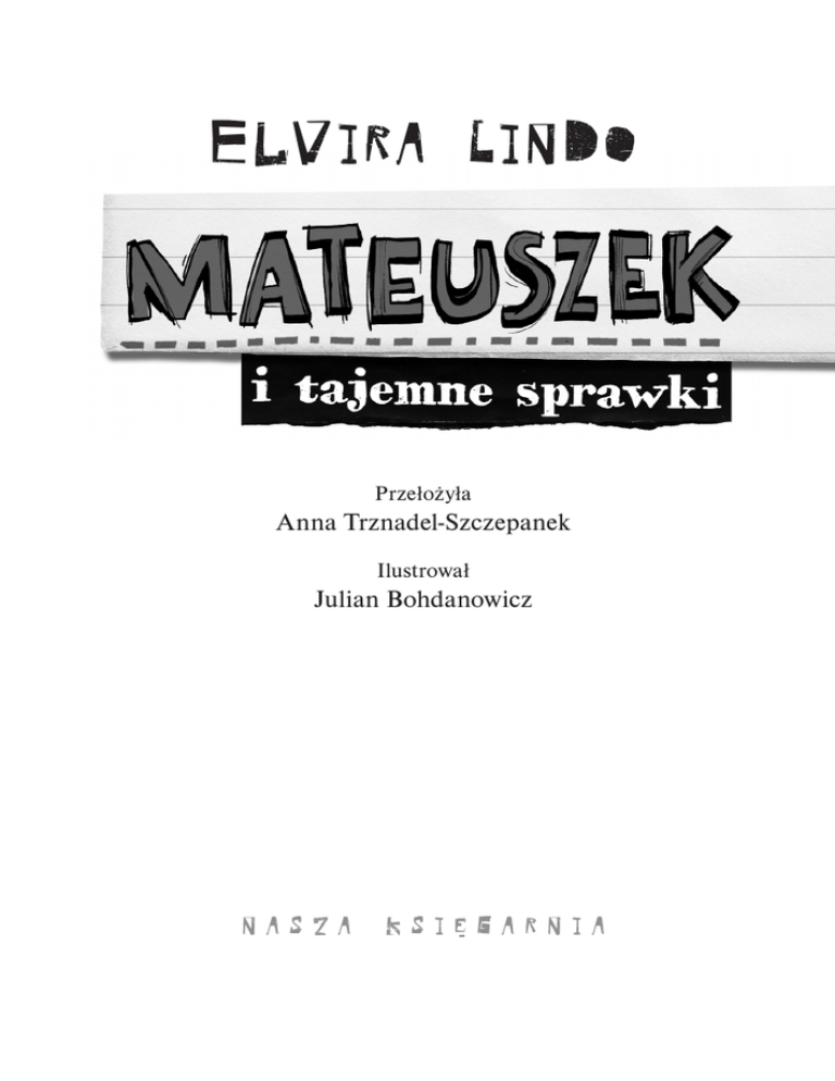 Elvira Lindo Przełożyła Anna Trznadel-Szczepanek Ilustrował Julian Bohdanowicz nasza ksiegarnia Tytuł oryginału hiszpańskiego Los trapos sucios © 1997 by Elvira Lindo © Copyright for the Polish edition by Wydawnictwo „Nasza Księgarnia”, Warszawa 2003 Projekt okładki Maciej Szymanowicz www.maszynowicz.com Ilustracja na okładce Julian Bohdanowicz ROZDZIAŁ PIERWSZY Tajemne sprawki Któregoś dnia mama Diego Maradony oznajmiła mojej mamie w sklepie mięsnym: — Diego mówi, że jak mu kupię przenośny komputer, to opisze swoje życie. W końcu to, o czym opowiada twój Mateuszek, mogło się przydarzyć każdemu. — Bardzo dobrze, ale musisz być przygotowana na to, że twój syn się podpisze — i to wielkimi literami — Diego Maradona. Mój Mateuszek ujawnił na samym początku, że mówią na niego Okularnik. — Wykluczone! On się nazywa Diego Sandoval. Na to mama jej zasunęła: — Ale sama przyznasz, że nikt w Carabanchel (Górnym) nie wie, kto to jest Diego Sandoval. I wszystkie panie powtórzyły chórem: — Sama przyznasz, sama przyznasz! Tak to już jest na naszym osiedlu: tu nikt nikogo nie oszuka, bo uwielbiamy rąbać sobie prawdę prosto w oczy. Mój kolega Diego Maradona nigdy nie opisze swojego życia, bo mama mu nie pozwoli zacząć autobiografii słowami: „Nazywam się Diego Sandoval, ale wszyscy koledzy mówią na mnie Diego Maradona, bo moje imię kojarzy im się z nazwiskiem sławnego piłkarza”. A poza tym trzeba mieć dużo odwagi, żeby napisać autobiografię. Kiedy ukazuje się kolejny tom wielkiej encyklopedii mojego życia, jestem okropnie zawstydzony, bo zdradzam w nim nasze najskrytsze tajemnice. Nie tylko ja to przeżywam; mamie też jest łyso, kiedy pan Marcin ze sklepu rybnego mówi: — Pani Kasiu, czy pani nie przesadza z tymi kuksańcami? Mateuszkowi gorzej przez to idzie w szkole. — Tak jest — wtrąca się jakaś pani. — Ja, jak już muszę mojemu synowi przylać, daję mu w tyłek i zawsze kapciem, żeby nie skrzywdzić ani jego, ani siebie. Kelnerzy pytają mojego tatę w barach przy autostradzie: — Mateusz, to ile jeszcze musisz zapłacić za tę ciężarówkę? Pani Lusia też wolałaby nie rozgłaszać na prawo i lewo, że pan Barnaba puszcza bąki i nosi perukę. Mama próbuje ją udobruchać: — Moja droga, przecież i tak wszyscy wiedzą, że nosi perukę, bo ta, którą wkłada w niedzielę, jest innego koloru. A co do bąków… każdy z nas… A dziadkowi wisi, że wypaplałem wszystkie jego sekrety. — Ja tam przed nikim nie ukrywam, że mam sztuczną szczękę, choruję na prostatę, chrapię, aż się szyby w oknie trzęsą, i przesiaduję po całych dniach w barze. Odkąd staruszki z Klubu Emeryta wiedzą o moich wadach, lgną do mnie jak muchy. Od razu urosłem w ich oczach, kiedy przestały mnie uważać za chodzącą doskonałość. Głupek też jest zadowolony, nie spodobało mu się tylko to, że w drugim tomie ujawniłem jego prawdziwe imię. Najchętniej pozostałby typowym czterolatkiem po siadającym jakąś tajemnicę. Ale nawet gdyby Diego Maradona opisał na przenoś nym komputerze najbardziej wstydliwe szczegóły ze swo11 jego życia, i tak nic by mu z tego nie przyszło. Najprawdziwsza prawda jest taka, że to, co czytasz, nie zostało napisane przeze mnie, tylko przez kobietę, której nazwisko możesz przeczytać na stronie tytułowej tej książki. Poznałem ją wiele lat temu. Po całej kuli ziemskiej szukała odpowiedniego dziecka i w końcu wybrała mnie. Przyszła do nas do domu, postawiła na stole magnetofon kasetowy i zaczęła mnie bezlitośnie wypytywać. Podczas gdy ja mówiłem, ona objadała się rogalikami z czekoladą, które mama kupiła w spożywczym pani Pelagii. Mama i pani Lusia obserwowały ją ukradkiem. Kiedy wyszła, pani Lusia orzekła: — Niezły ma apetyt! Opowiedziałem tej pani mnóstwo rzeczy, również ta kich, o których — według mamy — nie powinno się ni komu mówić. Ma to swoją dobrą stronę, bo rodzina García Moreno jest teraz znana na całym świecie, ale ma też i złą: nic na tym nie zyskaliśmy, ponieważ ta kobieta nie zapłaciła nam złamanego grosza, chociaż opływa podobno w luksusy dzięki dolarom, które zgarnęła za moje historyjki. Niedawno do nas zadzwoniła. Mama powiedziała: — Zaraz tu będzie. Znowu napcha sobie kieszenie. Tym razem poszliśmy do baru. Mama, pani Lusia, dziadek, Głupek i ja… Pośrodku stołu jak zwykle stanął magnetofon kasetowy. Kobieta ze strony tytułowej spytała mamę i panią Lusię, czy mogłyby usiąść przy innym stoliku. 12 — Żeby dzieciak się nie krępował… Kiedy zostaliśmy sami, twarzą w twarz, kobieta oznajmiła mi, że tym razem muszę odsłonić najbardziej osobiste szczegóły z życia mojej rodziny i znajomych, ponieważ nasze historyjki rywalizują z telewizyjnymi reality show, z filmami seksu i przemocy, z dreszczowcami. — Musisz mi opowiedzieć o wszystkich waszych tajemnych sprawkach. — Dobrze, ale pod jednym warunkiem… — Jakim? Zrobię wszystko, czego zażądasz — oświadczyła kobieta. Napięcie sięgnęło szczytu. 13 — Moje imię ma być wypisane na stronie tytułowej wielkimi literami, a twoje malutkimi, tak żeby ludzie myśleli, że to ja napisałem tę książkę. To albo nic. Zastanawiała się nad tym przez pięć przeklętych minut. — No dobrze, zgoda. Poprosiłem ją też, żeby moje imię zapalało się i gasło jak neon, ale odparła, że to jest technicznie niewykonalne. W tym momencie pociągnąłem spory łyk mojej drugiej whisky (to znaczy drugiej coca–coli) i zacząłem jej opowiadać o tych wydarzeniach z mojego życia, które dotychczas nigdy nie przekroczyły granic Carabanchel (Górnego) i które masz w tej chwili przed oczami. Dziadek szepnął mi na pociechę: — Nie przejmuj się, Mateuszku, nie znam takiej rodziny, która nie miałaby czegoś do ukrycia. Kobieta poszła sobie razem z magnetofonem i po pewnym czasie przy