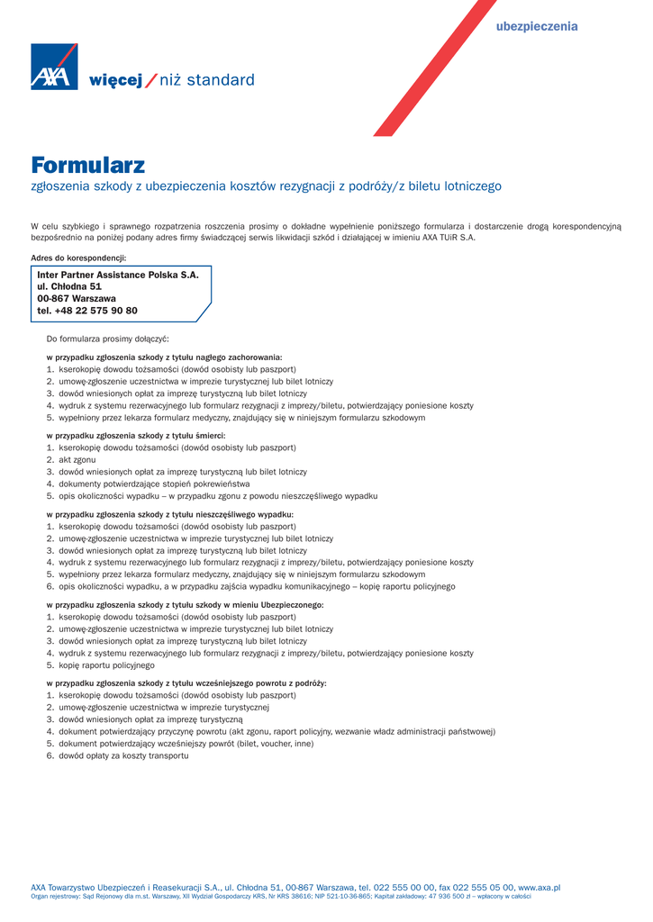 ubezpieczenia Formularz zgłoszenia szkody z ubezpieczenia kosztów rezygnacji z podróży/z biletu lotniczego W celu szybkiego i sprawnego rozpatrzenia roszczenia prosimy o dokładne wypełnienie poniższego formularza i dostarczenie drogą korespondencyjną bezpośrednio na poniżej podany adres firmy świadczącej serwis likwidacji szkód i działającej w imieniu AXA TUiR S.A. Adres do korespondencji: Inter Partner Assistance Polska S.A. ul. Chłodna 51 00-867 Warszawa tel. +48 22 575 90 80 Do formularza prosimy dołączyć: w przypadku zgłoszenia szkody z tytułu nagłego zachorowania: 1. kserokopię dowodu tożsamości (dowód osobisty lub paszport) 2. umowę-zgłoszenie uczestnictwa w imprezie turystycznej lub bilet lotniczy 3. dowód wniesionych opłat za imprezę turystyczną lub bilet lotniczy 4. wydruk z systemu rezerwacyjnego lub formularz rezygnacji z imprezy/biletu, potwierdzający poniesione koszty 5. wypełniony przez lekarza formularz medyczny, znajdujący się w niniejszym formularzu szkodowym w przypadku zgłoszenia szkody z tytułu śmierci: 1. kserokopię dowodu tożsamości (dowód osobisty lub paszport) 2. akt zgonu 3. dowód wniesionych opłat za imprezę turystyczną lub bilet lotniczy 4. dokumenty potwierdzające stopień pokrewieństwa 5. opis okoliczności wypadku – w przypadku zgonu z powodu nieszczęśliwego wypadku w przypadku zgłoszenia szkody z tytułu nieszczęśliwego wypadku: 1. kserokopię dowodu tożsamości (dowód osobisty lub paszport) 2. umowę-zgłoszenie uczestnictwa w imprezie turystycznej lub bilet lotniczy 3. dowód wniesionych opłat za imprezę turystyczną lub bilet lotniczy 4. wydruk z systemu rezerwacyjnego lub formularz rezygnacji z imprezy/biletu, potwierdzający poniesione koszty 5. wypełniony przez lekarza formularz medyczny, znajdujący się w niniejszym formularzu szkodowym 6. opis okoliczności wypadku, a w przypadku zajścia wypadku komunikacyjnego – kopię raportu policyjnego w przypadku zgłoszenia szkody z tytułu szkody w mieniu Ubezpieczonego: 1. kserokopię dowodu tożsamości (dowód osobisty lub paszport) 2. umowę-zgłoszenie uczestnictwa w imprezie turystycznej lub bilet lotniczy 3. dowód wniesionych opłat za imprezę turystyczną lub bilet lotniczy 4. wydruk z systemu rezerwacyjnego lub formularz rezygnacji z imprezy/biletu, potwierdzający poniesione koszty 5. kopię raportu policyjnego w przypadku zgłoszenia szkody z tytułu wcześniejszego powrotu z podróży: 1. kserokopię dowodu tożsamości (dowód osobisty lub paszport) 2. umowę-zgłoszenie uczestnictwa w imprezie turystycznej 3. dowód wniesionych opłat za imprezę turystyczną 4. dokument potwierdzający przyczynę powrotu (akt zgonu, raport policyjny, wezwanie władz administracji państwowej) 5. dokument potwierdzający wcześniejszy powrót (bilet, voucher, inne) 6. dowód opłaty za koszty transportu AXA Towarzystwo Ubezpieczeń i Reasekuracji S.A., ul. Chłodna 51, 00-867 Warszawa, tel. 022 555 00 00, fax 022 555 05 00, www.axa.pl Organ rejestrowy: Sąd Rejonowy dla m.st. Warszawy, XII Wydział Gospodarczy KRS, Nr KRS 38616; NIP 521-10-36-865; Kapitał zakładowy: 47 936 500 zł – wpłacony w całości A. INFORMACJE OGÓLNE 1. Nazwisko i imię osoby zgłaszającej (lub opiekuna prawnego) 2. Telefon kontaktowy 3. Nazwisko i imię osoby ubezpieczonej 4. Adres Miejscowość Telefon komórkowy Kod pocztowy Ulica / Numer domu/lokalu Ulica / Numer domu/lokalu Telefon stacjonarny 5. Adres do korespondencji Miejscowość Kod pocztowy 6. Adres e-mail Czy wyraża Pan/Pani zgodę, aby korespondencja była wysyłana do Pana/Pani również drogą elektroniczną? tak nie 7. Nr PESEL 8. Numer rachunku bankowego Beneficjenta, na którego rzecz ma zostać wypłacone odszkodowanie 9. Nazwa banku 10. Nazwisko i imię właściciela rachunku 11. Numer polisy/rezerwacji podróży 12. Data i miejsce wykupienia polisy (dotyczy polis indywidualnych) 13. Nazwa biura podróży – organizatora podróży (dotyczy polis grupowych w ramach umów z organizatorami turystycznymi) 14. Nazwa, telefon i adres biura podróży, w którym wykupiono imprezę/bilet, nazwisko osoby do kontaktu 15. W jaki sposób dokonano rezerwacji/podpisano umowę: osobiście (lub przez inne osoby) w biurze podróży przez Internet (umowę dostarczono pocztą) inna forma (jaka?) przez telefon (umowę dostarczono pocztą) 16. Dane dotyczące wszystkich osób, które anulowały podróż: Nazwisko i imię Data urodzenia D D M M R R R R D D M M R R R R D D M M R R R R D D M M R R R R D D M M R R R R 2 B. INFORMACJE DOTYCZĄCE PODRÓŻY Data rezerwacji podróży/biletu Planowana data rozpoczęcia podróży D D M M R R R R D D M M R R R R Planowana data zakończenia podróży D D M M R R R R Nazwa przewoźnika (dotyczy rezygnacji z biletu) C. DANE DOTYCZĄCE SZKODY 1. Powód rezygnacji/wcześniejszego powrotu a. medyczny nagłe zachorowanie śmierć nieszczęśliwy wypadek przedwczesny poród b. szkoda w mieniu kradzież z włamaniem lub rabunek pożar inne (jakie?) 2. Czy zdarzenie powstało wskutek: przestępstwa samobójstwa wykonywania pracy fizycznej wyczynowego uprawiania sportu innej przyczyny (jakiej?) 3. Dane osoby, przez którą powstała szkoda z ubezpieczenia kosztów rezygnacji Czy Ubezpieczony jest osobą towarzyszącą w podróży? Nazwisko i imię: Czy Ubezpieczony jest osobą bliską? Nazwisko i imię: tak nie tak nie Stopień pokrewieństwa (proszę załączyć kopię dokumentu potwierdzającego pokrewieństwo) 4. Data zajścia zdarzenia zmuszającego do rezygnacji z podróży/wcześniejszego powrotu Data zajścia szkody D D M M R R R R Data zgłoszenia rezygnacji organizatorowi/przewoźnikowi D D M M R R R R a. Opłaty związane z rezygnacją z podróży waluta kwota waluta kwota wysokość potrąceń naliczonych przez organizatora/przewoźnika b. Opłaty związane z wcześniejszym powrotem z podróży koszt zakupu biletu powrotnego D. ZAŁĄCZNIKI Potwierdzenia wykupienia polisy lub