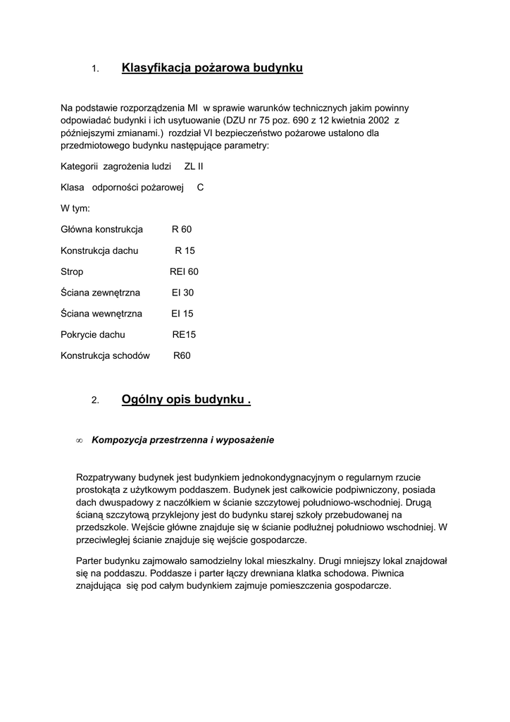 1. Klasyfikacja pożarowa budynku Na podstawie rozporządzenia MI w sprawie warunków technicznych jakim powinny odpowiadać budynki i ich usytuowanie (DZU nr 75 poz. 690 z 12 kwietnia 2002 z późniejszymi zmianami.) rozdział VI bezpieczeństwo pożarowe ustalono dla przedmiotowego budynku następujące parametry: Kategorii zagrożenia ludzi ZL II Klasa odporności pożarowej C W tym: Główna konstrukcja Konstrukcja dachu R 60 R 15 Strop REI 60 Ściana zewnętrzna EI 30 Ściana wewnętrzna EI 15 Pokrycie dachu RE15 Konstrukcja schodów R60 2. • Ogólny opis budynku . Kompozycja przestrzenna i wyposażenie Rozpatrywany budynek jest budynkiem jednokondygnacyjnym o regularnym rzucie prostokąta z użytkowym poddaszem. Budynek jest całkowicie podpiwniczony, posiada dach dwuspadowy z naczółkiem w ścianie szczytowej południowo-wschodniej. Drugą ścianą szczytową przyklejony jest do budynku starej szkoły przebudowanej na przedszkole. Wejście główne znajduje się w ścianie podłużnej południowo wschodniej. W przeciwległej ścianie znajduje się wejście gospodarcze. Parter budynku zajmowało samodzielny lokal mieszkalny. Drugi mniejszy lokal znajdował się na poddaszu. Poddasze i parter łączy drewniana klatka schodowa. Piwnica znajdująca się pod całym budynkiem zajmuje pomieszczenia gospodarcze. Konstrukcja budynku Budynek wykonany jest w konstrukcji tradycyjnej murowanej ze stropem między-piętrowym drewnianym belkowymi ze ślepym pułapem i stropem żelbetowym na belkach stalowych nad piwnicą. Fundamenty: Fundamenty budynku betonowe 60x40cm pod głównymi ścianami nośnymi i o 50x40cm pod ścianami drugorzędnymi. Ściany nośne: Ściany piwniczne ceglane -zewnętrzne -51cm, wewnętrzne -25cm, działowe -12cm, Ściany parteru ceglane zewnętrzne 38cm, wewnętrzne – 25cm, Ściany poddasza z cegły pełnej – 25cm i 12cm, Stropy: Strop nad piwnicą żelbetowy na belkach stalowych , strop nad parterem wykonany jest jako drewniany belkowy ze ślepym pułapem. Dach: Konstrukcja dachu drewniana płatwiowo – kleszczowa z pojedynczymi jętkami i wieszarami. Wykończenia i wyposażenie. Dach Pokrycie dachu dachówką karpiówką w koronkę z folią paro[przepuszczalną pod łatami. Podłogi: Na większości powierzchni budynku występują podłogi drewniane deskowe. W pomieszczeniach kuchni i sanitarnych wykonane z płytek ceramicznych. Schody: Klatka schodowa dwubiegowa drewniana Tynki i okładziny: Tynki zewnętrze cementowo-wapienne. Tynki wewnętrzne wapienne Okładziny z płytek ceramicznych w pomieszczeniach socjalnych i kuchennych. Stolarka Okna drewniane Drzwi zewnętrzne drewniane Drzwi wewnętrzne drewniane. Instalacje Budynek wyposażony jest w podstawowe instalacje potrzebne do jego funkcjonowania wymienione w punkcie 4. 3. Ocena stanu technicznego budynku Architektura - wygląd zewnętrzny Elewacje Wygląd zewnętrzny budynku w miarę dobry wymagający jednak kosmetyki i odmalowania. Dach Konstrukcja dachu drewniana krokwiowo-płatwiowa z wieszarami w trzech polach Jest w dobrym stanie technicznym. Konstrukcja nie jest osłonięta o nie zabezpieczona pożarowo. Konstrukcja dachu nie spełnia wymagań R30 Pokrycie dachu Pokrycie dachu wykonane przy zastosowaniu dachówki karpiówki w koronkę. Pod łatami zastosowano folię dachową paro-przepuszczalną. Przekrycie dachu spełnia REI15 Wykończenia: Tynki wewnętrzne są w dobrym stanie technicznym. Elewacja tynk cementowo-wapienny nakrapiany - konieczne odnowienie. Elewacja budynku ma wstawki klinkierowe na narożach przy cokole oraz przy otworach okiennych drzwiowych. Otoczenie budynku: Otoczenie budynku jest zagospodarowane w stopniu umożliwiającym użytkowanie. Fundamenty Stan techniczny fundamentów określono poprzez oględziny ścian piwnicznych oraz na podstawie odkrywki zewnętrznej. Fundamenty wykonane są jako ławy żelbetowe o wymiarach powyżej. Ściany piwniczne: W segmencie ściany piwniczne wykonano z cegły na zaprawie cementowo-wapiennej. Ściany mają grubość 51 i 25cm i są w dobrym stanie technicznym. Na ścianach nie ma śladów pęknięć ani zawilgocenia. Nie wymagają klasyfikacji pożarowej • Piwnica: Piwnice budynku o wysokości 2.0m w świetle są suche i dobrze utrzymane. • Ściany części nadziemnej Ściany nośne i działowe murowane z cegły znajdują się w dobrym stanie technicznym i nie wykazują uszkodzeń eksploatacyjnych ani uszkodzeń wynikłych z deformacji podłoża. Ściany nie są zawilgocone nadproża nad otworami okiennymi drzwiowymi są bez zastrzeżeń. Ściany zewnętrzne i wewnętrzne spełniają warunki EI 60 • Strop: Strop nad piwnicą wykonany jest jako żelbetowy na belkach stalowych. Strop poddasza wykonany jest w konstrukcji drewnianej . Belki o przekroju 18x20 ślepym pułapem, podsufitką i podłogą drewnianą. Sufity wykończone tynkiem wapiennym. Strop nad parterem nie spełnia wymagań REI 60 , konieczne jest dostosowanie stropu do REI 60. 4. Dostosowanie stropu do REI 60 Strop nad parterem Strop nad drugim piętrem wymaga przebudowy ze względu na zwiększone obciążenia stropu strychowego oraz na nadanie mu odporności ogniowej do stopnia REI 60. Dostosowanie stropu do wymagań przepisów pożarowych osiągnięte będzie przez: Zdjęcie podłogi poddasza, polepy i ślepego pułapu, oczyszczenie belek drewnianych stropu i zabezpieczenie ich preparatem ogniochronnym „POLICHRON DREW” według instrukcji producenta. Na zabezpieczonych belkach drewnianych ułożona będzie zagruntowana do NRO płyta OSB grub. 18mm a następnie płyta jastrychowa Fermacel grub 25mm. Płyta fermacel będzie bezpośrednim podkładem pod posadzkę właściwą. Sufit stropu parterowego osłonięty będzie dodatkowo płytą gipsową ognioodporną GKF grub. 12.5mm. 5. Dostosowanie konstrukcji dachu REI 15 Dla osiągnięcia stopnia REI 30 jest zastosowane oraz będzie wykonane: Pokrycie istniejące dachu dachówką karpiówką podwójną . Pod dachówką zas