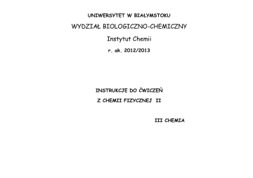UNIWERSYTET W BIAŁYMSTOKU WYDZIAŁ BIOLOGICZNO-CHEMICZNY Instytut Chemii r. ak. 2012/2013 INSTRUKCJE DO ĆWICZEŃ Z CHEMII FIZYCZNEJ II III CHEMIA ĆWICZENIE 1 ADSORPCJA KWASU ETANOWEGO NA WĘGLU AKTYWNYM WYMAGANIA - zjawiska zachodzące na granicy faz ciecz-gaz, ciecz-ciało stałe, gaz-ciało stałe - adsorpcja fizyczna i chemiczna - czynniki wpływające na szybkość adsorpcji - założenia teorii adsorpcji (Langmuir, Polanyi) - adsorpcja z roztworu: Langmuira, Freundlicha - praktyczne wykorzystanie zjawiska adsorpcji; nadmiar powierzchniowy - rodzaje adsorbentów i ich struktura - węgiel aktywny – otrzymywanie, zastosowanie, powierzchnia właściwa - sprawdzenie stosowalności równania Freundlicha i Langmuira do opisu adsorpcji z roztworu na ciele stałym, obliczanie wartości stałych występujących w tych równaniach. LITERATURA 1. Ościk J., Adsorpcja, PWN, Warszawa 1979. 2. Praca zbiorowa, Chemia fizyczna, PWN, Warszawa 1980. 3. Sobczyk L., Kisza A., Chemia fizyczna dla przyrodników, PWN, Warszawa 1981. 4. Drapała T., Chemia fizyczna z zadaniami, PWN, Warszawa 1982. 5. Chemia fizyczna. Podręcznik dla studentów farmacji i analityki medycznej. PZWL,W-wa 2007. CZĘŚĆ TEORETYCZNA Centrami są różnego rodzaju zagłębienia, kanaliki itd, w których stosunkowo słabe siły międzycząsteczkowe nakładają się na siebie. Struktura kanalikowa (np. w węglu aktywnym) sprzyja nie tylko rozwinięciu powierzchni, lecz także znacznemu wzrostowi powierzchniowej gęstości centrów aktywnych. Dla orientacji można dodać, że powierzchnia rzeczywista 1g węgla aktywnego wynosi 500m2. Innymi silnymi adsorbentami są ziemia okrzemkowa i żel krzemionkowy. Jeżeli siły wiążące adsorbat na powierzchni adsorbentu mają naturę wiązania chemicznego (tzn. są realizowane z udziałem elektronów), mamy do czynienia z adsorpcją chemiczną (chemisorpcją). Centrami aktywnymi są różne wypukłości, krawędzie, naroża itd., gdzie znajdujące się atomy, cząsteczki lub jony nie mają w pełni wysyconych wiązań. Chemisorpcja nie jest jednak reakcją chemiczną. Zaadsorbowana cząsteczka w zasadzie zachowuje swoją tożsamość. Ulega jedynie pewnym naprężeniom, co osłabia w niej wiązania i zwiększa jej reaktywność (obniża barierę energetyczną reakcji). Może to mieć związek z katalitycznym działaniem niektórych ciał stałych. Adsorpcja z roztworu na powierzchni ciała stałego jest procesem bardziej złożonym od adsorpcji gazów. Wielkość adsorpcji zależy w tym przypadku nie tylko od oddziaływań pomiędzy adsorbentem a każdym ze składników roztworu, ale także od wzajemnych oddziaływań między cząsteczkami składników roztworu. Substancja rozpuszczona tym silniej się adsorbuje, im gorzej rozpuszcza się w danym rozpuszczalniku. O ilości zaadsorbowanego rozpuszczalnika decyduje jego zdolność zwilżania adsorbenta, np. woda źle zwilża węgiel aktywny i dlatego z roztworu wodnego adsorbuje się głównie substancja rozpuszczona. Przy zmianie stężenia zachodzi wypieranie cząsteczek jednego składnika z warstwy adsorpcyjnej przez cząsteczki drugiego składnika. Teoria adsorpcji na tej granicy faz nie jest jeszcze opracowana i zazwyczaj do opisu adsorpcji stosuje się empiryczne równanie podane przez Freundlicha: 1 x k c n m Celem ćwiczenia jest wyznaczenie izotermy adsorpcji kwasu octowego na węglu aktywnym oraz wyznaczenie powierzchni właściwej adsorbenta. Adsorpcja może zachodzić zarówno na powierzchni cieczy, jak i na powierzchni ciała stałego i chociaż jej mechanizmy w obydwu przypadkach są różne, to jednak w każdym prowadzi ona do zagęszczenia substancji na danej powierzchni. Znaczenie praktyczne ma adsorpcja gazu lub cieczy na powierzchni ciała stałego. Adsorpcja na powierzchni cieczy pozwala lepiej zrozumieć przyczyny powstawania emulsji lub zmianę napięcia powierzchniowego cieczy przez substancje powierzchniowo czynne. Adsorpcja jest to zjawisko gromadzenia się substancji (gazu, pary, składnika roztworu) na powierzchni ciała stałego. W praktyce często zachodzi ona jednocześnie z absorpcją, która polega na pochłanianiu danej substancji przez całą objętość ciała stałego. Oba zjawiska nazywa się sorpcją. Substancja adsorbująca nosi nazwę adsorbentu, zaś adsorbowana - adsorbatu. W zależności od rodzaju sił powodujących proces rozróżnia się adsorpcję fizyczną i chemisorpcję. Adsorpcja fizyczna zachodzi wskutek działania przyciągania międzycząsteczkowego (sił Van der Waalsa). Cząsteczki na powierzchni ciała stałego mają tylko częściowo wysycone siły przyciągania międzycząsteczkowego. W rezultacie ciało stałe może gromadzić na swojej powierzchni cząsteczki adsorbatu. Oczywiście im większa powierzchnia, tym adsorbuje się na niej większa ilość substancji. Różnego rodzaju pęknięcia, pory, kanaliki itp. zwiększają znacznie powierzchnię adsorbenta. W adsorpcji nie uczestniczy jednak cała powierzchnia adsorbentu, lecz tylko pewne jej obszary, zwane centrami aktywnymi, w których działające siły są szczególnie duże. 1 lub nkwas k c n [1] gdzie: x oznacza masę substancji zaadsorbowanej z roztworu przez m gramów adsorbentu pozostającego w równowadze z roztworem o stężeniu c, zaś k, n - wartości stałe charakterystyczne dla danego adsorbenta (węgiel aktywny) i adsorbatu (kwas etanowy). W celu sprawdzenia, czy wyniki doświadczalne spełniają równanie Freundlicha, wykorzystuje się logarytmiczną postać tego równania: log nkwas log k 1 log c n [2] i bada, czy wykres log(nkwas)=f(logc) ma przebieg prostoliniowy. Parametry tej prostej pozwalają obliczyć stałe k i n w równaniu Freundlicha. Wykres izotermy Freundlicha przypomina wykres izotermy Langmuira, różniąc się jednak od niego brakiem proporcjonalności pomiędzy ilością zaadsorbowanej substancji a jej stężeniem w zakresie małych stężeń. Izoterma adsorpcji Langmuira w przypadku adsorpc