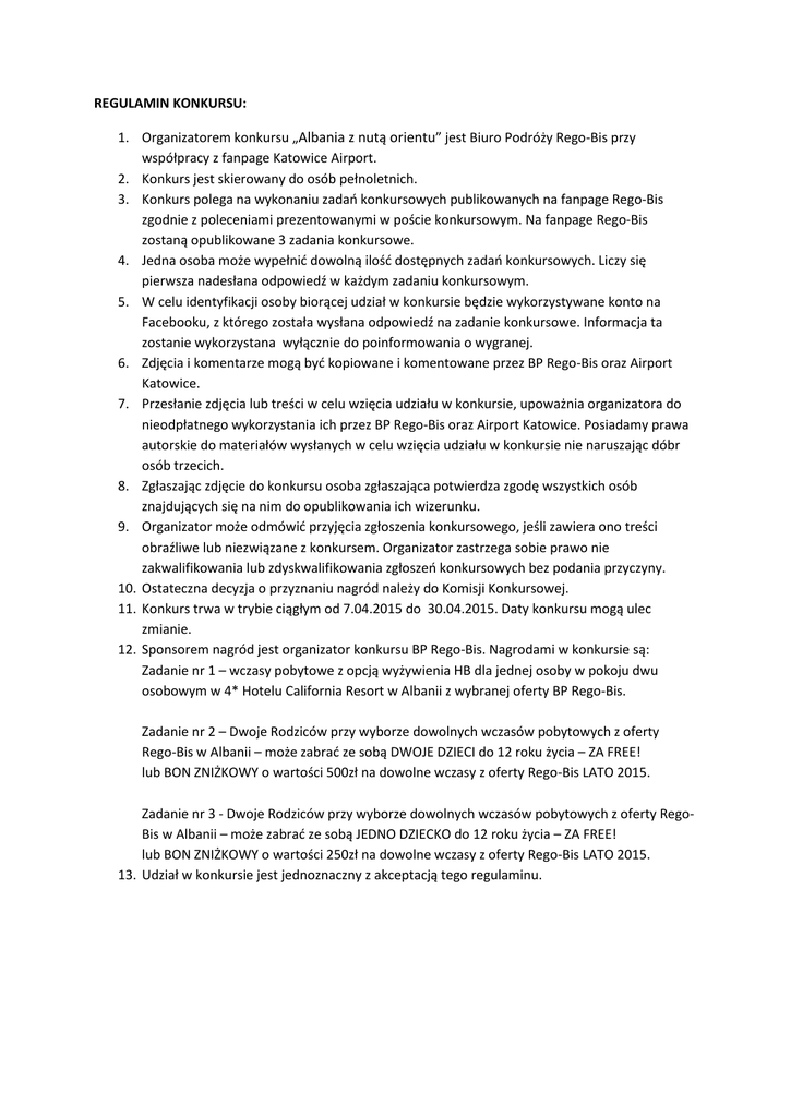 REGULAMIN KONKURSU: 1. Organizatorem konkursu „Albania z nutą orientu” jest Biuro Podróży Rego-Bis przy współpracy z fanpage Katowice Airport. 2. Konkurs jest skierowany do osób pełnoletnich. 3. Konkurs polega na wykonaniu zadań konkursowych publikowanych na fanpage Rego-Bis zgodnie z poleceniami prezentowanymi w poście konkursowym. Na fanpage Rego-Bis zostaną opublikowane 3 zadania konkursowe. 4. Jedna osoba może wypełnić dowolną ilość dostępnych zadań konkursowych. Liczy się pierwsza nadesłana odpowiedź w każdym zadaniu konkursowym. 5. W celu identyfikacji osoby biorącej udział w konkursie będzie wykorzystywane konto na Facebooku, z którego została wysłana odpowiedź na zadanie konkursowe. Informacja ta zostanie wykorzystana wyłącznie do poinformowania o wygranej. 6. Zdjęcia i komentarze mogą być kopiowane i komentowane przez BP Rego-Bis oraz Airport Katowice. 7. Przesłanie zdjęcia lub treści w celu wzięcia udziału w konkursie, upoważnia organizatora do nieodpłatnego wykorzystania ich przez BP Rego-Bis oraz Airport Katowice. Posiadamy prawa autorskie do materiałów wysłanych w celu wzięcia udziału w konkursie nie naruszając dóbr osób trzecich. 8. Zgłaszając zdjęcie do konkursu osoba zgłaszająca potwierdza zgodę wszystkich osób znajdujących się na nim do opublikowania ich wizerunku. 9. Organizator może odmówić przyjęcia zgłoszenia konkursowego, jeśli zawiera ono treści obraźliwe lub niezwiązane z konkursem. Organizator zastrzega sobie prawo nie zakwalifikowania lub zdyskwalifikowania zgłoszeń konkursowych bez podania przyczyny. 10. Ostateczna decyzja o przyznaniu nagród należy do Komisji Konkursowej. 11. Konkurs trwa w trybie ciągłym od 7.04.2015 do 30.04.2015. Daty konkursu mogą ulec zmianie. 12. Sponsorem nagród jest organizator konkursu BP Rego-Bis. Nagrodami w konkursie są: Zadanie nr 1 – wczasy pobytowe z opcją wyżywienia HB dla jednej osoby w pokoju dwu osobowym w 4* Hotelu California Resort w Albanii z wybranej oferty BP Rego-Bis. Zadanie nr 2 – Dwoje Rodziców przy wyborze dowolnych wczasów pobytowych z oferty Rego-Bis w Albanii – może zabrać ze sobą DWOJE DZIECI do 12 roku życia – ZA FREE! lub BON ZNIŻKOWY o wartości 500zł na dowolne wczasy z oferty Rego-Bis LATO 2015. Zadanie nr 3 - Dwoje Rodziców przy wyborze dowolnych wczasów pobytowych z oferty RegoBis w Albanii – może zabrać ze sobą JEDNO DZIECKO do 12 roku życia – ZA FREE! lub BON ZNIŻKOWY o wartości 250zł na dowolne wczasy z oferty Rego-Bis LATO 2015. 13. Udział w konkursie jest jednoznaczny z akceptacją tego regulaminu.