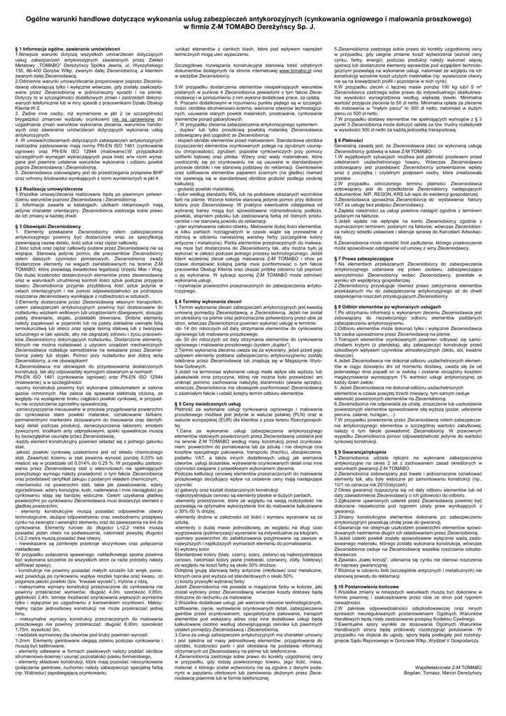 Ogólne warunki handlowe dotyczące wykonania usług zabezpieczeń antykorozyjnych (cynkowania ogniowego i malowania proszkowego) w firmie Z-M TOMABO Dereżyńscy Sp. J. § 1 Informacje ogólne, zawieranie umów/zleceń 1.Niniejsze warunki dotyczą wszystkich umów/zleceń dotyczących usług zabezpieczeń antykorozyjnych zawieranych przez Zakład Metalowy „TOMABO” Dereżyńscy Spółka Jawna, ul. Wyszyńskiego 135, 66-400 Gorzów Wlkp. zwanym dalej Zleceniobiorcą, a klientem zwanym dalej Zleceniodawcą. 2.Odmienne warunki umowy/zlecenia proponowane poprzez Zleceniodawcę obowiązują tylko i wyłącznie wówczas, gdy zostały zaakceptowane przez Zleceniobiorcę w jednoznaczny sposób i na piśmie. Dotyczy to w szczególności dodatkowych zmian i zastrzeżeń dokonywanych telefonicznie lub w inny sposób z pracownikami Działu Obsługi Klienta W-2. 3. Żadne inne osoby, niż wymienione w pkt 2 (w szczególności brygadziści zmianowi wydziału ocynkowni) nie są uprawnione do uzgadniania zmian warunków wykonania zlecenia, warunków handlowych oraz zawierania umów/zleceń dotyczących wykonania usług antykorozyjnych. 4. W umowach/zleceniach dotyczących zabezpieczeń antykorozyjnych nadrzędne zastosowanie mają normy PN-EN ISO 1461 (cynkowanie ogniowe) oraz PN-EN ISO 12944 (malowanie).W przypadkach szczególnych wymagań wykraczających poza treść w/w norm wymagane jest pisemne ustalenie warunków wykonania i odbioru powłok poprze Zleceniodawcę i Zleceniobiorcę. 5. Zleceniodawca zobowiązany jest do przestrzegania przepisów BHP oraz ochrony środowiska wynikających z norm wymienionych w pkt 4. § 2 Realizacja umowy/zlecenia 1.Wszelkie umowy/zlecenia realizowane będą po pisemnym potwierdzeniu warunków poprzez Zleceniodawcę i Zleceniobiorcę. 2. Informacje zawarte w katalogach, ulotkach reklamowych mają jedynie charakter orientacyjny. Zleceniobiorca zastrzega sobie prawo do ich zmiany w każdej chwili. § 3 Obowiązki Zleceniodawcy 1. Elementy przekazane Zleceniobiorcy celem zabezpieczenia antykorozyjnego powinny być dostarczone wraz ze specyfikacją zawierającą nazwę detalu, ilość sztuk oraz ciężar całkowity. 2.Ilośc sztuk oraz ciężar całkowity podane przez Zleceniodawcę nie są wiążące. Stanowią jedynie pomoc dla pracowników Zleceniobiorcy celem dalszych czynności pomiarowych. Zleceniobiorca zważy dostarczone elementy na wagach zainstalowanych na terenie Z-M TOMABO, które posiadają świadectwa legalizacji Urzędu Miar i Wag. Dla dużej liczebności dostarczonych elementów przez zleceniodawcę oraz w warunkach utrudnionej kontroli ilości sztuk podczas przyjęcia towaru Zleceniobiorca przyjmie przybliżoną ilość sztuk jedynie w celach orientacyjnych i nie ponosi odpowiedzialności za późniejsze roszczenia zleceniodawcy wynikające z rozbieżności w sztukach. 3.Elementy dostarczane przez Zleceniodawcę własnym transportem, celem zabezpieczeń antykorozyjnych powinny być dostosowane do rozładunku wózkiem widłowym lub urządzeniami dźwigowymi, stosując palety drewniane, stojaki, przekładki drewniane. Drobne elementy należy zapakować w pojemniki lub na palety dokładnie owinięte folią termokurczliwą lub strecz oraz spięte taśmą stalową lub z tworzywa sztucznego w taki sposób, aby nie zagrażały zdrowiu i życiu pracowników Zleceniobiorcy dokonujących rozładunku. Dostarczone elementy, których nie można rozładować z użyciem urządzeń mechanicznych Zleceniodawca rozładuje samodzielnie na wskazane przez Zleceniobiorcę palety lub stojaki. Pomoc przy rozładunku jest dobrą wolą Zleceniobiorcy, a nie obowiązkiem! 4.Zleceniodawca ma obowiązek do przystosowania dostarczonych konstrukcji, tak aby odpowiadały wymogom stawianym w normach PN-EN ISO 1461 (cynkowanie ogniowe) oraz PN-EN ISO 12944 (malowanie), a w szczególności: -spoiny konstrukcji powinny być wykonane półautomatem w osłonie gazów ochronnych. Nie zaleca się spawania elektrodą otuloną, ze względu na wystąpienie braku ciągłości powłoki cynkowej, w przypadku nie oczyszczenia zgorzeliny spawalniczej, -zanieczyszczenia nieusuwalne w procesie przygotowania powierzchni do cynkowania stare powłoki malarskie, oznakowanie farbami, permanentnymi markerami stosowanymi do trasowania oraz identyfikacji detali podczas produkcji, zanieczyszczenia lakierami, smołami żywicznymi, środkami anty odpryskowymi, spieki spawalnicze muszą by bezwzględnie usunięte przez Zleceniodawcę, -każdy element konstrukcyjny powinien składać się z jednego gatunku stali, -jakość powłoki cynkowej uzależniona jest od składu chemicznego stali. Zawartość krzemu w stali powinna wynosić poniżej 0,03% lub mieścić się w przedziale od 0,014% do 0,25 %. W przypadku zastosowania przez Zleceniodawcę stali o własnościach nie spełniających powyższego wymogu należy powiadomić o tym fakcie Zleceniobiorcę oraz przedstawić certyfikat zakupu z podanym składem chemicznym, -nierówności na powierzchni stali, takie jak zawalcowania, wżery zgorzelinowe, wżery korozyjne, łuski, naderwania i inne nieciągłości po cynkowaniu stają się bardziej widoczne. Celem uzyskania gładkiej powierzchni po cynkowaniu Zleceniodawca musi dostarczyć element o gładkiej powierzchni, - elementy konstrukcyjne muszą posiadać odpowiednie otwory technologiczne, służące odpowietrzeniu oraz swobodnemu przepływu cynku na zewnątrz i wewnątrz elementu oraz do zawieszenia na linii do cynkowania. Elementy rurowe do długości L=2,2 metra muszą posiadać jeden otwór na podwieszenie, natomiast powyżej długości L=2,2 metra muszą posiadać dwa otwory, - niewskazane są zamknięte przekroje skrzynkowe oraz połączenia nakładkowe. W przypadku połączenia spawanego, nakładkowego spoina powinna być wykonana szczelnie ze wszystkich stron (w razie potrzeby należy szlifować spawy), - konstrukcje nie powinny posiadać małych szczelin lub wnęk, ponieważ powodują po cynkowaniu wyp