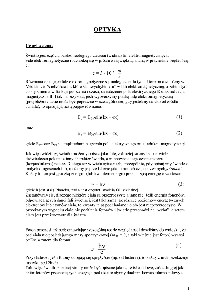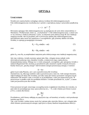 OPTYKA Uwagi wstępne Światło jest częścią bardzo rozległego zakresu (widma) fal elektromagnetycznych. Fale elektromagnetyczne rozchodzą się w próżni z największą znaną w przyrodzie prędkością c: m c = 3 ⋅ 10 8 s Równania opisujące fale elektromagnetyczne są analogiczne do tych, które omawialiśmy w Mechanice. Wielkościami, które są „wychyleniem” w fali elektromagnetycznej, a zatem tym co się zmienia w funkcji położenia i czasu, są natężenie pola elektrycznego E oraz indukcja magnetyczna B. I tak na przykład, jeśli wytworzymy płaską falę elektromagnetyczną (przybliżenie takie może być poprawne w szczególności, gdy jesteśmy daleko od źródła światła), to opisują ją następujące równania: oraz Ey = E0y⋅sin(kx - ωt) (1) Bz = B0z⋅sin(kx - ωt) (2) gdzie E0y oraz B0z są amplitudami natężenia pola elektrycznego oraz indukcji magnetycznej. Jak więc widzimy, światło możemy opisać jako falę, z drugiej strony jednak wiele doświadczeń pokazuje inny charakter światła, a mianowicie jego cząsteczkową (korpuskularną) naturę. Dlatego tez w wielu sytuacjach, szczególnie, gdy opisujemy światło o małych długościach fali, możemy je przedstawić jako strumień cząstek zwanych fotonami. Każdy fonon jest „paczką energii” (lub kwantem energii) przenoszącą energię o wartości: E = hν (3) gdzie h jest stałą Plancka, zaś ν jest częstotliwością fali świetlnej. Zastanówmy się, dlaczego niektóre ciała są przeźroczyste a inne nie. Jeśli energia fononów, odpowiadających danej fali świetlnej, jest taka sama jak różnice poziomów energetycznych elektronów lub atomów ciała, to kwanty te są pochłaniane i ciało jest nieprzeźroczyste. W przeciwnym wypadku ciało nie pochłania fotonów i światło przechodzi na „wylot”, a zatem ciało jest przeźroczyste dla światła. Foton przenosi też pęd; omawiając szczególną teorię względności doszliśmy do wniosku, że pęd ciała nie posiadającego masy spoczynkowej (m 0 = 0, a taki właśnie jest foton) wynosi p=E/c, a zatem dla fotonu: p = hν c (4) Przykładowo, jeśli fotony odbijają się sprężyście (np. od lusterka), to każdy z nich przekazuje lusterku pęd 2hν/c. Tak, więc światło z jednej strony może być opisane jako zjawisko falowe, zaś z drugiej jako zbiór fotonów przenoszących energię i pęd (jest to słynny dualizm korpuskularno-falowy). 1 Własności falowe ujawniają się szczególnie dla dużych długości fali światła, zaś korpuskularne – dla fal krótkich. Podobnie też, przy opisie zjawisk optycznych używamy dwóch przybliżeń: - optyki geometrycznej (dającej poprawny opis dla fal o długościach znacznie mniejszych od rozmiarów „przeszkód’, które napotyka światło), oraz - optyki falowej (gdy długość fali jest porównywalna z rozmiarami przedmiotów, z którymi oddziałuje, np. z szerokością szczelin na których następuje ugięcie światła). Poniżej pokazano dwie sytuacje, które ilustrują użycie optyki geometrycznej oraz falowej: prostoliniowe rozchodzenie się światła oraz zmianę kierunku biegu światła wskutek ugięcia na szczelinie dyfrakcyjnej. Optyka Falowa Geometryczna * Promień świetlny (kierunek rozchodzenia się światła) to wektor prostopadły do powierzchni fazowej fali – jest to podstawowe pojęcie w optyce geometrycznej, * W szczelinach siatki dyfrakcyjnej następuje dyfrakcja i interferencja fali świetlnej, co prowadzi do zmiany kierunku rozchodzenia się fali – jest to zjawisko opisywane przez optykę falową. Niemniej, bieg wiązki padającej jak i ugiętej przedstawiany jest schematycznie przez promienie świetlne. A oto, co dzieje się w każdej ze szczelin: - szczelina staje się źródłem fali kulistej (przedstawionej poprzez promienie świetlne prostopadłe do powierzchni falowej) - rysunek po lewej, - fale wychodzące z dwóch szczelin (rysunek po prawej) interferują ze sobą i w pewnych 2 kierunkach powstaną wiązki wzmocnione, jak to przedstawiono schematycznie na poprzednim rysunku. Fala elektromagnetyczna (a więc i świetlna) przenosi oczywiście energię; przepływ energii opisuje się tzw. wektorem Poyntinga S zdefiniowanym jako: 1 (5) S= E×B µ0 Wektor S podaje kierunek przepływu energii przenoszonej przez falę oraz jej moc przypadającą na jednostkę prostopadłej do tego kierunku powierzchni (wyrażoną w W/m2). W zakresie fal świetlnych występuje także efekt Dopplera, analogicznie jak dla fal akustycznych. Jednak zależność ilościowa jest inna niż dla fal akustycznych, gdyż wyrażenie na zmianę częstotliwości rejestrowanej fali w funkcji prędkości względnej odbiorcy i nadawcy sygnału uzyskuje się na bazie szczególnej teorii względności. Wykazuje się, że obserwowana prze odbiorcę częstotliwość fali świetlnej, ν’, wynosi: (6) 1− u / c 1+ u / c gdzie u jest względną prędkością nadawcy i odbiorcy sygnału (dodatni znak u odpowiada sytuacji, gdy nadawca i odbiorca oddalają się od siebie, zaś ujemny – gdy zbliżają się do siebie) oraz ν jest częstotliwością, którą zmierzy nadawca. ν' = ν OPTYKA GEOMETRYCZNA Optyka geometryczna zajmuje się zagadnieniami związanymi z rozchodzeniem się światła w różnych ośrodkach, przy czym zakłada się, że światło rozchodzi się po liniach prostych. Wprowadza się pojęcie promienia świetlnego, który jest kierunkiem normalnym do powierzchni fazowej rozchodzącej się fali. Opis w ujęciu optyki geometrycznej pozostaje sluszny, jeśli rozmiary przegród, szczelin i otworów, na które napotyka światło, są znacznie większe od długość fali świetlnej. Typowym przykładem, który jest dobrze opisywany przez optykę geometryczną jest powstawanie cienia i półcienia: Ekran Ekran S cień Cień powstaje wtedy, gdy rozmiar świecącego źródła jest znacznie mniejszy niż rozmiar oświetlanego obiektu. 3 Półcień powstaje wtedy, gdy rozmiar świecąc