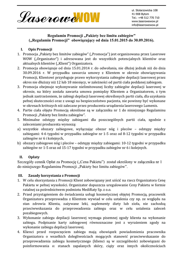 ul. Stolarzowicka 108 41-908 Bytom Tel.: +48 512 770 710 www.laserowewow.pl [email protected] Regulamin Promocji „Pakiety bez limitu zabiegów” („Regulamin Promocji” obowiązujący od dnia 15.01.2015 do 30.09.2016). I. OpisPromocji 1. Promocja„Pakietybezlimitówzabiegów”(„Promocja”)jestorganizowanaprzezLaserowe WOW („Organizator”) i adresowana jest do wszystkich potencjalnych klientów oraz aktualnychklientów(„Klient”)Organizatora. 2. Promocja obowiązuje od dnia 15.01.2014 r. do odwołania, nie dłużej jednak niż do dnia 30.09.2016 r. W przypadku zawarcia umowy z Klientem w okresie obowiązywania Promocji,Klientowiprzysługujeprawowykorzystaniazabiegówdepilacjilaserowejprzez okresniedłuższyniż12lub18miesięcy,wzależnościodpartiiciałapoddanejzabiegom. 3. Promocja obejmuje wykonywanie nielimitowanej liczby zabiegów depilacji laserowej w okresie, na który została zawarta umowa pomiędzy Klientem a Organizatorem, z tym jednakzastrzeżeniem,żezabiegidepilacjilaserowejokreślonychpartiiciała,dlauzyskania pełnejskutecznościorazzuwaginabezpieczeństwopacjenta,niepowinnybyćwykonane wokresachkrótszychniżzalecaneprzezproducentaurządzenialaserowegoLumenis. 4. Partie ciała objęte Promocją określone są w załączniku nr 1 do niniejszego Regulaminu Promocji„Pakietybezlimituzabiegów". 5. Minimalne odstępy między zabiegami dla poszczególnych partii ciała, zgodnie z zaleceniamiproducentawynoszą: a) wszystkie obszary zabiegowe, wyłączając obszar nóg i pleców – odstępy między zabiegami:4-6tygodniwprzypadkuzabiegównr1-5orazod8-12tygodniwprzypadku zabiegównr6ikolejnych, b) obszaryzabiegowenógipleców–odstępymiędzyzabiegami:10-12tygodniwprzypadku zabiegównr1-5orazod15-17tygodniwprzypadkuzabiegównr6ikolejnych. II. Opłaty Szczegóły cennik Opłat za Promocję („Cena Pakietu”) został określony w załączniku nr 1 do niniejszego Regulaminu Promocji „Pakiety bez limitu zabiegów”. III. ZasadykorzystaniazPromocji 1. WceluskorzystaniazPromocjiKlientzobowiązanyjestuiścićnarzeczOrganizatoraCenę Pakietuwpełnejwysokości.OrganizatordopuszczauregulowanieCenyPakietuwformie ratalnejzapośrednictwempodmiotuMediRatySp.zo.o. 2. Przed przystąpieniem do świadczenia usługi kosmetycznej objętej Promocją, pracownik Organizatora przeprowadza z Klientem wywiad w celu ustalenia czy np. ze względu na stan zdrowia Klienta, zażywane leki, suplementy diety lub zioła, nie zachodzą przeciwwskazania do przeprowadzenia zabiegu oraz w celu ustalenia zaleceń pozabiegowych. 3. Wykonanie zabiegu depilacji laserowej wymaga pisemnej zgody klienta na wykonanie zabiegu. Podpisanie karty zabiegowej równoznaczne jest z wyrażeniem zgody na wykonaniezabiegudepilacjilaserowej. 4. Klienci przed rozpoczęciem zabiegu mają obowiązek powiadomienia pracownika Organizatora o wszelkich dolegliwościach mogących stanowić przeciwwskazanie do przeprowadzenia zabiegu kosmetycznego (klienci są w szczególności zobowiązani do poinformowania o: stanach zapalanych skóry, ciąży oraz innych okolicznościach ul. Stolarzowicka 108 41-908 Bytom Tel.: +48 512 770 710 www.laserowewow.pl [email protected] 5. 6. 7. 8. dotyczących ich stanu zdrowia, a mogących mieć wpływ na bezpieczeństwo wykonania zabiegu). Są to istotne informacje i mają szczególne znaczenie w przypadku podjęcia decyzjiozakwalifikowaniuKlientadozabiegówdepilacjilaserowej. Kliencizobowiązanisą(powinni)poinformowaćpracownikaOrganizatoraopogorszeniu swojegosamopoczuciawtrakciewykonywaniazabiegów. W razie wątpliwości co do bezpieczeństwa przeprowadzenia zabiegu, pracownik Organizatoramaprawoodmówićjegoprzeprowadzenia. Na zabieg w okresie obowiązywania umowy objętej Promocją Klient zobowiązany jest umówić bezpośrednio przed lub po wykonanym zabiegu depilacji laserowej bądź telefonicznie. Organizator nie odpowiada za uchybienie przez Klienta obowiązkowi umówieniasięnakolejnąwizytę. Za wykupione i nie wykorzystane zabiegi Organizator nie będzie udzielał zwrotów. ProsimyzatemoprzemyślaneumawianiesięnazabiegiwoferciePromocyjnej. IV. WyłączeniePromocji 1. UmowazawartapomiędzyKlientemagabinetemLaseroweWOWjestumowązawartąna czasokreślonywrozumieniuprzepisówustawyKodekscywilny. 2. W przypadku rozwiązania umowy, Klient zobowiązany jest zapłacić za każdy wykonany zabieg depilacji laserowej, przy czym cena jednego zabiegu odpowiada cenie regularnej oferowanej przez Organizatora, zgodnie z cennikiem usług obowiązującym w dacie obowiązywaniaPromocji. V. Informacjedodatkowe 1. Regulamin Promocji jest dostępny na stronie internetowej www.laserowewow.pl oraz w miejscuwykonywaniazabiegów. 2. Klienci zobowiązani są do zapoznania się z regulaminem Promocji „Pakiety bez limitów zabiegów”przedrozpoczęciemzabieguorazdoprzestrzeganiajegopostanowień. 3. Skorzystanie z oferty Promocji oznacza, że Klient zapoznał się z treścią niniejszego RegulaminuPromocjiijąakceptuje. 4. Niezastosowanie się Klienta do wymagań niniejszego Regulaminu skutkuje wyłączeniem odpowiedzialności Organizatora za przeprowadzony zabieg, w zakresie w jakim ewentualna szkoda pozostaje w związku przyczynowym z naruszeniem postanowień Regulaminu. ul. Stolarzowicka 108 41-908 Bytom Tel.: +48 512 770 710 www.laserowewow.pl [email protected] Załącznik nr 1 Regulaminu Promocji „Pakiety bez limitu zabiegów" CennikPakietowy depilacjilaserowejsystememLightSheer® Częściciała CenaPakietubezlitmituzabiegów*,** (najednączęśćciała) brwi(obszarpomiędzybrwiami),uszy 500 górnawarga,baki 750 broda,policzki,szyja,kark,barki,pachy,przedramiona, dłonie,brodawkipiersiowe,bikinipodstawowe,szpara międzypośladkowa 1000 bikinipogłębione 1100 bikinicałkowite,brzuch,pośladki,ramiona 1200 uda(kolanagratis),łydki(stopygratis),plecy,klatka piersiowa,modelowaniezarostutwarzyumężczyzn 1500 plecy 2000 całenogi:uda(kolanagratis),łydki(stopygratis) 2500-3000 *Pakietnielimitowanejdepi