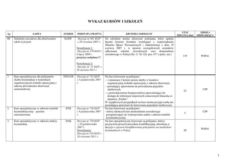 WYKAZ KURSÓW I SZKOLEŃ Lp. 00 NAZWA Szkolenie zawodowe dla absolwentów szkół wyższych SYMBOL PODSTAWA PRAWNA KRYTERIA FORMALNE SASW Decyzja nr 681 KGP z 20 września 2007 r. Na szkolenie można skierować policjanta, który spełnia łącznie kryteria formalne wynikające z rozporządzenia Ministra Spraw Wewnętrznych i Administracji z dnia 19 czerwca 2007 r. w sprawie szczegółowych warunków odbywania szkoleń zawodowych oraz doskonalenia zawodowego w Policji (Dz. U. Nr 126, poz. 877 z późn. zm.) Nowelizacja 1: Decyzja nr 270 KGP z 6 lipca 2009 r. powyższe uchylone!!! CZAS TRWANIA (dni) SZKOŁA PROWADZĄCA 119 WSPol. Nowelizacja 2: Decyzja nr 12 KGP z 28 stycznia 2011 r. 1. 2. 3. Kurs specjalistyczny dla policjantów służby kryminalnej w komórkach organizacyjnych techniki operacyjnej z zakresu prowadzenia obserwacji samochodowej DTO-OS Kurs specjalistyczny w zakresie techniki kryminalistycznej – poziom zaawansowany DTK Kurs specjalistyczny w zakresie analizy kryminalnej DAK Decyzja nr 722 KGP z 5 października 2007 r. Decyzja nr 728 KGP z 9 października 2007 r. Decyzja nr 738 KGP z 10 października 2007 r. Nowelizacja: Decyzja nr 316 KGP z 28 września 2011 r. Na kurs kierowani są policjanci: z minimum 2-letnim stażem służby w komórce organizacyjnej techniki operacyjnej z zakresu obserwacji, posiadający uprawnienia do prowadzenia pojazdów służbowych, z poświadczeniem bezpieczeństwa upoważniające do dostępu do informacji niejawnych oznaczonych klauzulą co najmniej „Poufne”. W wyjątkowych przypadkach na kurs można przyjąć osobę nie posiadającą uprawnień do kierowania pojazdami służbowymi. Na kurs kierowani są policjanci: - którzy ukończyli kurs doskonalenia zawodowego przygotowujący do wykonywania zadań z zakresu techniki kryminalistycznej. Na kurs specjalistyczny kierowani są policjanci, którzy pozytywnie przeszli procedurę kwalifikacyjną, określoną w decyzji w sprawie kwalifikowania policjantów na analityków kryminalnych w Policji. 25 5 20 CSP CSP WSPol. 1 Lp. 4. 5. 6. 7. 8. NAZWA Kurs specjalistyczny dla policjantów wykonujących zadania obronne Kurs specjalistyczny dla policjantów realizujących zatrzymania niebezpiecznych przestępców Kurs specjalistyczny dla służby dyżurnej Komendy Głównej Policji, komend wojewódzkich Policji, Komendy Stołecznej Policji Kurs specjalistyczny dla kierowników komórek organizacyjnych ruchu drogowego Komend Miejskich Policji i Komend Powiatowych Policji w zakresie Krajowego Programu Bezpieczeństwa Ruchu Drogowego na lata 2005-2007-2013 „Gambit – 2005”. Kurs specjalistyczny dla policjantów podejmujących interwencje wobec osób agresywnych i niebezpiecznych SYMBOL PODSTAWA PRAWNA KRYTERIA FORMALNE DZO Decyzja nr 757 KGP z 18 października 2007 r. Na kurs kierowani są policjanci: z minimum 5 letnim stażem służby, wykonujący lub przewidywani do wykonywania zadań obronnych, posiadający poświadczenie bezpieczeństwa uprawniające do dostępu do informacji oznaczonych klauzulą co najmniej „Tajne”. Na kurs kierowani są policjanci: - służby prewencyjnej oraz kryminalnej zajmujący się zatrzymaniem niebezpiecznych przestępców. Na kurs kierowani są policjanci: mianowani lub przewidywani do obsady stanowiska kierowania, posiadający poświadczenie bezpieczeństwa, upoważniające do dostępu do informacji niejawnych, oznaczonych klauzulą „Ściśle Tajne”. ZNP DSDyzKW P GAMB ANI Nowelizacja: Decyzja nr 60 KGP z 6 lutego 2008 r. Decyzja nr 781 KGP z 26 października 2007 r. Decyzja nr 782 KGP z 26 października 2007 r. Nowelizacja: Decyzja nr 352 KGP z 27 sierpnia 2013 r. Decyzja nr 785 KGP z 30 października 2007 r. Decyzja nr 797 KGP z 6 listopada 2007 r. Na kurs kierowani są policjanci: - kierownicy komórek organizacyjnych ruchu drogowego komend powiatowych (miejskich, rejonowych) Policji lub ich zastępcy, bądź osoby przewidywane do realizacji zadań z zakresu nadzoru nad bezpieczeństwem w ruchu drogowym. CZAS TRWANIA (dni) SZKOŁA PROWADZĄCA 9 WSPol. CSP SP Katowice SP Piła SP Słupsk 15 10 3 Na kurs kierowani są policjanci: - służby prewencyjnej, którzy w ramach swoich zadań służbowych podejmują interwencje. Nowelizacja 1: Decyzja nr 766 KGP z 11 grudnia 2008 r. 5 WSPol. CSP WSPol. WSPol. WSPol. CSP SP Katowice SP Słupsk Nowelizacja 2: Decyzja nr 221 KGP z 13 sierpnia 2010 r. 9. Kurs specjalistyczny dla policjantów realizujących czynności w postępowaniu administracyjnym Post.A Decyzja nr 820 KGP z 19 listopada 2007 r. Na kurs kierowani są policjanci: - realizujący lub przewidywani do realizacji czynności w postępowaniu administracyjnym. 13 WSPol. SP Katowice 2 Lp. 10. NAZWA Kurs specjalistyczny z zakresu taktyki i technik przesłuchań SYMBOL FBI PODSTAWA PRAWNA Decyzja nr 844 KGP z 30 listopada 2007 r. Nowelizacja 1: Decyzja nr 29 KGP z 27stycznia 2009 r. powyższe uchylone!! KRYTERIA FORMALNE CZAS TRWANIA (dni) SZKOŁA PROWADZĄCA 5 WSPol. CSP SP Katowice SP Piła SP Słupsk Na kurs kierowani są policjanci: służby kryminalnej i śledczej, którzy posiadają doświadczenie zawodowe w pracy operacyjnej i dochodzeniowo - śledczej, nie mniejsze niż 4 lata i nie większe niż 20 lat. Nowa decyzja: Decyzja nr 217 KGP z 13 sierpnia 2010 r. 11. 12. 13. Kurs specjalistyczny w zakresie videorejestratorów wykroczeń Kurs specjalistyczny dla policjantów pełniących funkcje oskarżyciela publicznego Kurs specjalistyczny dla przewodników psów służbowych do wyszukiwania zapachów narkotyków VR Osk.P SEN Decyzja nr 845 KGP z 30 listopada 2007 r. Decyzja nr 846 KGP z 30 listopada 2007 r. Nowelizacja: Decyzja nr 202 KGP z 6 sierpnia 2010 r. Decyzja nr 847 KGP z 30 listopada 2007 r. Nowelizacja: Decyzja nr 231 KGP z dnia 17 lipca 2012 r. 14. 15. Kurs specjalistyczny w zakresie kontroli tachografów cyfrowych T Kurs specjalistyczny dla rzeczników dyscyplinarnych D Decyzja nr 848 KGP z 30 listopada 2007 r. Decyzja nr 849 KGP z 30 listopada 