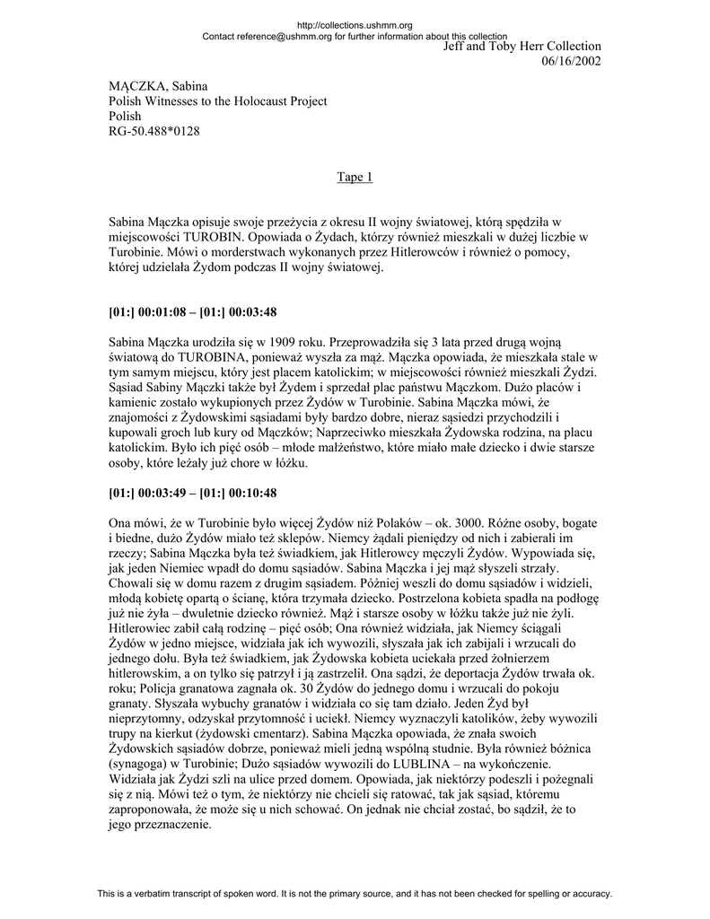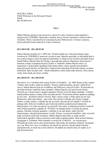http://collections.ushmm.org Contact [email protected] for further information about this collection Jeff and Toby Herr Collection 06/16/2002 MĄCZKA, Sabina Polish Witnesses to the Holocaust Project Polish RG-50.488*0128 Tape 1 Sabina Mączka opisuje swoje przeżycia z okresu II wojny światowej, którą spędziła w miejscowości TUROBIN. Opowiada o Żydach, którzy również mieszkali w dużej liczbie w Turobinie. Mówi o morderstwach wykonanych przez Hitlerowców i również o pomocy, której udzielała Żydom podczas II wojny światowej. [01:] 00:01:08 – [01:] 00:03:48 Sabina Mączka urodziła się w 1909 roku. Przeprowadziła się 3 lata przed drugą wojną światową do TUROBINA, ponieważ wyszła za mąż. Mączka opowiada, że mieszkała stale w tym samym miejscu, który jest placem katolickim; w miejscowości również mieszkali Żydzi. Sąsiad Sabiny Mączki także był Żydem i sprzedał plac państwu Mączkom. Dużo placów i kamienic zostało wykupionych przez Żydów w Turobinie. Sabina Mączka mówi, że znajomości z Żydowskimi sąsiadami były bardzo dobre, nieraz sąsiedzi przychodzili i kupowali groch lub kury od Mączków; Naprzeciwko mieszkała Żydowska rodzina, na placu katolickim. Było ich pięć osób – młode małżeństwo, które miało małe dziecko i dwie starsze osoby, które leżały już chore w łóżku. [01:] 00:03:49 – [01:] 00:10:48 Ona mówi, że w Turobinie było więcej Żydów niż Polaków – ok. 3000. Różne osoby, bogate i biedne, dużo Żydów miało też sklepów. Niemcy żądali pieniędzy od nich i zabierali im rzeczy; Sabina Mączka była też świadkiem, jak Hitlerowcy męczyli Żydów. Wypowiada się, jak jeden Niemiec wpadł do domu sąsiadów. Sabina Mączka i jej mąż słyszeli strzały. Chowali się w domu razem z drugim sąsiadem. Później weszli do domu sąsiadów i widzieli, młodą kobietę opartą o ścianę, która trzymała dziecko. Postrzelona kobieta spadła na podłogę już nie żyła – dwuletnie dziecko również. Mąż i starsze osoby w łóżku także już nie żyli. Hitlerowiec zabił całą rodzinę – pięć osób; Ona również widziała, jak Niemcy ściągali Żydów w jedno miejsce, widziała jak ich wywozili, słyszała jak ich zabijali i wrzucali do jednego dołu. Była też świadkiem, jak Żydowska kobieta uciekała przed żołnierzem hitlerowskim, a on tylko się patrzył i ją zastrzelił. Ona sądzi, że deportacja Żydów trwała ok. roku; Policja granatowa zagnała ok. 30 Żydów do jednego domu i wrzucali do pokoju granaty. Słyszała wybuchy granatów i widziała co się tam działo. Jeden Żyd był nieprzytomny, odzyskał przytomność i uciekł. Niemcy wyznaczyli katolików, żeby wywozili trupy na kierkut (żydowski cmentarz). Sabina Mączka opowiada, że znała swoich Żydowskich sąsiadów dobrze, ponieważ mieli jedną wspólną studnie. Była również bóżnica (synagoga) w Turobinie; Dużo sąsiadów wywozili do LUBLINA – na wykończenie. Widziała jak Żydzi szli na ulice przed domem. Opowiada, jak niektórzy podeszli i pożegnali się z nią. Mówi też o tym, że niektórzy nie chcieli się ratować, tak jak sąsiad, któremu zaproponowała, że może się u nich schować. On jednak nie chciał zostać, bo sądził, że to jego przeznaczenie. This is a verbatim transcript of spoken word. It is not the primary source, and it has not been checked for spelling or accuracy. http://collections.ushmm.org Contact [email protected] for further information about this collection Jeff and Toby Herr Collection 06/16/2002 [01:] 00:10:49 – [01:] 00:13:46 Ona mówi, że w Turobinie nie było getta. Wywozili Żydów na Majdanek do LUBLINA. Sabina Mączka opowiada też, że wysyłała paczki z jedzeniem do znajomych, ponieważ pisali listy, że nie mają co jeść; w Turobinie były różne domy, jeden dom był katolicki, a drugi Żydowski. Ona przedstawia, że kogo złapali, Niemcy wywozili na robotę do Niemiec. Sąsiad Żyd bał się, że jego syna zabiorą. Z tego powodu, poprosił, żeby rodzina Mączków się nim zaopiekowała. Syn był długi czas u nich, a jednej nocy prosił o chleb i uciekł. Mówi też, że niektórzy Polacy zdradzali, kto jest Żydem a kto nie. Nie wie kto zdradził syna sąsiada. [01:] 00:13:47 – [01:] 00:15:42 Sabina Mączka przedstawia też sytuację Żydów, którzy się chowali na strychach w swoich domach. Zabierali jedzenie na strych, kiedy już nie mieli żywności, wysyłali małe dzieci do miasta. Dzieci prosiły katolików o chleb. Słyszała, że jak Niemcy się o tym dowiedzieli, zabijali dzieci; Sąsiadka Pani Mączki wzięła małą dziewczynkę do siebie i wychowała. [01:] 00:15:43 – [01:] 00:20:10 Ona widziała, jak granatowa policja wysyłała katolickich ludzi, żeby wywozili zabitych ludzi na kierkut. Opisuje, że dzisiaj już nie ma znaków na kamieniach, a tam gdzie była synagoga, kamienica stoi; Opowiada, o mężczyźnie, który przechowywał Żydów, za pieniądze i później ich zdradzał. [01:] 00:20:11 – [01:] 00:25:20 Pani Mączka, widziała jak SS-Mann zastrzelił młodą dziewczynę Żydowską. Mówi, że dziewczynka wyszła i szukała coś do jedzenia, ponieważ chowała się na dachu. Jak zobaczyła Niemca, to klęknęła i żegnała się i udawała, że jest katoliczką. On ją zastrzelił i jak spadła, kopnął ją nogą. Sabina Mączka opowiada, że ludzie sprzątnęli ją, żeby ją pochować; Przypomniało się jej, że Polak, który ukrywał Żydów i ich zdradzał nazywał się Teklak; Mówi też, że Żydowska dziewczyna, który została wychowana przez sąsiadów, dowiedziała się o prawdziwych rodzicach i mimo to zaprosiła sąsiadów na wesele; Sabina Mączka widziała Engelsa na motocyklu i pamięta jak Hitlerowiec, zwany Karol, zabierał jej konia, a jak go przyprowadził koń był nieprzytomny. This is a verbatim transcript of spoken word. It is not the primary source, and it has not been checked for spell
