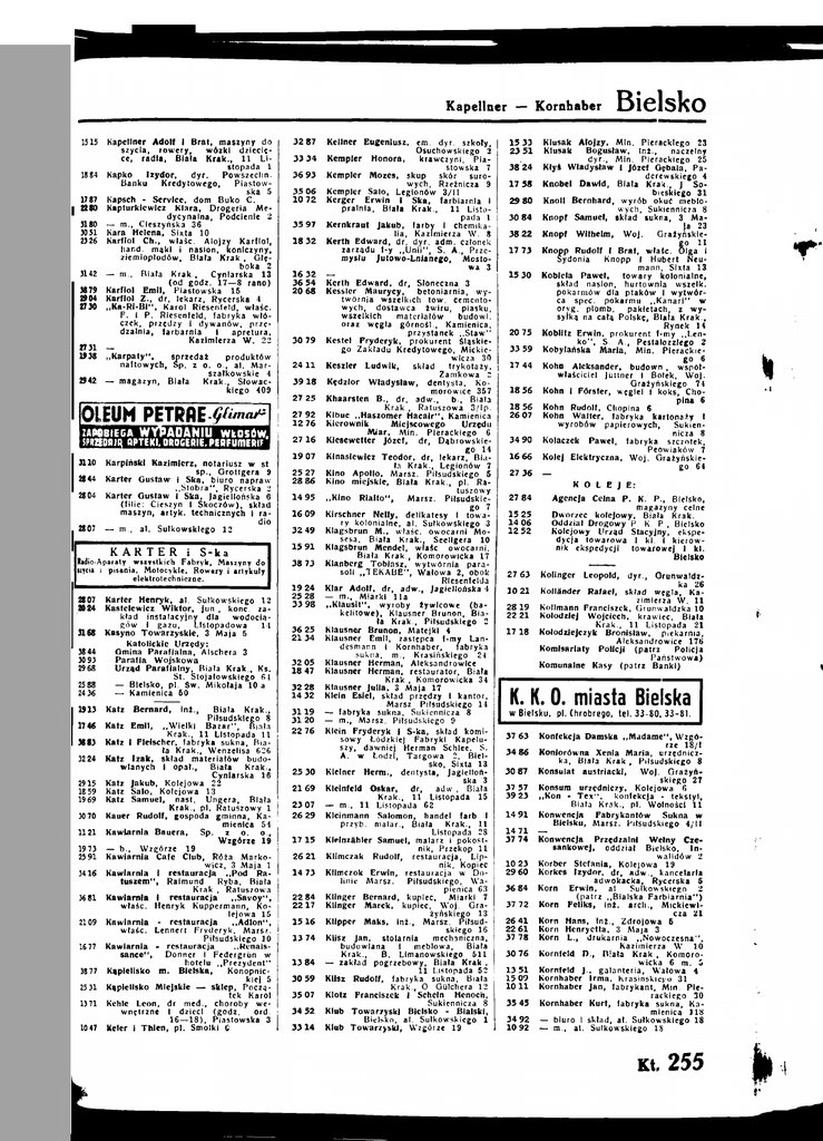 Kapellner — Kornhaber . J515 Kapellner Adolf I Brat, maszyny do szycia, rowery. wózki dziecię ce, radia, Bista Krak., 11 L i stopada 1 1884 Kapko Izydor, dyr. Powszechn. Banku Kredytowego, Piastow ska 5 1787 Kapsch - Service, dom Buko C. 22 80 Kapturklewlcz Klara, Drogeria Medycynalna, Podcienie 2 3180 — m., Cieszyńska 36 30 51 Kara Helena, Sixta 10 2326 Karfiol Ch., wlaśc. Alojzy Karllol, hand. maki i nasion, koniczyny, ziemiopłodów, Biała Krak., Głę boka 2 3142 — m., Blala Krak., Cynlarska 13 (od godz. 17—8 rano) 38 79 Karfiol Emil, Piastowska 15 29 04 Karfiol Z., dr, lekarz, Rycerska 4 2730 „Ka-RI-BI", Karol Riesenleld, wlaśc. P. i P. Riesenleld, fabryka włó czek, przędzy I dywanów, przę dzalnia, farbarnia I apretura, Kazimierza W. 22 2731 — 1938 „Karpaty", sprzedaż produktów naftowych, Sp. z o. o., al. Mar szałkowskie 4 29 42 — magazyn, Biała Krak., Słowac kiego 409 OLEUM P E T R A E - ^ w ZAPOBIEGA WYPADANIU wtosów. SPRH0PJO QPTEKI, DROGERIE, PERFUMERIE 3110 Karpiński Kazimierz, notariusz w st sp., Grottgera 9 2844 Karter Gustaw I Ska, biuro napraw „Stobra", Rycerska 2 2804 Karter Gustaw I Ska, Jagiellońska 0 (lilie: Cieszyn I Skoczów), sktad maszyn, artyk. technicznych i ra dio 2807 — m.. al. Sulkowskiego 12 KARTER i S-ka Radio-Aparaty wszystkich Fabryk. Maszyny do izycia i pisania. Motocykle, Rowery i artykuły elektrotechniczne. 2807 Karter Henryk, al. Sulkowskiego 12 20 24 Kastelewicz Wiktor, lun., konc. za kład instalacyjny dla wodocią gów I gazu. Listopadowa 14 3168 Kasyno Towarzyskie, 3 Maja 5 Katolickie Urzędy: Ominą Parafialna, Alschera 3 38 44 Parafia Wojskowa 30 93 Urząd Parafialny, Biała Krak., Ks. 29 68 St. Stojatowskiego 64 25 88 — Bielsko, p l . SW. Mikołaja 10 a 24 36 — Kamienica 60 1913 Katz Bernard, inż., 17 46 38 83 3224 2915 1(59 1969 30 70 ua 1973 2591 3416 3681 2109 1677 3877 2531 1371 1047 Biała Krak., Piłsudskiego 8 Katz Emil, „Wielki Bazar", Blala Krak., 11 Listopada 11 Kata 1 Flełscher, labryka sukna. Bia ła Krak., Wenzelisa 626 Katz Izak. sktad materiałów budo wlanych 1 opal., Biała Krak., - Cynlarska 16 Katz Jakub, Kolejowa 22 Katz Salo, Kolejowa 13 Katz Samuel, nast, Ungera, Biała Krak., pl. Ratuszowy 1 Kauer Rudolf, gospoda gminna, Ka mienica 64 Kawiarnia Bauera, Sp. z o. o., Wzgórze 19 — b.. Wzgórze 19 Kawiarnia Cale Club, Róża Marko wicz, 3 Maja 1 Kawiarnia I restauracja „Pod Ra tuszem", Raimund Ryba, Biała Krak., Ratuszowa Kawiarnia I restauracja „Savoy", właśc. Henryk Kuppermann, Ko lejowa 15 Kawiarnia - restauracja „Adlon", wlaśc. Lennert Fryderyk, Mars*. Piłsudskiego 10 Kawiarnia - restauracja „Kenaissance", Donner I Federgrün w hotelu ,,Prezydent'* Kąpielisko m. Bielska, Konopnic kiej 5 Kąpielisko Miejskie — sklep, Począ tek Karol Kehle Leon, dr med., choroby we wnętrzne I dzieci (godz. ord. 16—18), Piastowska 3 Kcler i Thlen, p l . Smolki O 3287 3334 36 93 35 06 10 72 35 97 18 32 16 32 36 54 20 68 3079 2411 3918 27 25 27 92 12 76 2716 19 07 25 27 28 86 14 95 16 09 32 49 1591 38 73 19 24 25 28 33 98 36 25 2134 3205 18 47 32 28 14 32 3119 3120 22 76 25 30 2169 23 07 26 29 1715 26 21 14 73 22 84 2217 1516 13 74 13 84 30 59 35 07 34 52 3314 Kellner Eugeniusz, em. dyr. szkoły, Osuchowskiego 3 Kempier Honora, krawczynl, Pia stowska 7 Kempier Mozes, skup skór suro wych, Rzeżnicza 9 Kempier Salo, Legionów 3/11 Kerger Erwin I Ska, farbiarnla I pralnia, Blala Krak., 11 Listo pada 1 Kernkraut Jakub, larby i chemika lia, Kazimierza W . 8 Kerth Edward, dr, dyr. adm. członek zarządu ł-y „ u n i i " , S. A., Prze mysłu Jutowo-Lnianego, Mosto wa 3 — Kerth Edward, dr, Słoneczna 3 Kessler Maurycy, betoniarnla, wy twórnia wszelkich tow. cemento wych, dostawca żwiru, piasku, wszelkich materiałów budowl. oraz węgla górnośl.. Kamienica, przystanek „Staw" Kestel Fryderyk, prokurent Śląskie go Zakładu Kredytowego, Mickie wicza 30 Keszler Ludwik, skład trykotaży, Zamkowa z Kędzior Władysław, dentysta, Komorowice 357 Khaarsten B., dr, adw., b.. Biała Krak., Ratuszowa 3/lp. Klbuc „Haszomer Hacair", Kamienica Kierownik Miejscowego Urzędu Miar, Min. Pierackiego 6 Klesewetter Józef, dr, Dąbrowskie go 14 Klnaslewlcz Teodor, dr, lekarz, Bia ła Krak., Legionów 7 Kino Apollo, Marsz. Piłsudskiego 6 Kino miejskie, Blala Krak., p l . Ra tuszowy „Kino Rlalto", Marsz. Piłsudskie go 7 Klrschner Nelly, delikatesy I towa ry kolonialne, al. Sulkowskiego 3 Klagsbrun M., wlaśc. owocarni Mosesa. Biała Krak., Seeligera 10 Klagsbrun Mendel, wlaśc owocarni, Biała Krak., Komorowlcka 17 Klanberg Tobiasz, wytwórnia para soli „TEKABE", Wałowa 2, obok Rlesenlelda Klar Adolf, dr, adw., Jagiellońska I — ni., Miarki l l a „Klausit", wyroby żywicowe (ba kelitowe), Klausner Brunon, Bia ła Krak., Piłsudskiego 2 Klausner Brunon, Matejki 4 Klausner Emil, zastępca l-my Landesmann i Kornhaber, fabryka sukna, m., Krasińskiego 24 Klausner Herman, Aleksandrowlce Klausner Herman, restaurator. Biała Krak., Komorowicka 34 Klausner Julia, 3 Maja 17 Klein Esiel, skład przędzy I kantor. Marsz Piłsudskiego 14 — labryka sukna. Sukiennicze 8 — m.. Marsz. Piłsudskiego 9 Klein Fryderyk I S-ka, skład komi sowy Łódzkie) Fabryki Kapelu szy, dawniej Herman Schlee, S. A. w Łodzi, Targowa 2, Biel sko, Sixta 18 Kleiner Henn., dentysta, Jagielloń ska 3 Kleinfeld Oskar, dr, adw., Blala Krak., 11 Listopada 15 — m , 11 Listopada 62 Kleinmann Salomon, handel larb I przyb. malar., Blala Krak., 11 Listopada 28 Kleinzähler Samuel, malarz i pokostnik, Przekop 11 Klimczak Rudolf, restauracja, Lip nik, Kopiec Klimczok Erwin, restauracja w Do linie Marsz. Piłsudskiego, Wapienica 63 Klinger Bernard, kupiec. Miarki 7 Klinger Marek, kupiec, Woj. Gra żyńskiego 13 Klipper Maks, Int., Marsz. Piłsud skiego 16 Klisz Jan, stolarnia mechaniczna, budowlana I meblowa, Blala Krak., B. Limanowskiego 611 — zakład pogrzebowy. Biała Krak , 11 Listopada 52 Klisz Rudolf, labryka suk