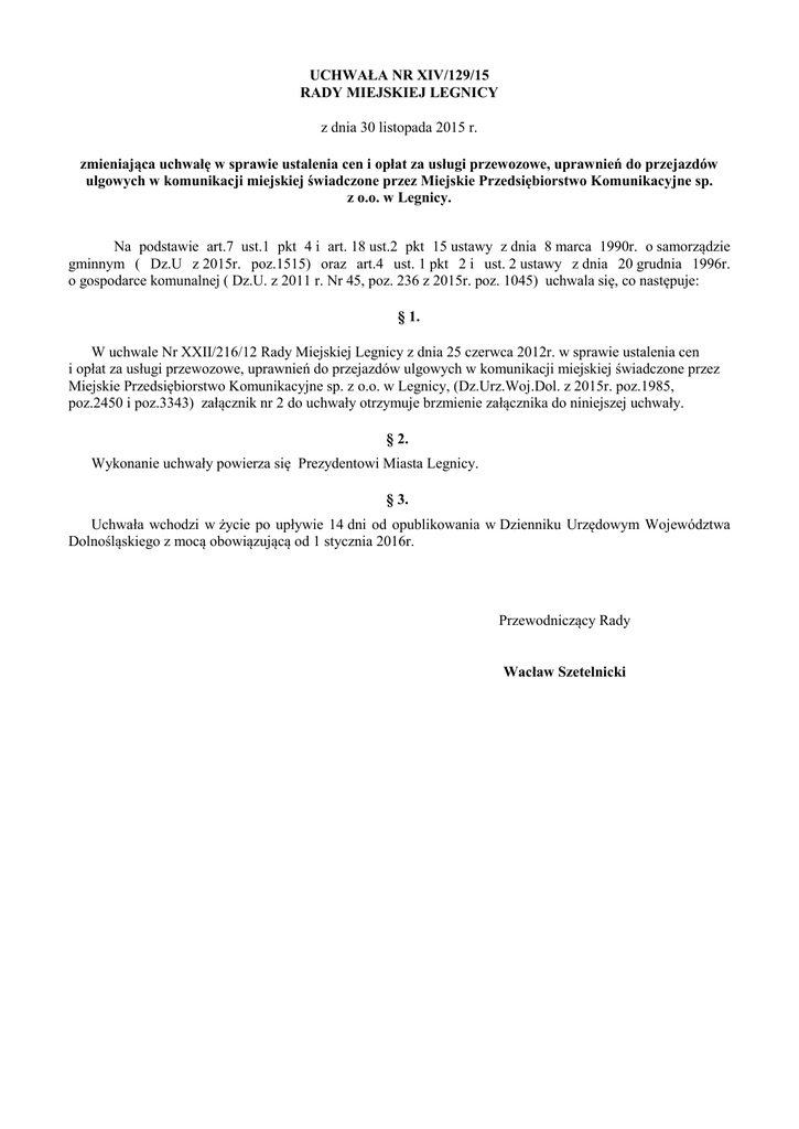 UCHWAŁA NR XIV/129/15 RADY MIEJSKIEJ LEGNICY z dnia 30 listopada 2015 r. zmieniająca uchwałę w sprawie ustalenia cen i opłat za usługi przewozowe, uprawnień do przejazdów ulgowych w komunikacji miejskiej świadczone przez Miejskie Przedsiębiorstwo Komunikacyjne sp. z o.o. w Legnicy. Na podstawie art.7 ust.1 pkt 4 i art. 18 ust.2 pkt 15 ustawy z dnia 8 marca 1990r. o samorządzie gminnym ( Dz.U z 2015r. poz.1515) oraz art.4 ust. 1 pkt 2 i ust. 2 ustawy z dnia 20 grudnia 1996r. o gospodarce komunalnej ( Dz.U. z 2011 r. Nr 45, poz. 236 z 2015r. poz. 1045) uchwala się, co następuje: § 1. W uchwale Nr XXII/216/12 Rady Miejskiej Legnicy z dnia 25 czerwca 2012r. w sprawie ustalenia cen i opłat za usługi przewozowe, uprawnień do przejazdów ulgowych w komunikacji miejskiej świadczone przez Miejskie Przedsiębiorstwo Komunikacyjne sp. z o.o. w Legnicy, (Dz.Urz.Woj.Dol. z 2015r. poz.1985, poz.2450 i poz.3343) załącznik nr 2 do uchwały otrzymuje brzmienie załącznika do niniejszej uchwały. § 2. Wykonanie uchwały powierza się Prezydentowi Miasta Legnicy. § 3. Uchwała wchodzi w życie po upływie 14 dni od opublikowania w Dzienniku Urzędowym Województwa Dolnośląskiego z mocą obowiązującą od 1 stycznia 2016r. Przewodniczący Rady Wacław Szetelnicki Załącznik do Uchwały Nr XIV/129/15 Rady Miejskiej Legnicy z dnia 30 listopada 2015 r. CENNIK PRZEWOZU OSÓB, BAGAŻU I ZWIERZĄT POJAZDAMI PRZEDSIĘBIORSTWA KOMUNIKACYJNEGO SP Z O.O. w LEGNICY MIEJSKIEGO 1. ILEKROĆ W CENNIKU JEST MOWA O: 1) bilecie normalnym – należy przez to rozumieć bilet pełnopłatny (100%); 2) bilecie ulgowym ustawowym - należy przez to rozumieć bilet stanowiący 50% wartości biletu pełnopłatnego / ulga uprawniona z mocy ustaw lub przepisów szczególnych /, 3) bilecie ulgowym gminnym należy przez to rozumieć bilet z ulgą przyznaną przez Radę Miejską Legnicy , 4) bilecie jednoprzejazdowym - należy przez to rozumieć bilet uprawniający do jednorazowego przejazdu osoby na jednej linii komunikacyjnej; 5) bilecie okresowym trzydziestodniowym („imiennym” lub „na okaziciela”) – należy przez to rozumieć bilet, który może być zakupiony od dowolnej daty wskazanej przez pasażera (bez możliwości zakupu z datą wsteczną) i uprawnia do przejazdu przez okres trzydziestu dni włącznie z określoną na bilecie datą ważności; 6) bilecie całodziennym wielokrotnego przejazdu – należy przez to rozumieć bilet o nielimitowanej ilości przejazdów na wszystkich liniach komunikacyjnych w I -szej strefie opłat w czasie 24 godzin od momentu skasowania (z wyłączeniem linii specjalnych); 7) bilecie imiennym – należy przez to rozumieć bilet wystawiony na określone imię i nazwisko; 8) bilecie „ na okaziciela” należy przez to rozumieć bilet uprawniający do przejazdu jego posiadacza we wszystkie dni miesiąca, na wszystkich liniach w strefie miejskiej Legnicy ( z wyłączeniem linii specjalnych); 9) bilecie uzupełniającym, należy przez to rozumieć dodatkowy bilet, którego wartość stanowi różnicę pomiędzy nową, a starą ceną; 10) bilecie rodzinnym, należy przez to rozumieć bilet uprawniający do przejazdu członka dużej rodziny; 11) bilecie zintegrowanym Legnica – należy przez to rozumieć bilet wydany przez Koleje Dolnośląskie, uprawniający jego posiadacza do nielimitowanej ilości przejazdów we wszystkie dni miesiąca wszystkimi liniami komunikacji miejskiej na obszarze Legnicy a także gmin, które podpisały z Gminą Legnica porozumienie międzygminne w zakresie lokalnego transportu zbiorowego oraz pociągami kolei dolnośląskich na trasie wskazanej na bilecie. 2. BILETY JEDNOPRZEJAZDOWE Rodzaj biletu/ strefa opłat NORMALNY I strefa opłat II strefa opłat 3,00zł 4,60 zł Ceny biletów ULGOWY USTAWOWY 1,50 zł 2,30 zł ULGOWY GMINNY 1,50zł 2,30zł Bilet jednoprzejazdowy dla linii nr "27„ w II strefie opłat upoważnia do przejazdu na trasie Ulesie – Pętla Domejki, z jednokrotną przesiadką na dowolną linię komunikacyjną mającą początek trasy na Pętli Domejki i odwrotnie, pod warunkiem dokonania skasowania biletu w każdym autobusie. 3. BILETY CAŁODZIENNE WIELOKROTNEGO PRZEJAZDU,WYŁĄCZNIE W STREFIE MIEJSKIEJ LEGNICY, Z WYŁĄCZENIEM LINII SPECJALNYCH, OZNACZONE ODPOWIEDNIM NOMINAŁEM I NAZWĄ RODZAJ BILETU NORMALNY Bilet całodzienny 9,00 zł Ceny biletów ULGOWY USTAWOWU 4,50 zł ULGOWY GMINNY 4,50zł 4. BILETY OKRESOWE 30-DNIOWE ” IMIENNE '' ( Z WYŁĄCZENIEM LINII SPECJALNYCH ). Rodzaj biletu/ strefa opłat I strefa opłat NORMALNY Na Na wszystkie jedną linie linię 76 zł 100 zł II strefa opłat 114 zł 140 zł Ceny biletów Ważny we wszystkie dni miesiąca ULGOWY USTAWOWY Na jedną linię Na wszystkie linie 38 zł 50 zł 57 zł 70 zł ULGOWY GMINNY na jedną na linię wszystkie linie 38 zł 50 zł 57 zł 70 zł 1) bilet 30-dniowy na jedną linię w II strefie opłat dla linii nr „27'' obowiązuje na trasie Ulesie -Pętla Domejki, z dalszą przesiadką na linię nr ” 23'' w strefie miasta Legnicy i odwrotnie, 2) bilet 30 - dniowy na wszystkie linie w II strefie opłat obowiązuje przy przejazdach wszystkimi liniami Iszej i II-giej strefy opłat.”, 5. BILETY OKRESOWE 30-DNIOWE „NA OKAZICIELA” NA WSZYSTKIE LINIE KOMUNIKACYJNE W STREFIE MIEJSKIEJ LEGNICY (Z WYŁĄCZENIEM LINII SPECJALNYCH), UPRAWNIAJĄCE DO PRZEJAZDÓW WE WSZYSTKIE DNI MIESIĄCA RODZAJ BILETU Bilet „ na okaziciela” CENY BILETÓW WSZYSTKIE LINIE W STREFIE MIEJSKIEJ LEGNICY WE WSZYSTKIE DNI MIESIĄCA NORMALNY ULGOWY ULGOWY GMINNY USTAWOWY 118 zł 59 zł 59 zł 5a. Bilety rodzinne ważne w I – szej i II -giej strefie opłat : Rodzaj biletu Okresowe 30 dniowe na wszystkie linie komunikacyjne uprawniające do przejazdów we wszystkie dni miesiąca Jednorazowe Cena biletu 30 zł 1zł „5b. Znaczki do biletu zintegrowanego Legnica strefa opłat I strefa opłat II strefa opłat Cena znaczka NORMALNY ULGOWY USTAWOWY ULGOWY GMINNY RODZINNY 76 z