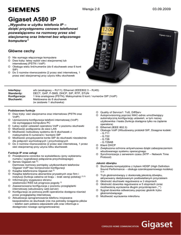 s Wersja 2.6 03.09.2009 Gigaset A580 IP „Wygodna w użytku telefonia IP – dzięki przystępnemu cenowo telefonowi pozwalającemu na rozmowy przez sieć stacjonarną oraz Internet bez włączonego komputera” Główne cechy Ο Nie wymaga włączonego komputera Ο Dwa tryby: łatwy wybór sieci stacjonarnej lub internetowej (PSTN i VoIP) Ο Obsługa wielu linii/numerów (do 6 słuchawek oraz 6 kont SIP) Ο Do 3 rozmów równocześnie (2 przez sieć internetową, 1 przez sieć stacjonarną) przy użyciu kilku słuchawek Interfejsy: Standardy: Konfiguracja: Słuchawki: a/b (analogowy – RJ11); Ethernet (IEEE802.3 – RJ45) DECT, GAP, F-SMS, DHCP, SIP, RTP, STUN 1 linia analogowa (PSTN); Maksymalnie 6 kont / numerów SIP (VoIP) Meldowane do 6 słuchawek (w zestawie 1 słuchawka) Podstawowe funkcje Ο Dwa tryby: sieć stacjonarna oraz internetowa (PSTN oraz VoIP) Ο Uproszczona konfiguracja telefonii internetowej (VoIP) nie wymagająca komputera PC Ο Łatwy wybór ustawień operatora VoIP z poziomu słuchawki Ο Możliwość podłączenia do sieci LAN Ο Możliwość rozbudowy systemu do 6 słuchawek z maksymalnie 6 numerami / kontami SIP Ο Możliwość przypisywania konta SIP do słuchawki niezależnie dla połączeń wychodzących i przychodzących Ο Do 3 rozmów równocześnie (2 przez sieć internetową, 1 przez sieć stacjonarną) przy użyciu kilku słuchawek Funkcje IP oraz usługi Ο Powiększona czcionka na wyświetlaczu (przy wybieraniu numeru i sygnalizacji połączenia przychodzącego) Ο Serwis Gigaset.net 2): Darmowe rozmowy pomiędzy użytkownikami telefonów Gigaset VoIP bez konieczności konfiguracji Ο Książka telefoniczna Gigaset.net 2) Ο Książka telefoniczna abonentów prywatnych oraz firm i instytucji (funkcja zależna od kraju – brak wersji polskiej) 2),3) Ο Informacyjny wygaszacz ekranu: wiadomości RSS lub prognoza pogody 2) Ο Zaawansowana konfiguracja z poziomu przeglądarki internetowej (wbudowany web-server) Ο Konfiguracja za pomocą profili operatorów dostępna również przez przeglądarkę internetową Ο Aktualizacja oprogramowania telefonu inicjowana bezpośrednio ze słuchawki (nie ma potrzeby ściągania plików – telefon sam pobiera odpowiedni plik oraz informuje o dostępności nowego oprogramowania) Ο Quality of Service1: ToS, DiffServ Ο Autoprovisioning poprzez MAC-adres umożliwiający automatyczną konfigurację ustawień, w tym nazwy użytkownika i hasła (funkcja dostępna tylko na żądanie operatora) Ο Ethernet (IEEE 802.3) Ο Obsługa VoIP (Wbudowany protokół SIP, Dosępne kodeki: - G.711 - G.722 - G.726 - G.729AB Ο Klient DHCP Ο Zwiększona ochrona antywirusowa dzięki zabezpieczeniom wbudowanego systemu operacyjnego Ο Synchronizacja z serwerem czasu (NTP – Network Time Protocol) Jakość dźwięku Ο Słuchawka kompatybilna z trybem HDSP (High Definition Sound Performance – obsługa szerokopasmowego kodeka) 3),4) Ο Tryb głośnomówiący z doskonałą jakością dźwięku, aktywowany dedykowanym podświetlanym przyciskiem Ο Głośność słuchawki regulowana w 3 stopniach Ο Głośność dzwonka regulowana w 5 stopniach (oraz możliwością wyciszenia długim przyciśnięciem „*”) Ο Sygnał dzwonka odtwarzany poprzez głośnik trybu głośnomówiącego Ο Możliwość wyciszenia mikrofonu Wersja 2.6 Zasięg Ο Zasięg w pomieszczeniach: Ο Zasięg na zewnątrz: do 50 metrów do 300 metrów Czas działania Ο Czas rozmów: Ο Czas gotowości: do 25 godzin do 210 godzin Książka telefoniczna oraz wybieranie numerów Ο Książka telefoniczna na 150 numerów z opisem Ο Kopiowanie książki telefonicznej pomiędzy słuchawkami Ο Wyświetlanie opisu znanych numerów dla połączeń przychodzących, wychodzących oraz na liście połączeń nieodebranych oraz liście ponownego wybierania Ο Personalizowane ustawienie domyślnej linii dla połączeń wychodzących (VoIP/PSTN) Ο Wybieranie numeru z możliwością korekcji przed zestawieniem połączenia Ο Lista ponownego wybierania z pamięcią 10 numerów Ο Szybkie wybieranie numerów przyciskami 2-9 Ο Tryb wybierania DTMF lub impulsowy Ο Automatyczna obsługa prefiksów Odbieranie połączeń Ο Identyfikacja abonenta dzwoniącego (CLIP oraz CNIP) 1) Ο Dodatkowa sygnalizacja połączenia przychodzącego podświetleniem wyświetlacza i przycisku trybu głośnomówiącego Ο Melodie dzwonka do wyboru: - 5 polifonicznych (tylko w słuchawce) - 10 standardowych - regulacja głośności w 5 stopniach, plus narastający Ο Sygnał dzwonka odtwarzany poprzez głośnik trybu głośnomówiącego Połączenia nieodebrane Ο Sygnalizacja nieodebranych połączeń na wyświetlaczu Ο Komfortowy dostęp do listy połączeń nieodebranych poprzez dedykowany, podświetlany przycisk (MWI) Ο Lista połączeń nieodebranych do 30 pozycji (wraz z numerem/nazwiskiem oraz datą i godziną połączenia) 1) Ο Możliwość bezpośredniego oddzwonienia na numery zapisane na liście połączeń nieodebranych Dodatkowe funkcje Ο Plug&play (rozpakuj, podłącz i zacznij rozmawiać) Ο Nowoczesny design słuchawki i wolnostojącej stacji bazowej Ο Budzik z możliwością wyboru melodii i funkcją drzemki Ο Babyfon / Monitoring pomieszczenia Ο Data i czas chronione w przypadku utraty zasilania (synchronizacja z serwerem NTP) Ο Możliwość montażu na ścianie Ο Anteny wewnętrzne 03.09.2009 Wyświetlacz Ο Podświetlany wyświetlacz czarno-biały (1,42”, 96x64 pikseli, 3 linie + 1 linia skrótów funkcyjnych) Ο Kolor podświetlenia: bursztynowy W trybie czuwania: - wyświetlanie zegara cyfrowego lub ustawionych serwisów informacyjnych jako wygaszacza ekranu W trybie oczekiwania: - wyświetlanie daty i godziny - wyświetlanie siły sygnału radiowego i stanu naładowania akumulatora - wyświetlanie skrótów funkcyjnych (przyciski funkcyjne wyświetlacza) W trakcie rozmowy: - wyświetlanie czasu bieżącej rozmowy Klawiatura Ο Nowa, ergonomiczna klawiatura wykonana z wys