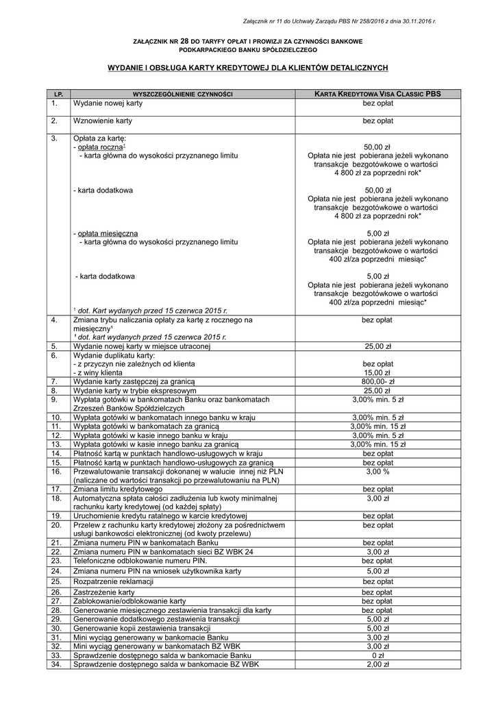 Załącznik nr 11 do Uchwały Zarządu PBS Nr 258/2016 z dnia 30.11.2016 r. ZAŁĄCZNIK NR 28 DO TARYFY OPŁAT I PROWIZJI ZA CZYNNOŚCI BANKOWE PODKARPACKIEGO BANKU SPÓŁDZIELCZEGO WYDANIE I OBSŁUGA KARTY KREDYTOWEJ DLA KLIENTÓW DETALICZNYCH LP. WYSZCZEGÓLNIENIE CZYNNOŚCI 1. Wydanie nowej karty 2. Wznowienie karty 3. Opłata za kartę: - opłata roczna1 - karta główna do wysokości przyznanego limitu KARTA KREDYTOWA VISA CLASSIC PBS bez opłat bez opłat 50,00 zł Opłata nie jest pobierana jeżeli wykonano transakcje bezgotówkowe o wartości 4 800 zł za poprzedni rok* - karta dodatkowa 50,00 zł Opłata nie jest pobierana jeżeli wykonano transakcje bezgotówkowe o wartości 4 800 zł za poprzedni rok* - opłata miesięczna - karta główna do wysokości przyznanego limitu 5,00 zł Opłata nie jest pobierana jeżeli wykonano transakcje bezgotówkowe o wartości 400 zł/za poprzedni miesiąc* - karta dodatkowa 5,00 zł Opłata nie jest pobierana jeżeli wykonano transakcje bezgotówkowe o wartości 400 zł/za poprzedni miesiąc* dot. Kart wydanych przed 15 czerwca 2015 r. Zmiana trybu naliczania opłaty za kartę z rocznego na miesięczny¹ ¹ dot. kart wydanych przed 15 czerwca 2015 r. Wydanie nowej karty w miejsce utraconej Wydanie duplikatu karty: - z przyczyn nie zależnych od klienta - z winy klienta Wydanie karty zastępczej za granicą Wydanie karty w trybie ekspresowym Wypłata gotówki w bankomatach Banku oraz bankomatach Zrzeszeń Banków Spółdzielczych Wypłata gotówki w bankomatach innego banku w kraju Wypłata gotówki w bankomatach za granicą Wypłata gotówki w kasie innego banku w kraju Wypłata gotówki w kasie innego banku za granicą Płatność kartą w punktach handlowo-usługowych w kraju Płatność kartą w punktach handlowo-usługowych za granicą Przewalutowanie transakcji dokonanej w walucie innej niż PLN (naliczane od wartości transakcji po przewalutowaniu na PLN) Zmiana limitu kredytowego Automatyczna spłata całości zadłużenia lub kwoty minimalnej rachunku karty kredytowej (od każdej spłaty) Uruchomienie kredytu ratalnego w karcie kredytowej Przelew z rachunku karty kredytowej złożony za pośrednictwem usługi bankowości elektronicznej (od kwoty przelewu) Zmiana numeru PIN w bankomatach Banku Zmiana numeru PIN w bankomatach sieci BZ WBK 24 Telefoniczne odblokowanie numeru PIN. Zmiana numeru PIN na wniosek użytkownika karty Rozpatrzenie reklamacji Zastrzeżenie karty Zablokowanie/odblokowanie karty Generowanie miesięcznego zestawienia transakcji dla karty Generowanie dodatkowego zestawienia transakcji Generowanie kopii zestawienia transakcji Mini wyciąg generowany w bankomacie Banku Mini wyciąg generowany w bankomatach BZ WBK Sprawdzenie dostępnego salda w bankomacie Banku Sprawdzenie dostępnego salda w bankomacie BZ WBK 1 4. 5. 6. 7. 8. 9. 10. 11. 12. 13. 14. 15. 16. 17. 18. 19. 20. 21. 22. 23. 24. 25. 26. 27. 28. 29. 30. 31. 32. 33. 34. bez opłat 25,00 zł bez opłat 15,00 zł 800,00- zł 25,00 zł 3,00% min. 5 zł 3,00% min. 5 zł 3,00% min. 15 zł 3,00% min. 5 zł 3,00% min. 15 zł bez opłat bez opłat 3,00 % bez opłat 3,00 zł bez opłat bez opłat bez opłat 3,00 zł bez opłat 5,00 zł bez opłat bez opłat bez opłat bez opłat 5,00 zł 5,00 zł 3,00 zł 3,00 zł 0 zł 2,00 zł Załącznik nr 11 do Uchwały Zarządu PBS Nr 258/2016 z dnia 30.11.2016 r. 35. 36. Powtórne generowanie i wysyłka PIN na wniosek użytkownika Awaryjna wypłata gotówki za granicą 7,00 zł 500,00 zł