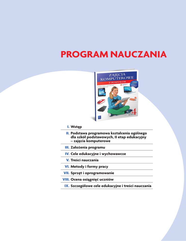 PROGRAM NAUCZANIA I.Wstęp II.Podstawa programowa kształcenia ogólnego dla szkół podstawowych, II etap edukacyjny – zajęcia komputerowe III.Założenia programu IV.Cele edukacyjne i wychowawcze V.Treści nauczania VI.Metody i formy pracy VII.Sprzęt i oprogramowanie VIII.Ocena osiągnięć uczniów IX.Szczegółowe cele edukacyjne i treści nauczania Program nauczania | Zajęcia komputerowe z pomysłem I. Wstęp Współczesny świat stawia przed młodymi ludźmi nowe wyzwania. Podstawowym czynnikiem rozwoju staje się informacja, a więc korzystanie z technologii informacyjnej jest niezbędne do życia w nowoczesnym społeczeństwie informacyjnym. Edukacja informatyczna, zgodnie z obowiązującą podstawą programową wychowania przedszkolnego oraz kształcenia ogólnego we wszystkich typach szkół1, rozpoczyna się w pierwszej klasie szkoły podstawowej. Na sposób realizacji programu zajęć komputerowych w klasach 4–6 niewątpliwy wpływ ma sposób zrealizowania podstawy programowej na poprzednim etapie edukacyjnym, na poziomie edukacji wczesnoszkolnej. Nauczyciel powinien zdiagnozować, w jakim stopniu uczniowie opanowali wymagane umiejętności. Bardzo ważne jest, aby w pracy nad realizacją materiału wykorzystane były wszelkie formy aktywności, wzbogacające lekcje różnorodne bodźce zwiększają szansę dotarcia do każdego ucznia. Program nauczania Zajęcia komputerowe z pomysłem jest związany z podręcznikiem dla ucznia, poradnikiem metodycznym dla nauczyciela oraz platformą e-learningową, na której zostaną umieszczone materiały dodatkowe w postaci ćwiczeń, testów, prezentacji multimedialnych oraz filmów. Jest on zgodny z podstawą programową kształcenia ogólnego na II etapie edukacji z przedmiotu zajęcia komputerowe. II. Podstawa programowa kształcenia ogólnego dla szkół podstawowych2 Kształcenie ogólne w szkole podstawowej tworzy fundament wykształcenia – szkoła stopniowo wprowadza uczniów w świat wiedzy, dbając o ich harmonijny rozwój intelektualny, etyczny, emocjonalny, społeczny i fizyczny. Proces ten ma na dwa etapy: a.I etap edukacyjny, obejmujący klasy I–III szkoły podstawowej – edukacja wczesnoszkolna, b. II etap edukacyjny, obejmujący klasy IV–VI szkoły podstawowej. Celem kształcenia ogólnego w szkole podstawowej jest: a.przyswojenie podstawowego zasobu wiadomości na temat faktów, zasad, teorii i praktyki, dotyczących przede wszystkim tematów i zjawisk bliskich doświadczeniom uczniów; b. zdobycie przez uczniów umiejętności wykorzystywania wiadomości podczas wykonywania zadań i rozwiązywania problemów; c.kształtowanie u uczniów postaw warunkujących sprawne i odpowiedzialne funkcjonowanie we współczesnym świecie. Do najważniejszych umiejętności zdobywanych przez ucznia w trakcie kształcenia ogólnego w szkole podstawowej należą: a.czytanie – rozumiane zarówno jako prosta czynność, jak i umiejętność rozumienia, wykorzystywania i przetwarzania tekstów w zakresie umożliwiającym zdobywanie wiedzy, rozwój emocjonalny, intelektualny i moralny oraz uczestnictwo w życiu społeczeństwa; b. myślenie matematyczne – umiejętność korzystania z podstawowych narzędzi matematyki w życiu codziennym oraz prowadzenia elementarnych rozumowań matematycznych; c.myślenie naukowe – umiejętność formułowania wniosków opartych na obserwacjach empirycznych dotyczących przyrody i społeczeństwa; umiejętność komunikowania się w języku ojczystym i w języku obcym, zarówno w mowie, jak i w piśmie; d.umiejętność posługiwania się nowoczesnymi technologiami informacyjno-komunikacyjnymi, również w celu wyszukiwania i korzystania z informacji; e. umiejętność uczenia się jako sposób zaspokajania naturalnej ciekawości świata, odkrywania swoich zainteresowań i przygotowania do dalszej edukacji; f. umiejętność pracy zespołowej. Podstawa programowa zamieszczona w Rozporządzeniu Ministra Edukacji Narodowej z dnia 23 grudnia 2008 r. http://bip.men.gov.pl/ index.php?option=com_content&view=article&id=221&catid=26&Itemid=49 2 Fragmenty załącznika nr 2 dotyczące zajęć komputerowych na II etapie kształcenia do Rozporządzenia Ministra Edukacji Narodowej z dnia 23 grudnia 2008 r. w sprawie podstawy programowej wychowania przedszkolnego oraz kształcenia ogólnego w poszczególnych typach szkół (Dziennik Ustaw z dnia 15 stycznia 2009 r. Nr 4, poz. 17). 1 12 II. Podstawa programowa Cele kształcenia – wymagania ogólne 1.B ezpieczne posługiwanie się komputerem i jego oprogramowaniem; świadomość zagrożeń i ograniczeń związanych z korzystaniem z komputera i internetu. 2.Komunikowanie się za pomocą komputera i technologii informacyjno-komunikacyjnych. 3.Wyszukiwanie i wykorzystywanie informacji z różnych źródeł; opracowywanie za pomocą komputera rysunków, motywów, tekstów, animacji, prezentacji multimedialnych i danych liczbowych. 4.Rozwiązywanie problemów i podejmowanie decyzji z wykorzystaniem komputera. 5.Wykorzystywanie komputera do poszerzania wiedzy i umiejętności z różnych dziedzin, a także do rozwijania zainteresowań. Treści nauczania – wymagania szczegółowe 1.Bezpieczne posługiwanie się komputerem i jego oprogramowaniem. Uczeń: a. komunikuje się z komputerem za pomocą ikon, przycisków, menu i okien dialogowych; b. odczytuje i prawidłowo interpretuje znaczenie komunikatów wysyłanych przez programy; c. prawidłowo zapisuje i przechowuje wyniki swojej pracy w komputerze i na nośnikach elektronicznych, a następnie korzysta z nich; d. korzysta z pomocy dostępnej w programach; e. posługuje się podstawowym słownictwem informatycznym; f. przestrzega podstawowych zasad bezpiecznej i higienicznej pracy na komputerze, wyjaśnia zagrożenia wynikające z niewłaściwego korzystania z komputera. 2.Komunikowanie się za pomocą komputera i technologii informacyjno-komunikacyjnych. Uczeń: a. komunikuje się za pomocą poczty elektro