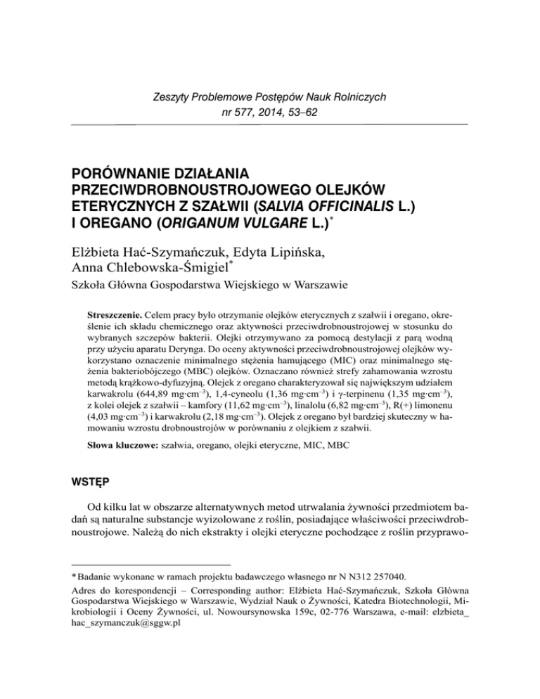 Zeszyty Problemowe Postępów Nauk Rolniczych nr 577, 2014, 53–62 PORÓWNANIE DZIAŁANIA PRZECIWDROBNOUSTROJOWEGO OLEJKÓW ETERYCZNYCH Z SZAŁWII (SALVIA OFFICINALIS L.) I OREGANO (ORIGANUM VULGARE L.)* Elżbieta Hać-Szymańczuk, Edyta Lipińska, Anna Chlebowska-Śmigiel* Szkoła Główna Gospodarstwa Wiejskiego w Warszawie Streszczenie. Celem pracy było otrzymanie olejków eterycznych z szałwii i oregano, określenie ich składu chemicznego oraz aktywności przeciwdrobnoustrojowej w stosunku do wybranych szczepów bakterii. Olejki otrzymywano za pomocą destylacji z parą wodną przy użyciu aparatu Derynga. Do oceny aktywności przeciwdrobnoustrojowej olejków wykorzystano oznaczenie minimalnego stężenia hamującego (MIC) oraz minimalnego stężenia bakteriobójczego (MBC) olejków. Oznaczano również strefy zahamowania wzrostu metodą krążkowo-dyfuzyjną. Olejek z oregano charakteryzował się największym udziałem karwakrolu (644,89 mg·cm–3), 1,4-cyneolu (1,36 mg·cm–3) i γ-terpinenu (1,35 mg·cm–3), z kolei olejek z szałwii – kamfory (11,62 mg·cm–3), linalolu (6,82 mg·cm–3), R(+) limonenu (4,03 mg·cm–3) i karwakrolu (2,18 mg·cm–3). Olejek z oregano był bardziej skuteczny w hamowaniu wzrostu drobnoustrojów w porównaniu z olejkiem z szałwii. Słowa kluczowe: szałwia, oregano, olejki eteryczne, MIC, MBC WSTĘP Od kilku lat w obszarze alternatywnych metod utrwalania żywności przedmiotem badań są naturalne substancje wyizolowane z roślin, posiadające właściwości przeciwdrobnoustrojowe. Należą do nich ekstrakty i olejki eteryczne pochodzące z roślin przyprawo- * Badanie wykonane w ramach projektu badawczego własnego nr N N312 257040. Adres do korespondencji – Corresponding author: Elżbieta Hać-Szymańczuk, Szkoła Główna Gospodarstwa Wiejskiego w Warszawie, Wydział Nauk o Żywności, Katedra Biotechnologii, Mikrobiologii i Oceny Żywności, ul. Nowoursynowska 159c, 02-776 Warszawa, e-mail: elzbieta_ [email protected] 54 E. Hać-Szymańczuk, E. Lipińska, A. Chlebowska-Śmigiel wych. Olejki eteryczne to wieloskładnikowe mieszaniny lotnych związków chemicznych wyodrębniane metodą destylacji z parą wodną. Zawierają one od kilkudziesięciu do kilkuset składników i są to głównie monoterpenoidy, alkohole, aldehydy, ketony, fenole i ich pochodne oraz inne lotne związki [Dorman i Deans 2000, Justesen i Knuthsen 2001, Lambert i in. 2001, Souza i in. 2006, Fasseas i in. 2007, Wroniak i Ratusz 2011, Góra i Lis 2012, Generalić Mekinić i in. 2014]. Szacuje się, że w naturze występuje 18 tysięcy olejkodajnych gatunków roślin, na skalę przemysłową produkuje się około 300 olejków, a wykorzystuje się tylko kilkadziesiąt z nich. Do roślin, które są wykorzystywane jako przyprawy i z których pozyskuje się olejki zaliczane są m.in. szałwia i oregano [Góra i Lis 2012]. Ze względu na właściwości przeciwzapalne i przeciwbakteryjne, szałwia oraz preparaty z niej otrzymywane od stuleci znajdują zastosowanie w medycynie i farmacji. Szałwia działa na szerokie spektrum bakterii i grzybów, między innymi na gatunki: Escherichia coli, Listeria monocytogenes, Salmonella infantis, Staphylococcus aureus, Campylobacter coli, Proteus vulgaris, Bacillus cereus, Aspergillus flavus oraz drobnoustroje należące do rodzajów Enterobacter, Candida, Saccharomyces i Fusarium. Głównymi związkami chemicznymi, odpowiadającymi za powyższe właściwości szałwii, są: α-pinen, eukaliptol (1,8-cineol), borneol, kwas karnozolowy, karnozol oraz kamfora. Są to związki, które wchodzą również w skład olejków eterycznych z szałwii [Dorman i Deans 2000, Marino i in. 2001, Tepe i in. 2004, Hayouni i in. 2008, Kelen i Tepe 2008, Kozłowska i Ścibisz 2011, Generalić Mekinić i in. 2014]. Również oregano, ze względu na swoje właściwości wykrztuśne, rozkurczające i gojące, wykorzystywane jest w medycynie. Jako przyprawa wzbogaca smak zup, jarzyn, pomidorów oraz potraw mięsnych, drobiu, kiełbas i tłustych sosów. Dodawane jest również do pizzy, zapiekanek i spaghetti. Ziele oregano zawiera do 3% olejku eterycznego, którego głównymi składnikami są karwakrol, tymol, p-cymen i γ-terpinen. Związki te wykazują działanie przeciwdrobnoustrojowe w stosunku do bakterii Salmonella typhimurium, Staphylococcus aureus, Enterococcus faecalis, Escherichia coli i Yersinia entrocolitica oraz grzybów Saccharomyces cerevisiae, Rhizopus oryzae i Aspergilllus niger [Justesen i Knuthsen 2001, Özcan i Erkman 2001, Burt 2004, Busatta i in. 2007, Generalić Mekinić i in. 2014]. Celem pracy było otrzymanie olejków eterycznych z szałwii i oregano, określenie ich składu chemicznego oraz aktywności przeciwdrobnoustrojowej w stosunku do wybranych szczepów bakterii. MATERIAŁ I METODY W procesie ekstrakcji olejków eterycznych świeże liście szałwii i oregano rozdrabniano, zalewano wodą i poddawano destylacji w aparacie Derynga do otrzymywania olejków eterycznych firmy Simax [Białecka-Florjańczyk i Włostowska 2007]. Ochłodzony destylat czterokrotnie ekstrahowano chlorkiem metylenu w rozdzielaczu, a następnie usuwano wodę, dodając bezwodny siarczan magnezu. Rozpuszczalnik odparowywano w temperaturze 30°C i pod ciśnieniem 540–560 hPa w wyparce laboratoryjnej z regulowanym ciśnieniem firmy Büchi Labortechnik AG (Flawil, Szwajcaria). Wydajność Zeszyty Problemowe Postępów Nauk Rolniczych Porównanie działania przeciwdrobnoustrojowego olejków eterycznych... 55 procesu wynosiła ok. 30 mg ze 150 g surowca roślinnego. Olejki przechowywano w temperaturze 4°C w butelkach z ciemnego szkła. W celu oznaczenia i identyfikacji wybranych na podstawie danych literaturowych [Burt 2004, Longaray Delamare i in. 2007, Karabagias i in. 2011] związków lotnych z olejków wykorzystano chromatograf gazowy z detektorem FID (Perkin Elmer, Autosystem XL). Warunki prowadzenia rozdziału były następujące: kolumna HP-5 (30