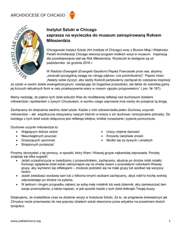 Instytut Sztuki w Chicago zaprasza na wycieczka do muzeum zainspirowaną Rokiem Miłosierdzia Chicagowski Instytut Sztuki (Art Institute of Chicago) wraz z Biurem Misji i Witalności Parafii Archidiecezji Chicago stworzył program krótkich wizyt w muzeum. Inspiracją dla przedsięwzięcia stał się Rok Miłosierdzia. Wycieczki te dostępne są od pażdziernika do grudnia 2016 r. W Radości Ewangelii (Evangelii Gaudium) Papież Franciszek prosi nas, abyśmy „zwracali szczególną uwagę na «drogę piękna» (via pulchritudinis)”. Papież mówi: „Należy sobie życzyć, aby każdy Kościół partykularny zachęcał do czerpania inspiracji ze sztuki w swoim dziele ewangelizacyjnym, nawiązując do bogactwa przeszłości, ale także do szerokiej gamy jej licznych aktualnych form w celu przekazywania wiary w nowym «języku przypowieści»” ( por. Nr 167). Mamy nadzieję, że piękno tych dzieł pobudzi Was do modlitewnej refleksji nad duchowymi dziełami miłosierdzia i spotkaniem z żywym Chrystusem, w wyniku czego zaprosicie inne osoby do przejścia tą drogą. Zachęcamy do obejrzenia siedmiu dzieł sztuki. Każde z nich odzwierciedla jeden Duchowy uczynek miłosierdzia – akt współczucia okazywany naszym bliźnim w trosce o ich duchowe i emocjonalne potrzeby. Do każdego z tych dzieł sztuki dołączona jest refleksja biblijna, krótkie rozważanie i pytania pomocnicze. Duchowe uczynki miłosierdzia to: Wątpiącym dobrze radzić Nieumiejętnych pouczać Grzeszących upominać Strapionych pocieszać Urazy chętnie darować Krzywdy cierpliwie znosić Modlić się za żywych i umarłych Prosimy skorzystać z tej pomocy, w sposób, który Wam i Waszej grupie najbardziej odpowiada. Poniżej znajduje się kilka sugestii: Jeżeli uczestniczycie w zwiedzaniu z przewodnikiem, zachęcamy, abyście po drodze robili notatki. Kończąc oglądanie dzieł sztuki zatrzymajcie się na chwilę razem z pozostałymi członkami Waszej grupy, aby wymienić się refleksjami – możecie podzielić się na małe grupy lub spotkać się wszyscy razem. Jeżeli zwiedzasz wystawę sam lub z kilkoma innymi osobami zachęcamy, abyś robił to trochę wolniej odpowiadając po drodze na pytania. W jednym i drugim przypadku zabierz ze sobą mały notatnik lub swój dziennik, aby zamieszczać tam swoje przemyślenia, a także napisać, w jaki sposób każde z tych dzieł dotknęło Twojej duszy. Dziękujemy, że znaleźliście czas na złożenie wizyty w Instytucie Sztuki. Za to, że pragniecie doświadczyć jak Chrystus może przemawiać do nas poprzez dziełach sztuki stworzone przez artystów na przestrzeni dwóch tysiącleci. www.jubileemercy.org 1 Uwaga: Poniższe refleksje powinny być używane łącznie z miniprzewodnikiem Instytutu Sztuki (Art Institute Mini-Tour Guide), który zawiera opis każdego dzieła sztuki. Prosimy, aby zapoznać się z opisem znajdującym się w Waszym folderze, by lepiej zrozumieć każde z dzieł i wizję artysty. Modlitwa rozpoczynająca zwiedzanie: Jezu, dziękuję Ci za ten dzień i możliwość przejścia „drogi piękna”, aby odnaleźć Cię we wszystkim co widzimy i czego doświadczamy w tej galerii. Prosimy, ześlij swego Ducha, by otworzył nasze serca, umysły i dusze na artystów, których dzieła będziemy oglądać i sposób w jaki próbują do nas przemawiać swoimi darami i talentami. Prosimy Cię o pomoc do głębszego zrozumienia Duchowych uczynków miłosierdzia, abyśmy zabrali z sobą to miejsce i te doświadczenia, niosąc Twoje miłosierdzie wszystkim, których spotkamy. Prosimy o to Ciebie, który żyjesz i królujesz z Ojcem w jedności Ducha Świętego, jeden Bóg przez wszystkie wieki wieków. Amen. Galeria 211 Skruszony św. Piotr (Penitent Saint Peter) (1628/32 r.) autorstwa Jusepe de Ribera (zobacz pełny opis w miniprzewodniku Instytutu Sztuki) Refleksja biblijna: „A Pan obrócił się i spojrzał na Piotra. Wspomniał Piotr na słowo Pana, jak mu powiedział: «Dziś, zanim kogut zapieje, trzy razy się Mnie wyprzesz». Wyszedł na zewnątrz i gorzko zapłakał” (Łk 22, 6162). Uczynek miłosierdzia względem duszy: Urazy chętnie darować. W tym momencie św. Piotr zrozumiał, że zawiódł. Zrobił dokładnie to co zapowiedział Jezus. Zaparł się, że znał Jezusa, że był Jego przyjacielem, że Jezus mu ufał. Nie zrobił tego raz, ale trzy razy. Piotr nigdy nie przypuszczał, że kiedykolwiek mógłby zaprzeć się Jezusa. Ale Jezus znał siłę z jaką lęk może nami zawładnąć, wiedział co lęk może zrobić z Jego najbliższym przyjacielem i najbardziej zaufanym uczniem. Jezus zna również nasze upadki. On wie, że próbujemy powstawać i mamy jak najlepsze intencje, ale czasem Go zawodzimy. Jednak Jezus zawsze przychodzi do nas z przebaczeniem, bez względu na to ile razy się Go zapieramy. Zatrzymaj się na wyrazie twarzy Piotra. Co dzieje się w jego umyśle? O co prosi Boga? Czy kiedykolwiek czułeś to, co Piotr czuje w tym momencie? Czy prosiłeś kiedyś Boga lub kogoś innego o przebaczenie? Jaki rodzaj siły lub odwagi jest potrzebny, by poprosić o przebaczenie? Czy są w Twoim życiu ludzie, którzy potrzebują przebaczenia nawet, jeśli nie są w stanie o nie poprosić? Jeśli tak jest, to czy pomodlisz się o łaskę przebaczenia tym, którzy Cię zranili, skrzywdzili lub wyrządzili Ci krzywdę? Jezu, tak jak przebaczyłeś Piotrowi, proszę pomóż mi przebaczyć tym, którzy mnie zranili. Nie potrafię tego zrobić sam. Proszę, daj mi siłę, abym szukał przebaczenia i przebaczył innym jako wyraz okazywania bliźnim Twojego miłosierdzia. www.jubileemercy.org 2 Galeria 211 Ukrzyżowanie (1627 r.) autorstwa Francisca de Zurbarána Refleksja biblijna: „Lecz On był przebity za nasze grzechy, zdruzgotany za nasze winy. Spadła Nań chłosta zbawienna dla nas, a w Jego ranach jest nasze zdrowie” (Iz 53, 5). Uczynek miłosierdzia względem duszy: Krzywdy cierpliwie znosić. W Ewangelii św. Łukasza sc