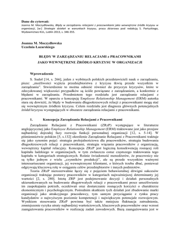 Dane do cytowań: Joanna M. Moczydłowska, Błędy w zarządzaniu relacjami z pracownikami jako wewnętrzne źródło kryzysu w organizacji, [w:] Strategie działań w warunkach kryzysu, praca zbiorowa pod redakcją S. Partyckiego, Wydawnictwo KUL, Lublin 2013, s. 346-355. Joanna M. Moczydłowska Uczelnia Łazarskiego BŁĘDY W ZARZĄDZANIU RELACJAMI z PRACOWNIKAMI JAKO WEWNĘTRZNE ŹRÓDŁO KRYZYSU W ORGANIZACJI Wprowadzenie S. Sudoł [14, s. 266], jeden z wybitnych polskich przedstawicieli nauk o zarządzaniu, pisze: „możliwości wyjścia przedsiębiorstwa z kryzysu tkwią przede wszystkim w zarządzaniu”. Stwierdzenie to można odnieść również do przyczyn kryzysów, które w zdecydowanej większości przypadków są ściśle powiązane z zarządzaniem, a konkretnie z błędami w zarządzaniu. Przedmiotem tego rozdziału jest zarządzanie relacjami z pracownikami. W oparciu o koncepcję Employee Relationship Management (ERM) autorka stara się dowieźć, że błędy w budowaniu długookresowych relacji z pracownikami mogą stać się wewnętrznym źródłem kryzysu. Celem rozdziału jest diagnoza głównych potencjalnych źródeł kryzysu występujących w obszarze zarządzania relacjami z pracownikami. 1. Koncepcja Zarządzania Relacjami z Pracownikami Zarządzanie Relacjami z Pracownikami (ZRzP) występujące w literaturze anglojęzycznej jako Employee Relationship Management (ERM) traktowane jest jako przejaw najbardziej dojrzałej fazy rozwoju funkcji personalnej organizacji [12, s. 5-14]. W piśmiennictwie polskim [5, s.132] określenie Zarządzanie Relacjami z Pracownikami traktuje się jako synonim pojęć: strategia prolojalnościowa dla pracowników, strategia budowania długookresowych relacji z pracownikami, strategia wiązania pracowników z organizacją, wewnętrzny kapitał relacyjny. Koncepcja ZRzP jest logiczną konsekwencją rosnącej roli kapitału ludzkiego w organizacjach, w tym zwłaszcza coraz częstszego traktowania tego kapitału w kategoriach strategicznych. Rośnie świadomość menedżerów, że pracownicy nie są tylko jednym z wielu „czynników produkcji”, ale są przede wszystkim ważnymi interesariuszami organizacji, jej wewnętrznymi klientami, o których trzeba dbać, ponieważ odgrywają kluczową rolę w osiąganiu celów przedsiębiorstw i innych podmiotów. Teoria ZRzP nierozerwalnie łączy się z pojęciem behawioralnej dźwigni sukcesów organizacji traktując postawy pracowników w kategoriach najważniejszej determinanty jej wartości [2, s. 280]. Istotą ZRP jest podejmowanie decyzji i działań personalnych ukierunkowanych na budowanie długotrwałych relacji z pracownikami przez umożliwienie im zaspokajania potrzeb, oczekiwań oraz dostarczanie rosnących korzyści o charakterze ekonomicznym i psychologicznym. Pośrednim skutkiem tych działań jest zbudowanie marki organizacji jako atrakcyjnego pracodawcy, tym samym przyciąganie z rynku pracy kandydatów o najwyższym poziomie kompetencji i największym potencjale rozwojowym. Wynikiem stosowania ZRzP powinna być także mniejsza fluktuacja zatrudnienia, zmniejszenie ryzyka utraty najbardziej wartościowych, kluczowych pracowników oraz wzrost zaangażowania pracowników w realizację zadań zawodowych. Bazą zaangażowania jest w tym ujęciu lojalność pracowników wobec pracodawcy. Efektem profesjonalnie wdrożonej strategii personalnej opartej na ZRzP jest wzrost wartości kapitału ludzkiego i tym samym wzrost wartości całej organizacji. To co różni koncepcję Zarządzania Relacjami z Pracownikami od innych, na przykład Zarządzania Talentami czy Zarządzania Kompetencjami Zawodowymi, to zwrócenie uwagi na emocjonalny kontekst relacji pracownika i pracodawcy. Wysoka efektywność pracy ma być osiągnięta dzięki budowaniu relacji opartych na emocjonalnym przywiązaniu i zaangażowaniu pracownika. Nie chodzi zatem tylko o wymiar behawioralny polegający na „trwaniu” w organizacji, ale przede wszystkim o wymiar emocjonalny przejawiający się w postaci specyficznej sympatii, czyli pozytywnego nastawienia do pracodawcy. Taki stan możliwy jest do osiągnięcia dzięki daleko idącej indywidualizacji oddziaływań motywacyjnych. Odpowiedzialny pracodawca ma świadomość, że nie tylko pieniądze są motywatorem decydującym o wyborze miejsca pracy oraz o jakości tej pracy. Indywidualizacja może się wyrażać w postaci organizacji pracy uwzględniającej potrzeby i oczekiwania pracownika wynikające z wieku, płci, sytuacji rodzinnej, zdrowotnej itp. Jasne określenie zasad obowiązujących w firmie, zapewnienie równowagi między pracą zawodową a życiem osobistym oraz przyjazna atmosfera, to także czynniki istotne w budowaniu i podtrzymywaniu satysfakcji pracowników. Zastosowana przez pracodawcę indywidualizacja może dotyczyć również uelastycznienia czasu i/lub miejsca wykonywania pracy, tempa doskonalenia kompetencji zawodowych, zapewnienia opieki nad dziećmi. Jakość relacji pracowników i pracodawcy szczególnie uwidacznia się w sytuacjach kryzysowych. To właśnie różnorodne trudności i problemy pojawiające się w organizacji są prawdziwym testem dla siły i jakości wewnętrznych relacji. Organizacja znajdująca się w kryzysie stanowi zwykle mało atrakcyjne (lub mniej atrakcyjne niż dotychczas) miejsce pracy. Kontynuowanie przez pracownika pracy na rzecz dotychczasowego pracodawcy (mimo iż z powodu kryzysu nie spełnia już kryteriów dobrego pracodawcy) traktowane jest jako ważny wskaźnik lojalności. I nie chodzi tu wyłącznie o tzw. lojalność bierną, czyli nieopuszczenie organizacji z powodu braku innych możliwości zatrudnienia, ale o lojalność konstruktywną, czyli o sytuację, w której pracownik nadal z zaangażowaniem pracuje na rzecz organizacji, mimo możliwości podjęcia pracy u innego pracodawcy na korzystniejszych warunkach. 2. Kryzys w organizacji jako wzywanie dla zarządzania Kryzys może być postrzegany ja