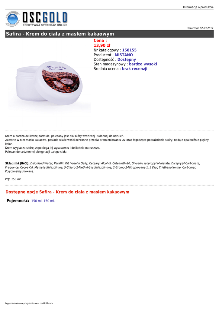 Informacje o produkcie Utworzono 02-03-2017 Safira - Krem do ciała z masłem kakaowym Cena : 13,90 zł Nr katalogowy : 158155 Producent : MISTANO Dostępność : Dostępny Stan magazynowy : bardzo wysoki Średnia ocena : brak recenzji Krem o bardzo delikatnej formule, polecany jest dla skóry wrażliwej i skłonnej do uczuleń. Zawarte w nim masło kakaowe, posiada właściwości ochronne przeciw promieniowaniu UV oraz łagodzące podrażnienia skóry, nadaje opaleniźnie piękny kolor. Krem wygładza skórę, zapobiega jej wysuszeniu i delikatnie natłuszcza. Polecan do codziennej pielęgnacji całego ciała. Składniki (INCI): Deionized Water, Paraffin Oil, Vazelin Gelly, Cetearyl Alcohol, Ceteareth-20, Glycerin, Isopropyl Myristate, Dicaprylyl Carbonate, Fragrance, Cocoa Oil, Methylisothiazolinine, 5-Chloro-2-Methyl-3-Isothiazolinone, 2-Bromo-2-Nitropropane 1, 3 Diol, Triethanolamine, Carbomer, Polydimethylsiloxane. POJ. 150 ml Dostępne opcje Safira - Krem do ciała z masłem kakaowym Pojemność: 150 ml, 150 ml. Wygenerowano w programie www.oscGold.com