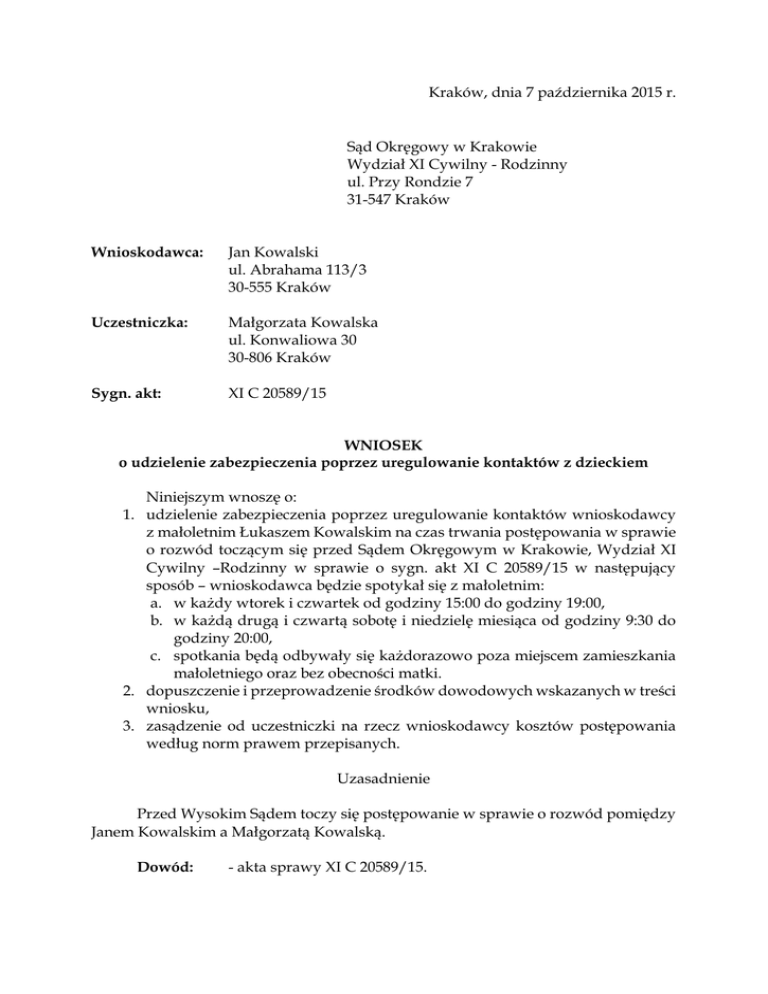 Kraków, dnia 7 października 2015 r. Sąd Okręgowy w Krakowie Wydział XI Cywilny - Rodzinny ul. Przy Rondzie 7 31-547 Kraków Wnioskodawca: Jan Kowalski ul. Abrahama 113/3 30-555 Kraków Uczestniczka: Małgorzata Kowalska ul. Konwaliowa 30 30-806 Kraków Sygn. akt: XI C 20589/15 WNIOSEK o udzielenie zabezpieczenia poprzez uregulowanie kontaktów z dzieckiem Niniejszym wnoszę o: 1. udzielenie zabezpieczenia poprzez uregulowanie kontaktów wnioskodawcy z małoletnim Łukaszem Kowalskim na czas trwania postępowania w sprawie o rozwód toczącym się przed Sądem Okręgowym w Krakowie, Wydział XI Cywilny –Rodzinny w sprawie o sygn. akt XI C 20589/15 w następujący sposób – wnioskodawca będzie spotykał się z małoletnim: a. w każdy wtorek i czwartek od godziny 15:00 do godziny 19:00, b. w każdą drugą i czwartą sobotę i niedzielę miesiąca od godziny 9:30 do godziny 20:00, c. spotkania będą odbywały się każdorazowo poza miejscem zamieszkania małoletniego oraz bez obecności matki. 2. dopuszczenie i przeprowadzenie środków dowodowych wskazanych w treści wniosku, 3. zasądzenie od uczestniczki na rzecz wnioskodawcy kosztów postępowania według norm prawem przepisanych. Uzasadnienie Przed Wysokim Sądem toczy się postępowanie w sprawie o rozwód pomiędzy Janem Kowalskim a Małgorzatą Kowalską. Dowód: - akta sprawy XI C 20589/15. Wnioskodawca wyprowadził się od wspólnie zajmowanego wraz z uczestniczką mieszkania dwa lata temu, tj. 01.09.2013 r. Od tej pory uczestniczka utrudniała wnioskodawcy spotkania z małoletnim synem. Pozwalała jedynie na odbieranie małoletniego ze szkoły we wtorki i czwartki ze względu na to, że samodzielnie nie była w stanie przyjeżdżać i zaopiekować się małoletnim z powodu przebywania w tych dniach popołudniami w pracy. Wszelkie próby spotkania się z małoletnim w weekendy lub pozostałe dni tygodnia spotykały się z odmową uczestniczki. Utrudnianie kontaktu uwidoczniło się także poprzez odebranie dziecku telefonu komórkowego, który otrzymał od wnioskodawcy z przeznaczeniem do kontaktu z nim. Od momentu wszczęcia postępowania w sprawie o rozwód tj. od dnia 08.08.2015 r. uczestniczka nie pozwala w ogóle na kontakt osobisty ani telefoniczny dziecka z wnioskodawcą. Wnioskodawca podejmując próby odbioru dziecka ze szkoły tak jak dotychczas, dowiedział się od nauczycielki, pani Renaty Palik, że dziecko we wtorki i czwartki przeważnie jest zwalniane wcześniej ze szkoły i odbierane przez siostrę uczestniczki. Z kolei gdy wnioskodawca próbował zabrać dziecko w okresie wakacyjnym na wyjazd weekendowy, uczestniczka wprost powiedziała mu, że w ramach zemsty za opuszczenie jej i wniesienie sprawy o rozwód nie zobaczy już nigdy więcej dziecka, czego świadkiem była matka uczestniczki Janina Nowak. Dowód: - zeznania świadka Renaty Palik (adres do doręczenia wezwania: Szkoła Podstawowa nr 70 w Krakowie, ul. Legionów 200, 30-824 Kraków), - zeznania świadka Janiny Nowak (adres do doręczenia wezwania: ul. Konwaliowa 30, 30-806 Kraków), - zeznania świadka Barbara Nowak (adres do doręczenia wezwania: ul. Macedońska 150, 30-638 Kraków), - na okoliczności utrudniania kontaktów wnioskodawcy z małoletnim przez uczestniczkę. Uprawdopodobnienie roszczenia wynika z regulacji art. 58 Kodeksu rodzinnego i opiekuńczego, który stanowi, że w wyroku orzekającym rozwód sąd rozstrzyga o kontaktach rodziców z dzieckiem. W związku z tym, że ta kwestia pomiędzy stronami postępowania rozwodowego jest sporna, rozstrzygnięcie w zakresie uregulowania kontaktów wnioskodawcy z małoletnim będzie miało miejsce w wyroku rozwodowym. Brak zabezpieczenia kontaktów w sprawie rozwodowej doprowadzi do utrudnienia lub uniemożliwienia wykonania części wyroku rozwodowego dotyczącego ustalenia kontaktów małoletniego z ojcem. Uczestniczka bowiem zakazując jakiegokolwiek porozumiewania się wnioskodawcy z małoletnim, doprowadzi do zaniku więzi między ojcem i synem, co sprawi, że małoletni nie będzie chciał widywać się z ojcem. Biorąc pod uwagę motywację matki, która stara się, aby wnioskodawca już nigdy nie zobaczył dziecka, istnieje duże prawdopodobieństwo negatywnego nastawiania dziecka przeciwko wnioskodawcy. Mając na uwadze powyższe, należy stwierdzić, że wnioskodawca posiada interes prawny w zabezpieczeniu kontaktów z dzieckiem. Podnoszę również, że wniosek powinien zostać rozpoznany niezwłocznie, ponieważ uniemożliwianie wnioskodawcy kontaktu z synem trwa już od dwóch miesięcy, w związku z czym każdy kolejny dzień wpływa negatywnie na relację ojca z synem. Jest to tym bardziej krzywdzące, że małoletni wyraża chęć spotkania się z ojcem i za każdym razem pyta nauczycielki, czy tata dziś po niego przyjdzie do szkoły. Dowód: - zeznania świadka Renaty Palik (adres do doręczenia wezwania: Szkoła Podstawowa nr 70 w Krakowie, ul. Legionów 200, 30-824 Kraków). Wobec powyższego wnoszę jak we wstępie. …………………………………… Jan Kowalski Załączniki: - odpis wniosku, - dowód uiszczenia opłaty od wniosku w wys. 40 zł.