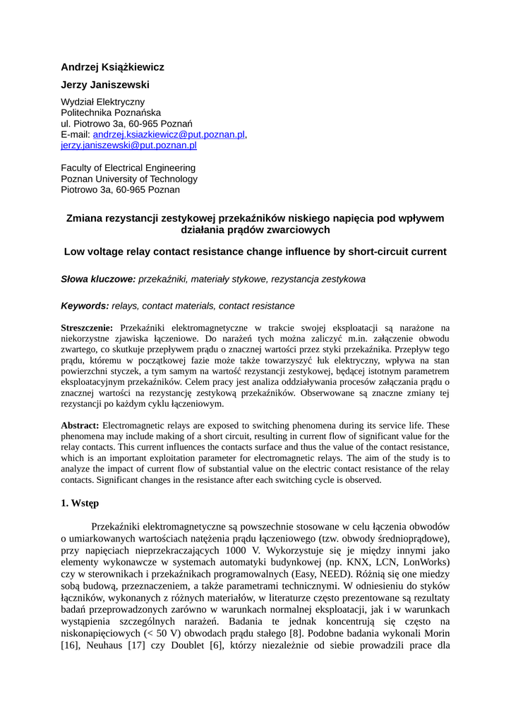 Andrzej Książkiewicz Jerzy Janiszewski Wydział Elektryczny Politechnika Poznańska ul. Piotrowo 3a, 60-965 Poznań E-mail: [email protected], [email protected] Faculty of Electrical Engineering Poznan University of Technology Piotrowo 3a, 60-965 Poznan Zmiana rezystancji zestykowej przekaźników niskiego napięcia pod wpływem działania prądów zwarciowych Low voltage relay contact resistance change influence by short-circuit current Słowa kluczowe: przekaźniki, materiały stykowe, rezystancja zestykowa Keywords: relays, contact materials, contact resistance Streszczenie: Przekaźniki elektromagnetyczne w trakcie swojej eksploatacji są narażone na niekorzystne zjawiska łączeniowe. Do narażeń tych można zaliczyć m.in. załączenie obwodu zwartego, co skutkuje przepływem prądu o znacznej wartości przez styki przekaźnika. Przepływ tego prądu, któremu w początkowej fazie może także towarzyszyć łuk elektryczny, wpływa na stan powierzchni styczek, a tym samym na wartość rezystancji zestykowej, będącej istotnym parametrem eksploatacyjnym przekaźników. Celem pracy jest analiza oddziaływania procesów załączania prądu o znacznej wartości na rezystancję zestykową przekaźników. Obserwowane są znaczne zmiany tej rezystancji po każdym cyklu łączeniowym. Abstract: Electromagnetic relays are exposed to switching phenomena during its service life. These phenomena may include making of a short circuit, resulting in current flow of significant value for the relay contacts. This current influences the contacts surface and thus the value of the contact resistance, which is an important exploitation parameter for electromagnetic relays. The aim of the study is to analyze the impact of current flow of substantial value on the electric contact resistance of the relay contacts. Significant changes in the resistance after each switching cycle is observed. 1. Wstęp Przekaźniki elektromagnetyczne są powszechnie stosowane w celu łączenia obwodów o umiarkowanych wartościach natężenia prądu łączeniowego (tzw. obwody średnioprądowe), przy napięciach nieprzekraczających 1000 V. Wykorzystuje się je między innymi jako elementy wykonawcze w systemach automatyki budynkowej (np. KNX, LCN, LonWorks) czy w sterownikach i przekaźnikach programowalnych (Easy, NEED). Różnią się one miedzy sobą budową, przeznaczeniem, a także parametrami technicznymi. W odniesieniu do styków łączników, wykonanych z różnych materiałów, w literaturze często prezentowane są rezultaty badań przeprowadzonych zarówno w warunkach normalnej eksploatacji, jak i w warunkach wystąpienia szczególnych narażeń. Badania te jednak koncentrują się często na niskonapięciowych (< 50 V) obwodach prądu stałego [8]. Podobne badania wykonali Morin [16], Neuhaus [17] czy Doublet [6], którzy niezależnie od siebie prowadzili prace dla podobnych materiałów stykowych, lecz dla obwodów niskonapięciowych o niewielkim natężeniu prądu stałego. Badania związane z procesami łączeniowymi w obwodach prądu przemiennego średniego napięcia koncentrują się na zakresach prądu od kilku do kilkunastu kA [1, 9]. Dostrzegalny jest brak badań w zakresie nisko- i średnioprądowych łączników prądu przemiennego przy prądach zbliżonych do normalnych warunków pracy oraz zwarciowych, które mogą występować w instalacjach elektrycznych niskiego napięcia, nieprzekraczających zwykle 1 kA. W zakresie modelowania prowadzone są badania symulacyjne dotyczące nagrzewania połączeń szyn i zestyków o skomplikowanych kształtach, konfiguracjach i wykorzystujących różnorodne materiały przewodzące [10]. Przekaźniki przeznaczone do łączenia obwodów odbiorczych narażone są na pewne niekorzystne procesy. Do zjawisk tych można zaliczyć łączenie prądów przeciążeniowych i zwarciowych, mogące prowadzić do skrócenia czasu eksploatacji przekaźników bądź, w skrajnych przypadkach, ich całkowitego uszkodzenia. W artykule opisano wpływ załączenia zwartych obwodów odbiorczych na zmianę rezystancji zestykowej. Zbadane zostały przekaźniki z trzema różnymi materiałami stykowymi. Rezystancja zestykowa łącznika elektroenergetycznego jest jego istotnym parametrem eksploatacyjnym. Ważne, aby rezystancja ta w okresie eksploatacji przekaźnika osiągała możliwie małe wartości, jednocześnie nie ulegała znacznym zmianom w czasie. Od jej wartości zależy między innymi dopuszczalne obciążenie robocze przekaźnika, związane z jego nagrzewaniem [15]. Wartość rezystancji zestykowej zależna jest od [7, 14]: – rezystancji kształtu Rk, – rezystancji warstw nalotowych Rn. Wypadkowa wartość rezystancji zestyku (przejścia) jest równa: (1) Rezystancja warstw nalotowych Rn jest trudna do ustalenia analitycznie, ponieważ zależy od wielu, czasem przypadkowych, czynników, w tym od: temperatury otoczenia, wilgotności, materiału stykowego. Rezystancja kształtu Rk zależy przede wszystkim od rezystywności i twardości materiału stykowego. Do jej opisu często stosowany jest model jednopunktowy z eliptycznymi, ekwipotencjalnymi liniami rozpływu prądu [5, 7]. Rzeczywista powierzchnia styczności jest znacznie mniejsza niż pozorna (nominalna) powierzchnia styczki. Model ten można uznać za słuszny, przy niewielkich siłach docisku styków stosowanych w przekaźnikach. Na wartość rezystancji zestyku wpływ ma materiał zastosowany na styczki. Stosowane mogą być styczki z czystych metali, w tym z: miedzi, srebra, złota, platyny, palladu, wolframu czy molibdenu. Częściej korzysta się ze stopów i spieków, takich jak: srebro-miedź, srebrokadm, srebro-pallad, srebro-tlenek kadmu, srebro-wolfram, srebro-nikiel, srebro-tlenek cyny [3]. Styczki mogą zostać pokryte dodatkową warstwą materiału, mającą na celu polepszenie ich niektórych właściwości (np. odporności na wędrówkę materiału). Stosowane są pokrycia z cyny, srebra lub złota