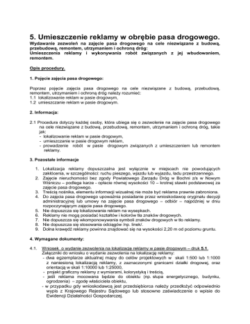 5. Umieszczenie reklamy w obrębie pasa drogowego. Wydawanie zezwoleń na zajęcie pasa drogowego na cele niezwiązane z budową, przebudową, remontem, utrzymaniem i ochroną dróg: Umieszczenia reklamy i wykonywania robót związanych z jej wbudowaniem, remontem. Opis procedury. 1. Pojęcie zajęcia pasa drogowego: Poprzez pojęcie zajęcia pasa drogowego na cele niezwiązane z budową, przebudową, remontem, utrzymaniem i ochroną dróg należy rozumieć: 1.1 lokalizowanie reklam w pasie drogowym, 1.2 umieszczanie reklam w pasie drogowym. 2. Informacja: 2.1 Procedura dotyczy każdej osoby, która ubiega się o zezwolenie na zajęcie pasa drogowego na cele niezwiązane z budową, przebudową, remontem, utrzymaniem i ochroną dróg, takie jak: - lokalizowanie reklam w pasie drogowym, - umieszczanie w pasie drogowym reklam, - prowadzenie robót w pasie drogowym związanych z umieszczeniem lub remontem reklamy. 3. Pozostałe informacje 1. Lokalizacja reklamy dopuszczalna jest wyłącznie w miejscach nie powodujących zakłócenia, w szczególności: ruchu pieszego, wjazdu lub wyjazdu, ładu przestrzennego. 2. Zajęcie nieruchomości bez zgody Powiatowego Zarządu Dróg w Bochni z/s w Nowym Wiśniczu – podlega karze - opłacie równej wysokości 10 – krotnej stawki podstawowej za zajęcie pasa drogowego. 3. Treścią nośnika, elementu informacji wizualnej nie może być reklama prawnie zabroniona. 4. Do zajęcia pasa drogowego upoważnia posiadanie przez wnioskodawcę oryginału decyzji administracyjnej lub umowy na zajęcie pasa drogowego – odbiór – najpóźniej w dniu rozpoczynającym zajęcie pasa drogowego. 5. Nie dopuszcza się lokalizowania reklam na wysepkach. 6. Reklamy nie mogą posiadać kształtów i kolorów tła znaków drogowych. 7. Nie dopuszcza się wkomponowywania symboli znaków drogowych w tło reklamy. 8. Nie dopuszcza się stosowania odciągów /np. linek/. 9. Dolna krawędź reklamy powinna znajdować się na wysokości 2,20 m od poziomu gruntu. 4. Wymagane dokumenty: 4.1. Wniosek o wydanie zezwolenia na lokalizację reklamy w pasie drogowym – druk 5.1. Załączniki do wniosku o wydanie zezwolenia na lokalizację reklamy: - dwa egzemplarze aktualnej mapy do celów projektowych w skali 1:500 lub 1:1000 z naniesioną lokalizacją reklamy, z zaznaczonymi granicami działki drogowej, oraz orientacją w skali 1:10000 lub 1:25000, - projekt graficzny reklamy z wymiarami, kolorystyką i treścią, - jeśli reklama mocowana będzie do obiektu (np. słupa energetycznego, budynku, ogrodzenia) – zgodę właściciela obiektu, - w przypadku gdy wnioskodawcą jest przedsiębiorca należy przedłożyć odpowiednio wypis z Krajowego Rejestru Sądowego lub stosowne zaświadczenie o wpisie do Ewidencji Działalności Gospodarczej. - pełnomocnictwo (jeżeli wnioskodawca reprezentowany będzie w postępowaniu przez pełnomocnika) z potwierdzeniem dokonania opłaty skarbowej w wysokości 17,00 zł. Wniosek o wydanie zezwolenia na umieszczenie reklamy lub przedłużenie zezwolenia na jej umieszczenie w pasie drogowym – druk 5.2. 1. Załączniki do wniosku o wydanie zezwolenia na umieszczenie reklamy: - szczegółowy plan sytuacyjny w skali 1:1000 lub 1:500, z zaznaczoną lokalizacją reklamy, z zaznaczeniem granic działki drogowej i podaniem wymiarów powierzchni reklamy (plus powierzchnię masztu, wspornika reklamy i powierzchnię rzutu stopy fundamentowej), - ogólny plan orientacyjny w skali 1:10 000 lub 1:25 000 z zaznaczeniem zajmowanego odcinka pasa drogowego, - oświadczenie o posiadaniu ważnego pozwolenia na roboty związane z umieszczeniem reklamy w pasie drogowym poza terenem zabudowanym lub zgłoszenia planowanych robót związanych z jej umieszczeniem w pasie drogowym w obszarze zabudowanym właściwemu organowi administracji architektoniczno budowlanej albo kserokopię ważnego pozwolenia na wykonanie robót lub kserokopię zgłoszenia robót związanych z realizacją powyższego, - w przypadku, gdy wnioskodawcą jest przedsiębiorca należy załączyć kserokopię aktualnego wypisu z ewidencji działalności gospodarczej lub kserokopię aktualnego wypisu z Krajowego Rejestru Sądowego (wydane nie wcześniej niż 6 miesięcy przed dniem złożenia wniosku - w przypadku dokumentów wydanych z datą wcześniejszą należy przedłożyć kserokopię aktualnie potwierdzoną przez właściwy organ administracyjny lub sąd). - w przypadku spółki cywilnej kserokopia umowy spółki zarejestrowanej we właściwym Urzędzie Skarbowym wraz z wypisem z ewidencji działalności gospodarczej wszystkich wspólników, - kopię decyzji – zezwolenia wydanego przez tut. Zarząd Dróg na lokalizację reklamy w pasie drogowym, - kopię wydanej przez tut. Zarząd Dróg pozytywnej opinii projektu budowlanego reklamy, opracowanego zgodnie z warunkami określonymi w decyzji - zezwoleniu, o której mowa powyżej (w przypadku konieczności opracowania projektu budowlanego podstawy reklamy). 2. Załącznik do wniosku o wydanie zezwolenia na przedłużenie zezwolenia na umieszczenie reklamy: - kopia uprzednio wydanej decyzji – zezwolenia na umieszczenie reklamy w pasie drogowym. Uwaga! Wniosek o przedłużenie zezwolenia na umieszczenie reklamy w pasie drogowym nie może być złożony później niż 30 dni przed upływem terminu ważności posiadanego zezwolenia. 4.2 4.3 Jeżeli umieszczenie w pasie drogowym reklamy jest związane z wykonywaniem prac budowlanych w pasie drogowym dodatkowo należy złożyć wniosek o wydanie zezwolenia na zajęcie pasa w celu prowadzenia robót. Wniosek o wydanie zezwolenia na wykonanie robót (montażu) związanych z umieszczeniem (remontem) reklamy w pasie drogowym – druk 5.3. Załączniki do wniosku o wydanie zezwolenia na wykonanie robót budowlanych związanych z umieszczeniem (remontem) reklamy w pasie drogowym: - szczegółowy plan sytuacyjny miejsca robót na podkładzie mapy sytuacyjno – wysokościowej w skali 1:1000 lub 1:500, z zazna