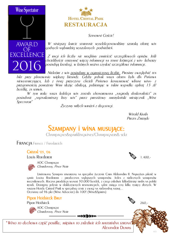 Szanowni Goście! W niniejszej karcie starannie wyselekcjonowaliśmy szeroką ofertę win godnych najbardziej wyszukanych podniebień. Z racji ich liczby nie mogliśmy zamieścić szczegółowych opisów. Jeśli chcielibyście otrzymać więcej informacji na temat któregoś z win- kelnerzy posiadają katalogi, w których można uzyskać szczegółowe informacje. Niektóre z win posiadamy w ograniczonej liczbie. Prosimy uwzględnić ten fakt przy planowaniu większej biesiady. Gdyby jednak nasza oferta była dla Państwa niewystarczająca, lub z innej przyczyny chcieli Państwo konsumować własne wina- z przyjemnością pomożemy Wam służąc obsługą, pobierając w takim wypadku opłatę 15 zł/ butelkę, za serwis. W tym roku nasza kolekcja win została uhonorowana „nagrodą doskonałości” za posiadanie „najznakomitszej listy win” przez prestiżowy amerykański miesięcznik „Wine Spectator” Życzymy miłych wrażeń z degustacji. Witold Kisała Prezes Zarządu Szampany i wina musujące: Champagnes&sparklingwines/Champagners& sekt Francja France / Frankreich Cristal '05, '06 Louis Roederer 1.400,- AOC Champagne Chardonnay, Pinot Noir Limitowany Szampan stworzony na specjalne życzenie Cara Aleksandra II. Najwyższa jakość w gamie Louisa Roederera - producenta najlepszych szampanów. Jeden z nielicznych szampanów rocznikowych. Roczna produkcja wynosi 30.000 butelek, z czego zaledwie kilkadziesiąt trafia na polski rynek. Dostępny jedynie w ekskluzywnych restauracjach, gdzie osiąga ceny kilku tysięcy złotych. W naszym Hotelu Cristal Park w specjalnej cenie z uwagi na niebanalną nazwę... Oceniany od 96 pkt (Wine Advocate) do 100! (Wine&Spirits) Piper Heidsieck Brut Piper Heidsieck 260,- AOC Champagne Chardonnay, Pinot Noir "Wino to duchowa część posiłku, mięsiwa to zaledwie ich materialna strona " Alexander Dumas 4.5 Hiszpania Spain / Spanien Codorniu Extra Semi-sec 85,- DO Cava Macabeo, Xarel.lo, Perellada, Chardonay Cava Palau Semi Seco Mont Marçal DO Cava Xarel.lo, Macabeo, Perellada 40,- Italia Italy/ Italien Prosecco Extra Dry Villa Gustianini Wino zakonu maltańskiego 70,- DOCG Asolo, Nervesa della Battaglia. Glera Polska Poland / Polen Cydr po Szampańsku Cider Dąbrowa Tarnowska, Cydr Jabłkowy 30,- Wina białe: White wines/ Weiss wein Polska Poland/ Polen Kernling '14 Winnica Pałac Mierzęcin 140,- Mierzęcin, Lubuskie, Kernling Riesling '14 Winnica Pałac Mierzęcin 140,- Mierzęcin, Lubuskie, Riesling Seyval Blanc '15 Winnica Turnau 100,- Baniewice, Banie, Zachodniopomorskie Seyval Blanc Hibernal '15 półsłodkie! Semisweet! Halbsüß! Winnica Turnau 100,- Baniewice, Banie, Zachodniopomorskie Hibernal "U dobrych ludzi odnajdziesz dobrą gościnę, dobre wino i dobre towarzystwo" - William Shakespeare 4.5 Cuvee Srebrna Góra '14 Srebrna Góra 13,- 90,- Bielany, Kraków, Małopolska, Polska Jahanniter, Hibernal, Gewurztraminer, Solaris Hibernal '14 Winnica Chodorowa 85,- Chodorowa, Pogórze Rożnowskie, Małopolska, Hibernal Europa Środkowa Central Europe / Mitteleuropa Riesling Smaragd Kellerberg '12 Domäne Wachau Wachau, Niederösterreich, Österreich Austria 160,- Riesling Traminer Classic półsłodkie! Semisweet! Halbsüß! '12 Wine Princess D.O.C. Miniş, Crișana, România Rumunia Traminer 75,- Tokaji Furmint '11 Zsirai Pinceszet 65,- Tokaji, Magyarország Węgry Furmint Veltlinske zelené '14 Chãteau Topolæianky 50- Kraj Nitrzańsky, Slovensko Słowacja Veltlinske zelené Francja France/ Frankreich Chateaneuf du Pape „La Bernardine” '08 M. Chapoutier 280,- AOC Chateaneuf- du- Pape Grenache White, Bourboulenc, Clairette Chablis 1-er Cru Les Vaudevey '12 Domaine Laroche 250,- AC Chablis 1-er Cru Vaudevey Chardonay "Wino to światło, zatrzymane przez wodę" -Galileusz 4.5 Mouton Cadet Reserve Blanc '07 Baron Philippe de Rotschild 120,- AC Graves Semillion, Sauvignon Blanc, Muscadelle Cotes du Rohne Blanc' '11 Louis Bernard 80,- AOC Cote du Rhone Granache Blanc, Bourboulenc, Marsanne, Viognier Gewürztraminer '12 Maison Boeckel Alsace 80,- Gewürztraminer Italia Italy/ Italien Friuliano '14 Rocca Bernarda Wino Zakonu Maltańskiego 65,- Rocca Bernarda, Friuli Colli Orientali DOC Friulano Orvieto Clasico '12 Cecchi 60,DOC Orvieto Grechetto, Blend wieloszczepowy Pecorino di Chieti '13 FeudoAntico 60,- IGP Chieti, Abruzzo Pecorino Hiszpania Spain/ Spanien Vina Esmeralda '14 Miguel Torres 80,- DO Catalunya Moscatel, Gewurztraminer Portugalia Portugal Redoma Branco Riserva '06 Nieport 280,- DOC Douro Rabigato, Codega, Donzelinho, Viosinho, Arinto oraz inne "Wyborne wino budzi entuzjazm, a cokolwiek robisz z entuzjazmem kończy się najczęściej sukcesem." - baron Phillippe De Rothschild 4.5 Ziemia Święta Israel Yarden Gewürztraminer '12 Golan Heights Winery 100,- Golan Heights Gewürztraminer Mount Hermon White '14 Golan Heights Winery 37,5 cl 45,- Golan Heights Chardonnay, Sauvignon blanc USA California USA California/ USA Californien Robert Mondavi Fume Blanc '08 Robert Mondavi Winery 180,- Napa Valley Sauvignon Blanc, Semillon Chile Chile Santa Digna Sauvignon Blanc '13 Miguel Torres 75,- Central Valley Sauvignon Blanc Tamaya Chardonnay Reserva '11 Vińa Casa Tamaya Limarí Valley, Chardonnay Argentyna 75,Coquimbo Argentina/ Argentinien Trivento Chardonnay Reserve '12 Trivento 75,- Mendoza Chardonnay Cristal Premium Selection (Lamita 2015) Bodega y Viºedos Mauricio Lorca Mendoza Chardonnay 8,- 50- "Wino otwiera serce na miłość. Chyba, że zbyt wiele go wypijesz. " - Owidiusz. 4.5 Wina czerwone: Red wines/ Rot wein Polska Poland/ Polen Regent Reserva '13 Winnica Pałac Mierzęcin 145,- Mierzęcin, Lubuskie, Regent Rondo '13 Winnica Pałac Mierzęcin 145,- Mierzęcin, Lubuskie, Rondo Novum Cuvee '13 Winnica Uniwerytetu Jagiellońskiego, Nad Dworskim Potokiem 110,- Łazy k/Bochni, Małopolska, Maréchal Foch, Leon Millot Rondo/Regent '14 Winnica Turnau 100,- Baniewice, Banie, Zachodniopomorskie, Rondo, Regent Regent '14 Srebrna Góra