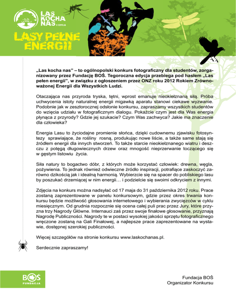 „Las kocha nas” – to ogólnopolski konkurs fotograficzny dla studentów, zorganizowany przez Fundację BOŚ. Tegoroczna edycja przebiega pod hasłem „Las pełen energii”, w związku z ogłoszeniem przez ONZ roku 2012 Rokiem Zrównoważonej Energii dla Wszystkich Ludzi. Otaczająca nas przyroda tryska, tętni, wprost emanuje nieokiełznaną siłą. Próba uchwycenia istoty naturalnej energii migawką aparatu stanowi ciekawe wyzwanie. Podobnie jak w zeszłorocznej odsłonie konkursu, zapraszamy wszystkich studentów do wzięcia udziału w fotograficznym dialogu. Pokażcie czym jest dla Was energia płynąca z przyrody? Gdzie jej szukacie? Czym Was zachwyca? Jakie ma znaczenie dla człowieka? Energia Lasu to życiodajne promienie słońca, dzięki cudownemu zjawisku fotosyntezy sprawiające, że rośliny rosną, produkując nowe liście, a także same stają się źródłem energii dla innych stworzeń. To także starcie nieokiełznanego wiatru i deszczu z potęgą długowiecznych drzew oraz mnogość nieprzerwanie toczącego się w gęstym listowiu życia. Siła natury to bogactwo dóbr, z których może korzystać człowiek: drewna, węgla, pożywienia. To jednak również odwieczne źródło inspiracji, potrafiące zaskoczyć zarówno dzikością jak i idealną harmonią. Wybierzcie się na spacer do pobliskiego lasu by poszukać drzemiącej w nim energii… i podzielcie się swoimi odkryciem z innymi. Zdjęcia na konkurs można nadsyłać od 17 maja do 31 października 2012 roku. Prace zostaną zaprezentowane w panelu konkursowym, gdzie przez okres trwania konkursu będzie możliwość głosowania internetowego i wybierania zwycięzców w cyklu miesięcznym. Od grudnia rozpocznie się ocena całej puli prac przez Jury, które przyzna trzy Nagrody Główne. Internauci zaś przez swoje finałowe głosowanie, przyznają Nagrodę Publiczności. Nagrody te w postaci wysokiej jakości sprzętu fotograficznego wręczone zostaną na Gali Finałowej, a najlepsze prace zaprezentowane na wystawie, dostępnej szerokiej publiczności. Więcej szczegółów na stronie konkursu www.laskochanas.pl. Serdecznie zapraszamy! Fundacja BOŚ Organizator Konkursu