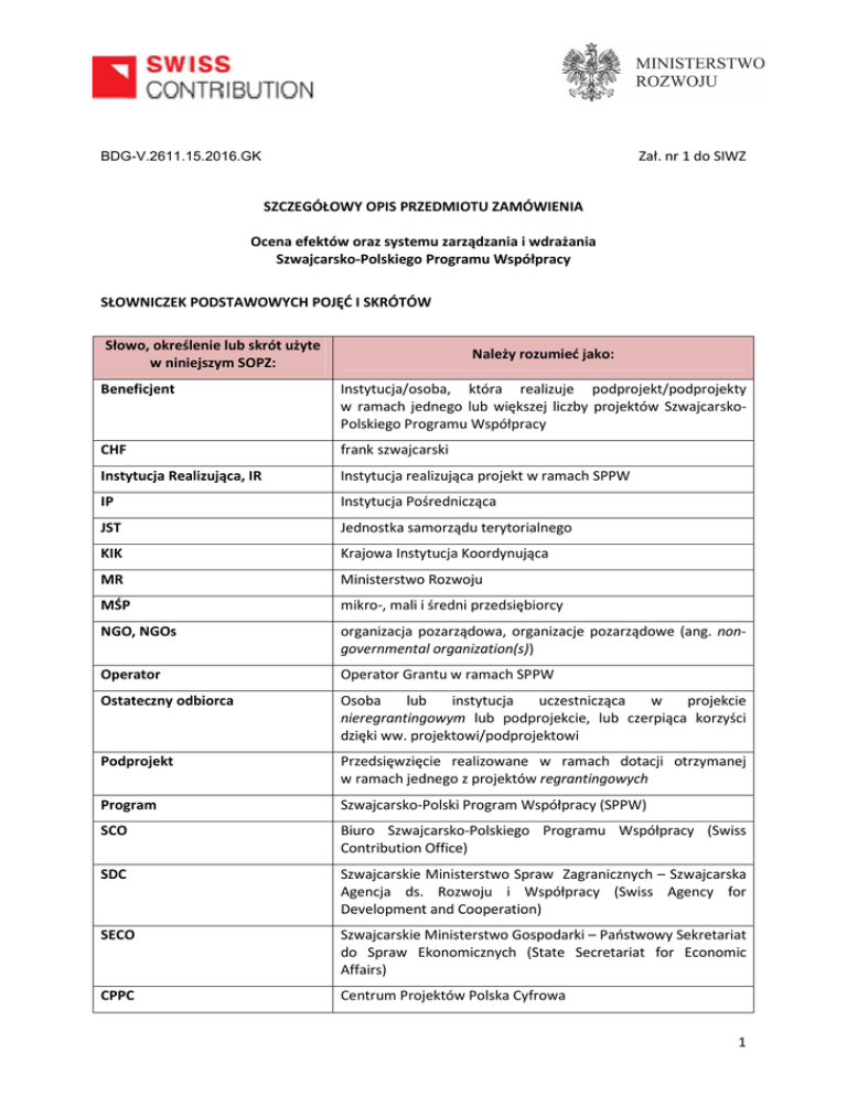 Zał. nr 1 do SIWZ BDG-V.2611.15.2016.GK SZCZEGÓŁOWY OPIS PRZEDMIOTU ZAMÓWIENIA Ocena efektów oraz systemu zarządzania i wdrażania Szwajcarsko-Polskiego Programu Współpracy SŁOWNICZEK PODSTAWOWYCH POJĘĆ I SKRÓTÓW Słowo, określenie lub skrót użyte w niniejszym SOPZ: Należy rozumieć jako: Beneficjent Instytucja/osoba, która realizuje podprojekt/podprojekty w ramach jednego lub większej liczby projektów SzwajcarskoPolskiego Programu Współpracy CHF frank szwajcarski Instytucja Realizująca, IR Instytucja realizująca projekt w ramach SPPW IP Instytucja Pośrednicząca JST Jednostka samorządu terytorialnego KIK Krajowa Instytucja Koordynująca MR Ministerstwo Rozwoju MŚP mikro-, mali i średni przedsiębiorcy NGO, NGOs organizacja pozarządowa, organizacje pozarządowe (ang. nongovernmental organization(s)) Operator Operator Grantu w ramach SPPW Ostateczny odbiorca Osoba lub instytucja uczestnicząca w projekcie nieregrantingowym lub podprojekcie, lub czerpiąca korzyści dzięki ww. projektowi/podprojektowi Podprojekt Przedsięwzięcie realizowane w ramach dotacji otrzymanej w ramach jednego z projektów regrantingowych Program Szwajcarsko-Polski Program Współpracy (SPPW) SCO Biuro Szwajcarsko-Polskiego Programu Współpracy (Swiss Contribution Office) SDC Szwajcarskie Ministerstwo Spraw Zagranicznych – Szwajcarska Agencja ds. Rozwoju i Współpracy (Swiss Agency for Development and Cooperation) SECO Szwajcarskie Ministerstwo Gospodarki – Państwowy Sekretariat do Spraw Ekonomicznych (State Secretariat for Economic Affairs) CPPC Centrum Projektów Polska Cyfrowa 1 SPPW Szwajcarsko-Polski Program Współpracy (Program) Umowa ramowa Umowa ramowa pomiędzy Rządem Rzeczypospolitej Polskiej a Szwajcarską Radą Federalną o wdrażaniu SzwajcarskoPolskiego Programu Współpracy w celu zmniejszenia różnic społeczno-gospodarczych w obrębie rozszerzonej Unii Europejskiej, podpisana w Bernie w dniu 20 grudnia 2007 r. 1. WPROWADZENIE 1.1. KONTEKST REALIZACJI BADANIA Niniejsze badanie ewaluacyjne dotyczy Szwajcarsko-Polskiego Programu Współpracy. Szwajcarska Rada Federalna w Memorandum of Understanding, podpisanym ze Wspólnotą Europejską w dniu 27 lutego 2006 r., wyraziła wolę, aby Szwajcaria przeznaczyła do 1 miliarda franków szwajcarskich na zmniejszenie różnic społeczno-gospodarczych w obrębie rozszerzonej UE. Niemal połowa z ww. kwoty, tj. ok. 489 mln CHF, przypadła Polsce w ramach Szwajcarsko-Polskiego Programu Współpracy, realizowanego na mocy Umowy ramowej pomiędzy Rządem Rzeczypospolitej Polskiej a Szwajcarską Radą Federalną, podpisanej w Bernie w dniu 20 grudnia 2007 r. Celem SPPW jest: • zmniejszenie różnic społeczno-gospodarczych pomiędzy Polską a wyżej rozwiniętymi państwami rozszerzonej UE; • zmniejszanie różnic na terytorium Polski pomiędzy ośrodkami miejskimi a regionami słabo rozwiniętymi pod względem strukturalnym, określonymi jako obszary tzw. koncentracji geograficznej. Zasada koncentracji geograficznej zakłada wykorzystanie co najmniej 40% środków w czterech województwach Polski południowo-wschodniej: lubelskim, małopolskim, podkarpackim i świętokrzyskim. Do obszarów priorytetowych SPPW i projektów1 realizowanych w jego ramach należą: I) Bezpieczeństwo, stabilność, wsparcie reform – w tym: 1) Inicjatywy na rzecz rozwoju regionalnego regionów peryferyjnych i słabo rozwiniętych; 2) Środki ochrony granic. II) Środowisko i infrastruktura – w tym: 3) Odbudowa, remont, przebudowa i rozbudowa podstawowej infrastruktury oraz poprawa stanu środowiska; 4) Bioróżnorodność i ochrona ekosystemów oraz wsparcie transgranicznych inicjatyw środowiskowych. III) Sektor prywatny – w tym: 5) Poprawa środowiska biznesowego i dostępu do kapitału dla mikro-, małych i średnich przedsiębiorstw (MŚP); 1 Poprzez projekt rozumie się również przedsięwzięcia, o których mowa w punkcie 3.1.b. Aneksu nr 1 do Umowy Ramowej pomiędzy Rządem RP a Szwajcarską Radą Federalną. 2 6) Rozwój sektora prywatnego i promocja eksportu MŚP. IV) Rozwój społeczny i zasobów ludzkich – w tym: 7) Ochrona zdrowia; 8) Badania i rozwój. V) Alokacje specjalne – w tym: 9) Grant Blokowy, w tym: Fundusz dla Organizacji Pozarządowych; Fundusz Partnerski; 10) Fundusz na Przygotowanie Projektów; 11) Zarządzanie Programem przez Szwajcarię; 12) Polski Fundusz Pomocy Technicznej. Główną instytucją po stronie polskiej odpowiedzialną za realizację SPPW jest Krajowa Instytucja Koordynująca (KIK), zarządzająca i sprawująca ogólny nadzór nad wykorzystaniem środków w ramach Programu. Jej funkcję pełni Ministerstwo Rozwoju, Departament Programów Pomocowych (dawniej – Ministerstwo Rozwoju Regionalnego, Departament Programów Pomocowych i Pomocy Technicznej). Ze strony Darczyńcy instytucją odpowiedzialną za wdrażanie Programu jest Biuro Szwajcarsko-Polskiego Programu Współpracy (SCO). Za poszczególne obszary tematyczne odpowiedzialne są Instytucje Pośredniczące/Operator Grantu Blokowego: • Środowisko, Infrastruktura, Rozwój Regionalny (1, 2, 3, 4) – Centrum Projektów Polska Cyfrowa; • Ochrona zdrowia (7) – Ministerstwo Zdrowia (do 31.12.2012 r. – Biuro ds. Zagranicznych Programów Pomocy w Ochronie Zdrowia); • Fundusz Stypendialny (8) – Konferencja Rektorów Uniwersytetów Szwajcarskich; Fundacja Rozwoju Systemu Edukacji; • Badania naukowe (8) – Ośrodek Przetwarzania Informacji; • Sektor prywatny: sprawozdawczość finansowa i audyt (5) – Ministerstwo Finansów; • Organizacje pozarządowe i programy partnerskie (9) – ECORYS Polska sp. z o.o.; • Sektor prywatny: kapitał podwyższonego ryzyka (5) – Krajowy Fundusz Kapitałowy S.A. (nie podlega ewaluacji); • Sektor prywatny: społeczna odpowiedzialność biznesu (6) – Polska Agencja Rozwoju Przedsiębiorczości. Za Fundusz na Przygotowanie Projektów (10) odpowiedzialne były następujące podmioty: Kraj