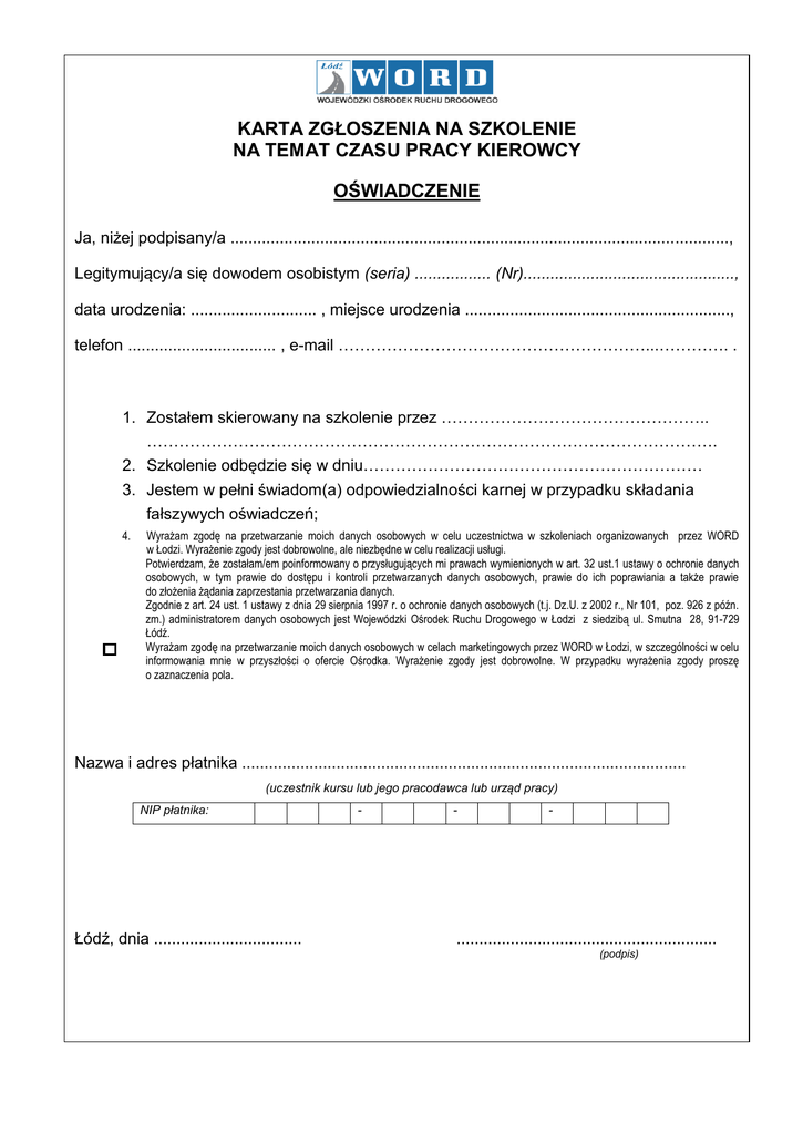 KARTA ZGŁOSZENIA NA SZKOLENIE NA TEMAT CZASU PRACY KIEROWCY OŚWIADCZENIE Ja, niżej podpisany/a ..............................................................................................................., Legitymujący/a się dowodem osobistym (seria) ................. (Nr)..............................................., data urodzenia: ............................ , miejsce urodzenia ..........................................................., telefon ................................. , e-mail …………………………………………………...…………. . 1. Zostałem skierowany na szkolenie przez ………………………………………….. ……………………………………………………………………………………………. 2. Szkolenie odbędzie się w dniu……………………………………………………… 3. Jestem w pełni świadom(a) odpowiedzialności karnej w przypadku składania fałszywych oświadczeń; 4. Wyrażam zgodę na przetwarzanie moich danych osobowych w celu uczestnictwa w szkoleniach organizowanych przez WORD w Łodzi. Wyrażenie zgody jest dobrowolne, ale niezbędne w celu realizacji usługi. Potwierdzam, że zostałam/em poinformowany o przysługujących mi prawach wymienionych w art. 32 ust.1 ustawy o ochronie danych osobowych, w tym prawie do dostępu i kontroli przetwarzanych danych osobowych, prawie do ich poprawiania a także prawie do złożenia żądania zaprzestania przetwarzania danych. Zgodnie z art. 24 ust. 1 ustawy z dnia 29 sierpnia 1997 r. o ochronie danych osobowych (t.j. Dz.U. z 2002 r., Nr 101, poz. 926 z późn. zm.) administratorem danych osobowych jest Wojewódzki Ośrodek Ruchu Drogowego w Łodzi z siedzibą ul. Smutna 28, 91-729 Łódź. Wyrażam zgodę na przetwarzanie moich danych osobowych w celach marketingowych przez WORD w Łodzi, w szczególności w celu informowania mnie w przyszłości o ofercie Ośrodka. Wyrażenie zgody jest dobrowolne. W przypadku wyrażenia zgody proszę o zaznaczenia pola. Nazwa i adres płatnika ................................................................................................... (uczestnik kursu lub jego pracodawca lub urząd pracy) NIP płatnika: Łódź, dnia ................................. - - - .......................................................... (podpis)