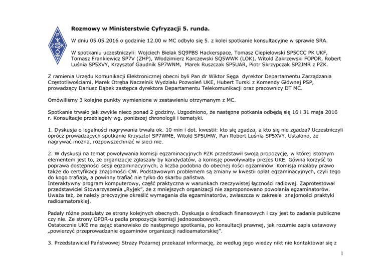 Rozmowy w Ministerstwie Cyfryzacji 5. runda. W dniu 05.05.2016 o godzinie 12.00 w MC odbyło się 5. z kolei spotkanie konsultacyjne w sprawie SRA. W spotkaniu uczestniczyli: Wojciech Bielak SQ9PBS Hackerspace, Tomasz Ciepielowski SP5CCC PK UKF, Tomasz Frankiewicz SP7V (ZHP), Włodzimierz Karczewski SQ5WWK (LOK), Witold Zakrzewski FOPOR, Robert Luśnia SP5XVY, Krzysztof Gaudnik SP7WNM, Marek Ruszczak SP5UAR, Piotr Skrzypczak SP2JMR z PZK. Z ramienia Urzędu Komunikacji Elektronicznej obecni byli Pan dr Wiktor Sęga dyrektor Departamentu Zarządzania Częstotliwościami, Marek Otręba Naczelnik Wydziału Pozwoleń UKE, Hubert Turski z Komendy Głównej PSP, prowadzący Dariusz Dąbek zastępca dyrektora Departamentu Telekomunikacji oraz pracownicy DT MC. Omówiliśmy 3 kolejne punkty wymienione w zestawieniu otrzymanym z MC. Spotkanie trwało jak zwykle nieco ponad 2 godziny. Uzgodniono, że następne potkania odbędą się 16 i 31 maja 2016 r. Konsultacje przebiegały wg. poniższej chronologii i tematyki. 1. Dyskusja o legalności nagrywania trwała ok. 10 min i dot. kwestii: kto się zgadza, a kto się nie zgadza? Uczestniczyli oprócz prowadzących spotkanie Krzysztof SP7WME, Witold SP5UHW, Pan Robert Luśnia SP5XVY. Ustalono, że nagrywać można, rozpowszechniać w sieci nie. 2. W dyskusji na temat powoływania komisji egzaminacyjnych PZK przedstawił swoją propozycję, w której istotnym elementem jest to, że organizacje zgłaszały by kandydatów, a komisję powoływałby prezes UKE. Gówna korzyść to poprawa dostępności sesji egzaminacyjnych, a liczba podobna do obecnej ilości egzaminów. Komisja miałaby prawo także do certyfikacji znajomości CW. Podstawowym problemem są zmiany w kwestii opłat egzaminacyjnych, czyli tego do kogo trafiają, a powinny trafiać nie tylko do skarbu państwa. Interaktywny program komputerowy, część praktyczna w warunkach rzeczywistej łączności radiowej. Zaprotestował przedstawiciel Stowarzyszenia „Ryjek”, że z mniejszych organizacji nie zaproponowano powołania egzaminatorów. Uważa też, że należy precyzyjne określić wymagania dla egzaminatorów, zwłaszcza w zakresie znajomości praktyki radioamatorskiej. Padały różne postulaty ze strony kolejnych obecnych. Dyskusja o środkach finansowych i czy jest to zadanie publiczne czy nie. Ze strony OPOR-u padła propozycja komisji jednoosobowych. Ostatecznie UKE ma zająć stanowisko do następnego spotkania, po konsultacji prawnej, jak rozumie zapis ustawowy „powierzyć przeprowadzanie egzaminów organizacji radioamatorskiej”. 3. Przedstawiciel Państwowej Straży Pożarnej przekazał informację, że według jego wiedzy nikt nie kontaktował się z 1 Komendantem Wojewódzkim i Komendantem Miejskim w Krakowie. Środowisko powinno zgłosić się do organizatorów ŚDM. Natomiast kwestia dostępności dla krótkofalowców kanału B112 zależy od MSWiA. 4. Ustawa prawo telekomunikacyjne nie rozdziela SRA i SRA Satelitarnej, ale UKE wydało pozwolenie klubowe w służbie radiokomunikacji amatorskiej satelitarnej, stwarzając tym samym niebezpieczny precedens. Nie wiadomo dlaczego wydaje się pozwolenia amatorskie instytucjom nieamatorskim. Zostało wydane pozwolenie klubowe na pracę przez satelitę BRITE. Przedstawiciele UKE stwierdzili, że jedyną możliwością, aby sterować satelitą było wydanie pozwolenia klubowego do pracy poprzez satelity. Przedstawiciele MC postanowili, że UKE ma na następnym spotkaniu zaproponować wyjście z tego precedensu. 5. Dalsza dyskusja dotyczyła jawności postępowania oraz decyzji wydawanych przez UKE. Na różne traktowanie podmiotów skarżyli się. W. Zakrzewski oraz R. Luśnia. Podniesiono również temat żądania dokumentów od krótkofalowców, wówczas gdy są one w archiwach UKE. Dotyczy to kopii świadectw operatorskich. 6. Przedstawiciel MC dokonał krótkiego podsumowania dotychczasowych spotkań: Większość uwag zgłoszonych przez organizacje uznano za przedyskutowane bez skutków dla ewentualnych zmian legislacyjnych. Jedynym przyjętym postulatem jest nowelizacja Krajowej Tablicy Przeznaczeń Częstotliwości w zakresie pasma 5 MHz, a rozszerzenia i zmiana limitów mocy w paśmie 70 MHZ ewentualnie do rozważenia w roku 2017. Do omówienia pozostają punkty 3, 6, 7, 8, 15, 16, 18. UKE zajmie stanowisko w sprawach punktów 23, 24 agendy, która stanowi załącznik do niniejszej wiadomości. Kolejne spotkania odbędą się 16 i 31 maja br. Marek Ruszczak SP5UAR i Piotr Skrzypczak SP2JMR Załącznik stanowi agenda spotkania na 5 maja br. pt. Postulaty środowiska radioamatorów po spotkaniu 18 kwietnia 2016 r. 2 Uwagi radioamatorów Lp. Zgł asz ają cy Postulat Uzasadnienie wnioskodawcy Konieczność zmian Stanowisko prawnych (akty prawne wymagające zmiany) Usankcjonowanie prawne podejmowanych przez środowisko działań mających na celu zapewnienie łączności wspomagającej działania służb ratowniczych w przypadkach klęsk i katastrof. Działania takie są przez PZK prowadzone, w szczególności na podstawie zawartego w dniu 7 maja 2013 r. porozumienia pomiędzy PZK a Ministrem Administracji i Cyfryzacji w sprawie współpracy przy podejmowaniu działań wspomagających przekazywanie informacji w sytuacjach klęsk żywiołowych i innych podobnych zdarzeń zagrażających bezpieczeństwu powszechnemu, jednak takie działania nie są wprost wpisane w przepisach prawa. Podstawową rolą krótkofalowców biorących udział w akcjach ratowniczych w przypadkach klęsk żywiołowych i innych podobnych zdarzeń zagrażających bezpieczeństwu powszechnemu jest przede wszystkim zapewnienie łączności alternatywnej dla innych służb współpracujących ze sztabami zarządzania kryzysowego oraz przekazywanie informacji od i dla osób trzecich. 1. Nowelizacja ustawy Prawo telekomunikacyjne w zakresie art. 148 ust. 4; 2. Ponowne wydanie rozporządzenia z art. 148 ust. 4 PT w sprawie pozwoleń dla służby radiokomunikacy