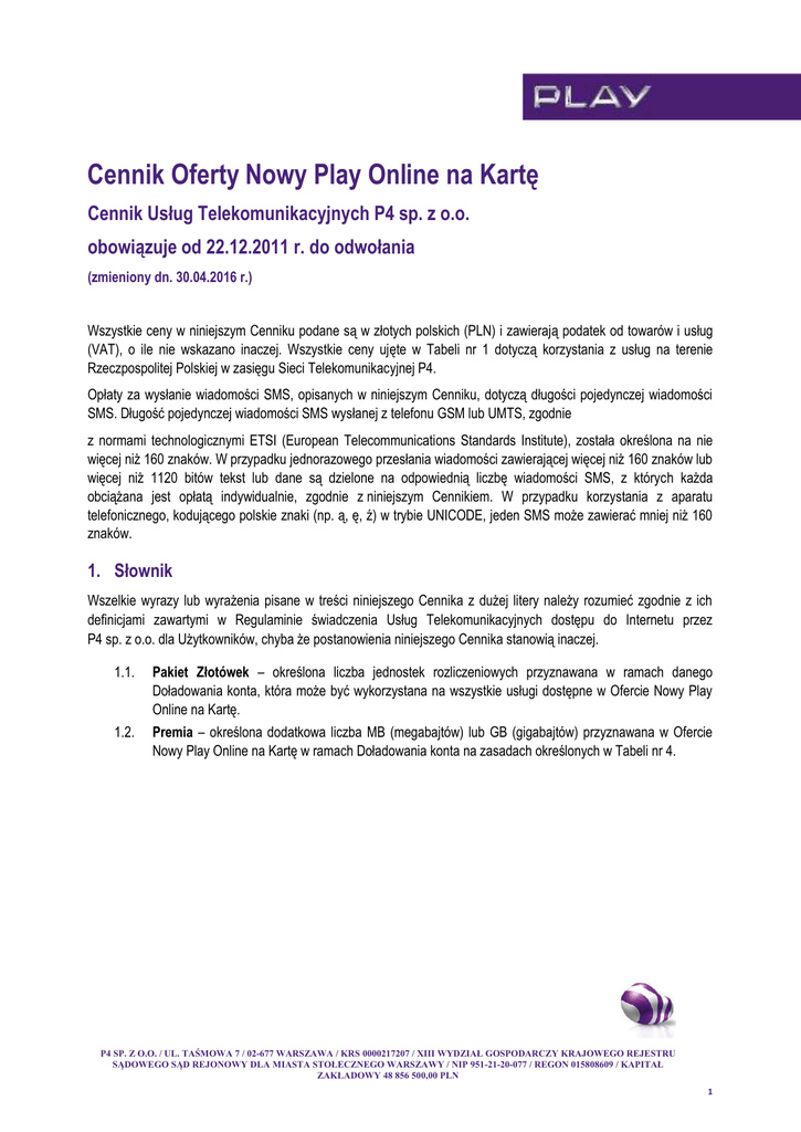Cennik Oferty Nowy Play Online na Kartę Cennik Usług Telekomunikacyjnych P4 sp. z o.o. obowiązuje od 22.12.2011 r. do odwołania (zmieniony dn. 30.04.2016 r.) Wszystkie ceny w niniejszym Cenniku podane są w złotych polskich (PLN) i zawierają podatek od towarów i usług (VAT), o ile nie wskazano inaczej. Wszystkie ceny ujęte w Tabeli nr 1 dotyczą korzystania z usług na terenie Rzeczpospolitej Polskiej w zasięgu Sieci Telekomunikacyjnej P4. Opłaty za wysłanie wiadomości SMS, opisanych w niniejszym Cenniku, dotyczą długości pojedynczej wiadomości SMS. Długość pojedynczej wiadomości SMS wysłanej z telefonu GSM lub UMTS, zgodnie z normami technologicznymi ETSI (European Telecommunications Standards Institute), została określona na nie więcej niż 160 znaków. W przypadku jednorazowego przesłania wiadomości zawierającej więcej niż 160 znaków lub więcej niż 1120 bitów tekst lub dane są dzielone na odpowiednią liczbę wiadomości SMS, z których każda obciążana jest opłatą indywidualnie, zgodnie z niniejszym Cennikiem. W przypadku korzystania z aparatu telefonicznego, kodującego polskie znaki (np. ą, ę, ź) w trybie UNICODE, jeden SMS może zawierać mniej niż 160 znaków. 1. Słownik Wszelkie wyrazy lub wyrażenia pisane w treści niniejszego Cennika z dużej litery należy rozumieć zgodnie z ich definicjami zawartymi w Regulaminie świadczenia Usług Telekomunikacyjnych dostępu do Internetu przez P4 sp. z o.o. dla Użytkowników, chyba że postanowienia niniejszego Cennika stanowią inaczej. 1.1. Pakiet Złotówek – określona liczba jednostek rozliczeniowych przyznawana w ramach danego Doładowania konta, która może być wykorzystana na wszystkie usługi dostępne w Ofercie Nowy Play Online na Kartę. 1.2. Premia – określona dodatkowa liczba MB (megabajtów) lub GB (gigabajtów) przyznawana w Ofercie Nowy Play Online na Kartę w ramach Doładowania konta na zasadach określonych w Tabeli nr 4. P4 SP. Z O.O. / UL. TAŚMOWA 7 / 02-677 WARSZAWA / KRS 0000217207 / XIII WYDZIAŁ GOSPODARCZY KRAJOWEGO REJESTRU SĄDOWEGO SĄD REJONOWY DLA MIASTA STOŁECZNEGO WARSZAWY / NIP 951-21-20-077 / REGON 015808609 / KAPITAŁ ZAKŁADOWY 48 856 500,00 PLN 1 2. Cennik usług podstawowych dostępnych w Ofercie Nowy Play Online na Kartę a) W ramach Oferty Nowy Play Online na Kartę, Użytkownik płaci stałą stawkę za poszczególne usługi: Tabela nr 1 Cennik usług podstawowych Lp. Usługa podstawowa Opłata w PLN 1. transmisja danych (APN: Internet ) 0,01 PLN / 300 kB 2. Minuta połączenia głosowego do wszystkich krajowych operatorów komórkowych i na krajowe numery stacjonarne (naliczanie sekundowe) 0,29 PLN 3. Minuta połączenia wideo do wszystkich krajowych operatorów komórkowych (naliczanie sekundowe) 0,29 PLN 4. SMS do wszystkich krajowych operatorów komórkowych 0,09 PLN 5. MMS do wszystkich krajowych operatorów komórkowych 0,19 PLN b) Opłata za transmisję danych naliczana jest za każde rozpoczęte 300 kB transmisji danych. c) Opłaty podane w Tabeli 1 nie dotyczą transmisji danych, połączeń, w tym wysyłania SMS i MMS w roamingu międzynarodowym oraz połączeń, w tym wysyłania wiadomości SMS i MMS międzynarodowych. d) Wszelkie odstępstwa od warunków zawartych w Cenniku są możliwe tylko w ramach Ofert Promocyjnych. 3. Zasady rozliczania usług w Ofercie Nowy Play Online na Kartę Tabela nr 2 Cennik Zestawów Startowych i Doładowań w Ofercie Nowy Play Online na Kartę Zestawy Startowe Opłata jednorazowa za Zestaw Startowy 9 PLN 19 PLN Podstawowa, maksymalna Ilość GB, którą Klient otrzymuje w ramach Zestawu Startowego 0,26 GB 0,54 GB Dodatkowa ilość GB, którą Klient otrzymuje w ramach Zestawu Startowego 0,04 GB 0,47 GB Łączna, maksymalna ilość GB, którą Klient otrzymuje w ramach Zestawu Startowego 0,3 GB 1 GB Okres ważności połączeń internetowych 7 dni 14 dni Okres ważności konta Użytkownika 7 + 90 dni 14 + 90 dni P4 SP. Z O.O. / UL. TAŚMOWA 7 / 02-677 WARSZAWA / KRS 0000217207 / XIII WYDZIAŁ GOSPODARCZY KRAJOWEGO REJESTRU SĄDOWEGO SĄD REJONOWY DLA MIASTA STOŁECZNEGO WARSZAWY / NIP 951-21-20-077 / REGON 015808609 / KAPITAŁ ZAKŁADOWY 48 856 500,00 PLN 2 Karta Zdrapka Opłata za Kartę Zdrapkę 5 PLN 10 PLN 30 PLN 50 PLN Ilość GB, którą Klient otrzymuje w ramach Karty Zdrapki 0,14 GB 0,29 GB 0,86 GB 1,43 GB Inne Doładowania Kwoty dostępne w ramach Doładowań (np. poprzez Internet, bankomaty, terminale płatnicze oraz stronę www.play.pl a) Dowolna kwota całkowita od 5 PLN do 300 PLN Podstawowa, maksymalna ilość GB, łączna i maksymalna ilość GB, którą Użytkownik otrzymuje w ramach Zestawu Startowego oraz ilość GB, którą Użytkownik otrzymuje w ramach Karty Zdrapki w Tabeli nr 2 powyżej podane są przy założeniu, że cały Pakiet Złotówek w ramach Zestawu Startowego lub Karty Zdrapki zostanie przeznaczony na transmisję danych. Tabela nr 3 Zasady dotyczące kwot doładowań Kwota Doładowania Okres ważności połączeń internetowych Okres ważności konta Użytkownika 5 PLN - 9 PLN 3 dni 3 + 90 dni 10 PLN - 19 PLN 7 dni 7 + 90 dni 20 PLN - 29 PLN 14 dni 14 + 90 dni 30 PLN - 49 PLN 30 dni 30 + 90 dni 50 PLN - 74 PLN 60 dni 60 + 90 dni 75 PLN do 124 PLN 90 dni 90 + 90 dni 125 PLN do 300 PLN 120 dni 120 90 dni b) Okres ważności połączeń internetowych oznacza liczbę dni kalendarzowych, liczonych od ostatniego Doładowania konta Użytkownika o danej wartości, w ciągu których Użytkownik może doładować konto, wykonywać połączenia internetowe. c) Okres ważności konta Użytkownika oznacza liczbę dni kalendarzowych, liczonych od dnia następującego po ostatnim dniu Okresu ważności połączeń internetowych, w ciągu których Użytkownik może doładować konto. Po upływie ostatniego dnia ważności konta Użytkownika konto Użytkownika ulega dezaktywacji, a tym samym dalsze korzystanie z usług nie jest możliwe. d) Kwota Doładowania i kwota zawarta w ramach