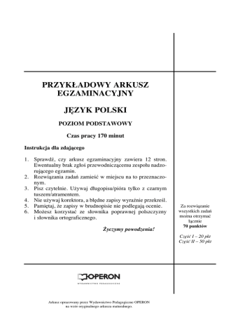 PRZYK¸ADOWY ARKUSZ EGZAMINACYJNY J¢ZYK POLSKI POZIOM PODSTAWOWY Czas pracy 170 minut Instrukcja dla zdajàcego 1. 2. 3. 4. 5. 6. Sprawdê, czy arkusz egzaminacyjny zawiera 12 stron. Ewentualny brak zg∏oÊ przewodniczàcemu zespo∏u nadzorujàcego egzamin. Rozwiàzania zadaƒ zamieÊç w miejscu na to przeznaczonym. Pisz czytelnie. U˝ywaj d∏ugopisu/pióra tylko z czarnym tuszem/atramentem. Nie u˝ywaj korektora, a b∏´dne zapisy wyraênie przekreÊl. Pami´taj, ˝e zapisy w brudnopisie nie podlegajà ocenie. Mo˝esz korzystaç ze s∏ownika poprawnej polszczyzny i s∏ownika ortograficznego. ˚yczymy powodzenia! Za rozwiàzanie wszystkich zadaƒ mo˝na otrzymaç ∏àcznie 70 punktów Cz´Êç I – 20 pkt Cz´Êç II – 50 pkt Arkusz opracowany przez Wydawnictwo Pedagogiczne OPERON na wzór oryginalnego arkusza maturalnego. 2 J´zyk polski. Poziom podstawowy Cz´Êç I – rozumienie czytanego tekstu Przeczytaj uwa˝nie tekst, a nast´pnie wykonaj zadania umieszczone pod nim. Odpowiadaj tylko na podstawie tekstu i tylko w∏asnymi s∏owami – chyba ˝e w zadaniu polecono inaczej. Udzielaj tylu odpowiedzi, o ile jesteÊ proszona/y. W zadaniach zamkni´tych wybierz tylko jednà z zaproponowanych odpowiedzi. Gustaw Herling-Grudziƒski, O ksià˝ce 1. Ró˝ne sà formy obcowania z ksià˝kà, lecz spoÊród nich najwczeÊniejszà jest mo˝e p r z y j a ê ƒ . Cofajàc si´ uwa˝nie w kraj lat dziecinnych, zaludniony postaciami Robinzonów [sic!] Cruzoe1, Davidów Copperfieldów2, Martinów Edenów3 i Kimów4 dostrze˝emy wyraênie, ˝e urok osobisty bohaterów powieÊciowych wycisnà∏ niezatarte pi´tno na emocji pierwszego zetkni´cia z ksià˝kà. We mgle najodleglejszych wspomnieƒ przesuwajà si´ szeregi ludzi-wzorów. Tym zaprzysi´gliÊmy kiedyÊ w uniesieniu i podziwie dozgonnà wiernoÊç i ch´ç naÊladowania, tamtych odtràciliÊmy surowo w pierwszej pysze dzieci´cej czystoÊci. Czy˝ nie takie uczucia rodzà najm∏odszà, nieÊwiadomà swej g∏´bi przyjaêƒ? 2. Im dalej w g∏àb, tym gwa∏towniej domaga si´ czytelnik, aby ksià˝ka ods∏oni∏a mu sekrety p o z n a n i a . Ksià˝ka – klucz do najtrudniejszych zagadnieƒ, ksià˝ka – Êwiat∏o, po które si´gajà zb∏àkane w ciemnoÊciach r´ce, t∏umacz starych i stwórca nowych Êwiatów towarzyszy pierwszym kryzysom i zwàtpieniom naszej m∏odoÊci. Darwin pomieszany z Renanem, Platon czytany z Tomaszem ∫ Kempis, ksià˝ka – p∏omieƒ os∏aniany troskliwie w czas pierwszej burzy. MyÊl´, ˝e w dziejach naszego do niej stosunku jest to okres najbardziej religijny. Gdy˝ przenika go na wskroÊ potrzeba odnalezienia si´ we wszechÊwiecie. I mo˝e to wówczas jeden jedyny raz bierzemy jà do ràk z czcià, nale˝nà tylko modlitewnikom. 3. Lecz bàdêmy sprawiedliwi. Modlitwa jest sztukà g∏´bokich skupieƒ a nie rozpaczliwych poszukiwaƒ. Nie prawdziwego poznania oczekujemy od ksià˝ki, ale pomocy. A gdy jej nie widaç znikàd? Biedny gimnazjalista Grodzicki z pi´knej powieÊci Parandowskiego5 podpali∏ naiwnie niebo, bo zawis∏o nad nim nieznoÊnym ci´˝arem. SamotnoÊç jest wówczas nie formà opanowania Êwiata, ale ucieczki od niego. Poznanie nie Êmia∏oÊcià zdobywcy, ale l´kiem metafizycznym zb∏àkanego. Nic lepiej nie wyra˝a dramatycznego napi´cia tego czasu, ni˝ zdanie pewnego uczonego niemieckiego z XVIII wieku: „W´drowa∏em wÊród wiedzy jak psy, które wyszed∏szy na spacer ze swoim panem biegnà setki razy naprzód i w ty∏; a dopadajàc do jego nóg sà zm´czone”. W tym punkcie zami∏owanie do czytania ksià˝ki nabiera cech klasycznego rozdro˝a. 4. Zdaje si´, ˝e przypada ono na lata powtórnego dojrzewania. To znaczy na lata, gdy wa˝na zaczyna byç nie pogoƒ za autorytetem, ale wewn´trzny nakaz kszta∏towania w∏asnego charakteru. Ten zakr´t posiada wi´cej ni˝ inne cechy zaczepnego, a nie obronnego lub uleg∏ego stosunku do ksià˝ki. 5. JeÊli przyjaêƒ i poznanie uwa˝am za dwa podstawowe uczucia, okreÊlajàce dalsze dzieje naszego wspó∏˝ycia z ksià˝kà, to czyni´ tak nie dla ich zasadniczej jakiejÊ sprzecznoÊci. Mówiàc otwarcie, jest to pierwsza i najwa˝niejsza próba naszej intelektualnej odwagi, w której nie wybór rozmyÊlny, ale uczucie organicznego ryzyka gra g∏ównà rol´. Kto, jak Boles∏aw Miciƒski6 nie ul´knie si´ „podró˝y do piekie∏”, mo˝e poprzez czyÊciec trafiç do nieba. Odtàd wolno nam ju˝ tylko albo kochaç i nienawidzieç, albo wzruszaç si´ i oboj´tnieç. Ksià˝ka prowadzi jednych do zabawy i samej nauki, drugich do nami´tnoÊci i wyznawstwa. Bohaterzy powieÊciowi jeszcze silniej ni˝ dobrymi znajomymi i przyjació∏mi stajà si´ naszymi wzorami. Problemy wzbudzajà nie czystà i bezinteresownà ch´ç poznania, ale wiecznie czujnà i wspania∏à ˝àdz´ bezpoÊredniego uczestnictwa. 1 2 3 4 5 6 Daniel Defoe, Robinson Cruzoe Charles Dickens, David Copperfield Jack London, Martin Eden Rudyard Kipling, Kim Jan Parandowski, Niebo w p∏omieniach Boles∏aw Miciƒski, Podró˝ do piekie∏ 3 J´zyk polski. Poziom podstawowy 6. Coraz mniej jest ksià˝ek nudnych lub interesujàcych, a coraz wi´cej drogich lub zupe∏nie obcych. Ludzie starzy pozostajà ju˝ przy jednym lub dwóch autorach, kochajà co dzieƒ oszcz´dniej, co dzieƒ wy∏àczniej. Balzac7 tworzy nie obraz Francji dziewi´tnastowiecznej, ale narzuca drgajàcà pasjà wizj´ mieszczaƒskiego k∏´bowiska interesów i nami´tnoÊci. Conrad8 przemyka si´ we mgle dalekich mórz nie jak samotny ˝eglarz, ale jak dumny spadkobierca najlepszych cech twardego cz∏owieczeƒstwa. Kryteria estetyczne nabierajà zabarwienia moralnego, a samotnoÊç ze s∏aboÊci i ucieczki przeobra˝a si´ w si∏´ i spe∏nienie. Jest niby dojrza∏y owoc, który spada po latach pe∏nego udr´ki i radoÊci wzrastania. Gdy˝ Êwiat ksià˝ki jest zazdrosny i wy∏àczny, nie zna poj´cia „rozumnej gospodarki uczuç”. Rzeêbiàc 