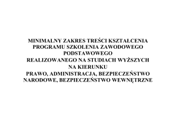 MINIMALNY ZAKRES TREŚCI KSZTAŁCENIA PROGRAMU SZKOLENIA ZAWODOWEGO PODSTAWOWEGO REALIZOWANEGO NA STUDIACH WYŻSZYCH NA KIERUNKU PRAWO, ADMINISTRACJA, BEZPIECZEŃSTWO NARODOWE, BEZPIECZEŃSTWO WEWNĘTRZNE Niniejszy materiał stanowi wyciąg z jednolitego Programu szkolenia zawodowego podstawowego i jest pomocny do przygotowania się do testu wiedzy, o którym mowa w §3 ust. 4 rozporządzenia Ministra Spraw Wewnętrznych i Administracji w sprawie szczegółowych warunków odbywania szkoleń zawodowych oraz doskonalenia zawodowego w Policji. Test wiedzy, składający się ze 140 pytań, będzie budowany tylko na podstawie poniżej wyszczególnionych treści kształcenia i nie będzie zawierał zagadnień z tematu 33. Policjant uzyska zaliczenie przedmiotowego testu wiedzy, jeżeli udzieli co najmniej 70% poprawnych odpowiedzi z ogólnej liczby 140 pytań. TEMAT NR 1: Elementy wstępu do prawoznawstwa CELE: Po zrealizowaniu tematu student będzie potrafił: - zinterpretować podstawowe pojęcia: prawo, system źródeł prawa, - określić hierarchię źródeł prawa, - wskazać pojęcie i budowę aktu normatywnego i prawnego, - rozróżnić akty normatywne o charakterze powszechnie obowiązującym i o charakterze wewnętrznym, - odróżnić przepis prawny od normy prawnej, - wskazać sposób ogłaszania aktów prawnych, - określić zasady obowiązywania aktu normatywnego w czasie, przestrzeni, względem osób, - odróżnić rodzaje wykładni (językową, systemową i funkcjonalną). Zagadnienia 1. 2. 3. 4. 5. Pojęcia: prawo, system źródeł prawa, hierarchia źródeł prawa. Pojęcia: akt prawny i akt normatywny oraz jego budowa. Rodzaje aktów prawnych o charakterze powszechnie obowiązującym i wewnętrznym. Pojęcie „przepis prawny”, „norma prawna”, budowa normy prawnej. Sposoby ogłaszania aktów prawnych. 2 Zagadnienia 6. Zasady obowiązywania aktu normatywnego w czasie, przestrzeni, względem osób. 7. Wykładnia językowa, systemowa i funkcjonalna prawa. TEMAT NR 2: Część ogólna prawa karnego materialnego i prawa wykroczeń CELE: Po zrealizowaniu tematu student będzie potrafił: - wyróżnić elementy przestępstwa i wykroczenia, - określić różnice pomiędzy przestępstwem a wykroczeniem, - określić ustawowe znamiona przestępstwa i wykroczenia, - określić rodzaje zbiegów, - dokonać podziału przestępstw i wykroczeń, - wyróżnić stadialne i zjawiskowe formy popełnienia przestępstwa i wykroczenia, - wskazać zasady odpowiedzialności za przestępstwa i wykroczenia, w zależności od formy ich popełnienia, - określić pojęcie i rodzaje immunitetów, - zinterpretować okoliczności wyłączające odpowiedzialność karną za przestępstwa i wykroczenia, - określić katalog kar i środków karnych za przestępstwa i wykroczenia. Zagadnienia 1. Pojęcie przestępstwa, pojęcie wykroczenia. 2. Różnice pomiędzy przestępstwem a wykroczeniem. 3. Ustawowe znamiona przestępstw i wykroczeń. 3 Zagadnienia 4. Podział przestępstw i wykroczeń ze względu na: a) podmiot, b) zachowanie się sprawcy, c) skutek, d) stronę podmiotową, e) sankcję karną, f) tryb ścigania, g) typ przestępstwa, h) stopień realizacji. 5. Stadialne formy popełnienia przestępstwa i wykroczenia. 6. Zjawiskowe formy popełnienia przestępstwa i wykroczenia 4 Zagadnienia 7. Zasady odpowiedzialności za przestępstwa i wykroczenia: a) odpowiedzialności za czyny zawinione, b) obowiązywania ustawy w czasie, c) określania czasu popełnienia przestępstwa i wykroczenia, d) terytorialności, e) określania miejsca popełnienia przestępstwa i wykroczenia. 8. Pojęcie immunitetu. 9. Rodzaje immunitetów: a) materialny, formalny, b) krajowy i zakrajowości. 10. Rodzaje immunitetów krajowych: a) prezydencki, b) parlamentarny, c) sędziowski, d) prokuratorski, e) adwokacki, f) Rzecznika Praw Obywatelskich, g) prezesa i pracowników NIK. 11. Rodzaje immunitetów zakrajowości: a) immunitet dyplomatyczny, b) immunitet konsularny. 12. Rodzaje dokumentów tożsamości osób korzystających z immunitetów krajowych i zakrajowości. 5 Zagadnienia 13. Okoliczności wyłączające odpowiedzialność ze względu na brak bezprawności czynu (kontratypy kodeksowe i pozakodeksowe): a) obrona konieczna, b) stan wyższej konieczności (art.26 § 1 kk), c) szczególne uprawnienia lub obowiązki, d) karcenie dzieci, e) zgoda dysponenta dobrem, f) zwyczaj. 14. Okoliczności wyłączające odpowiedzialność ze względu na brak winy: a) stan wyższej konieczności (art. 26 § 2 kk), b) niepoczytalność, c) rozkaz, d) błąd co do faktu, prawa, kontratypu lub okoliczności wyłączającej winę. 15. Okoliczność wyłączająca społeczną szkodliwość czynu. 16. Zbieg przepisów, zbieg przestępstw i wykroczeń. 17. Kary i środki karne TEMAT NR 3: Część szczególna prawa karnego materialnego i prawa wykroczeń CELE: Po zrealizowaniu tematu student będzie potrafił: - wskazać systematykę części szczególnej kodeksu karnego, - wskazać ustawowe znamiona wybranych przestępstw, - kwalifikować stany faktyczne wybranych przestępstw, - wskazać systematykę części szczególnej kodeksu wykroczeń, - wskazać ustawowe znamiona wybranych wykroczeń, - kwalifikować stany faktyczne wybranych wykroczeń. 6 Zagadnienia 1. Systematyka części szczególnej kodeksu karnego (rodzajowy przedmiot ochrony). 2. Ustawowe znamiona wybranych przestępstw przeciwko życiu i zdrowiu: a) zabójstwo (art.148 kk), b) nieumyślne spowodowanie śmierci ( art. 155 kk), c) uszczerbki na zdrowiu (art.156,157kk), d) bójki i pobicia (art.158,159kk). 3. Ustawowe znamiona wybranych przestępstw przeciwko wolności seksualnej i obyczajności: a) zgwałcenie (art.197 i 205 kk), b) sutenerstwo, handel ludźmi (art.204 kk, art.253 kk). 4. Ustawowe znamiona wybranych przestępstw przeciwko mieniu: a) kradzież ( art.278kk), b) kradzież z włamaniem (art.279 kk), c) rozbój (art.280 kk), d) kradzież rozbójnicza (art.281 kk