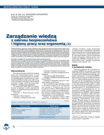 BEZPIECZEŃSTWO PRACY 12/2004 prof. dr hab. inż. WALDEMAR KARWOWSKI Center for Industrial Ergonomics University of Louisville, USA Centralny Instytut Ochrony Pracy – Państwowy Instytut Badawczy Zarządzanie wiedzą z zakresu bezpieczeństwa i higieny pracy oraz ergonomią (2) Wiedza jest jednym z głównych narzędzi osiągnięcia celów zarządzania systemem bezpieczeństwa i higieny pracy oraz ergonomią (BHPiE). Model zarządzania wiedzą w BHPiE powinien zawierać następujące elementy: proces tworzenia wiedzy organizacyjnej (socjalizacja, eksternalizacja, internalizacja, kombinacja wiedzy), uczenie się: (rozpowszechnianie, dzielenie się i konsolidacja wiedzy), proces zarządzania wiedzą (rewizja, konceptualizacja, refleksja i działanie), zastosowanie odpowiednich technologii informacyjnych. Nie tylko wiedza formalna (przepisy i regulacje), ale także wiedza ukryta w umysłach pracowników na wszystkich szczeblach firmy powinna być szeroko wykorzystana w celu efektywnego zarządzania sferą bezpieczeństwa i higieny pracy oraz ergonomii. Knowledge management for occupational safety, health and ergonomics (2) Knowledge is one of the main tools for reaching the goals of any management system in the area of occupational safety, health and ergonomics (OSHE). A model of such knowledge management for OSHE should include the following elements: a process of organizational knowledge creation (knowledge socialization, externalization, internalization, and combination), learning (knowledge transfer, sharing and consolidation), knowledge management (knowledge revision, conceptualization, reflection, and acting), and application of appropriate information technologies. Not only the formal (explicit) knowledge (safety policies and regulations), but also the tacit knowledge of employees at al levels of the enterprise should be used to assure effective management of occupational safety, health and ergonomics. Wprowadzenie Zarządzanie bezpieczeństwem, higieną pracy oraz środowiskiem pracy (w tym czynnikami ergonomicznymi) w kontekście pogłębiającej się konkurencji i rywalizacji na globalnym rynku, oraz stale rosnących wymagań co do jakości oferowanych wyrobów i usług, urosło do poważnego problemu współczesnej gospodarki. W normie ISO 9000:2000 [1] sformułowano następujące zasady zapewnienia jakości w organizacjach przemysłowych i usługowych: • Zasada 1: Koncentracja uwagi na kliencie • Zasada 2: Przywództwo • Zasada 3: Zaangażowanie ludzi • Zasada 4: Podejście procesowe • Zasada 5: Systemowe podejście do zarządzania • Zasada 6: Ciągłe doskonalenie • Zasada 7: Podejmowanie decyzji na podstawie faktów • Zasada 8: Obopólne korzyści w relacjach między dostawcami. Na szczególną uwagę zasługują: zasada 5. Systemowe podejście do zarządzania oraz zasada 7. Podejmowanie decyzji na podstawie faktów. Wprowadzenie tych zasad w życie w aspekcie zarządzania bezpieczeństwem i higieną pracy oraz ergonomią wymaga dzisiaj zarządzania wiedzą zgromadzoną w tych dziedzinach. Pojęcie „zarządzanie wiedzą” (ZW) odnosi się do zarządzania wiedzą indy- WIEDZA W DZIEDZINIE BHPiE – FORMALNA I UKRYTA Explicit and tacit knowledge in the area of occupational safety, health and ergonomics Wiedza formalna Wiedza ukryta Normy Bazy danych o wypadku przy pracy Przepisy prawne BHPiE Wytyczne BHPiE Teorie i aksjomaty Doświadczenie specjalistów ds. BHPiE Umiejętność identyfikacji zagrożeń powiązana z praktycznymi aspektami Umiejętności percepcyjne i poznawcze Doświadczenie w pracy fizycznej Intuicja oraz synteza faktów Niewystarczająca, aby zapewnić bezpieczeństwo pracy Trudna do skodyfikowania 6 Tabela 1 widualną (osobistą), wiedzą strukturalną (wiedzą zawartą w materiałach, raportach, bazach danych) oraz wiedzą organizacyjną (proces uczenia się w ramach organizacji). W celu usprawnienia systemu zarządzania bezpieczeństwem i higieną pracy oraz ergonomią (BHPiE) konieczne jest wypracowanie zasad i narzędzi zarządzania wiedzą w tym zakresie* [2]. BHPiE a zarządzanie wiedzą Obecnie podejście do systemów zarządzania BHPiE jest przede wszystkim skoncentrowane na wiedzy formalnej, czyli na rządowych i lokalnych przepisach, normach, zaleceniach i wytycznych BHPiE, które powinny być powszechnie stosowane (tab. 1.). Należy jednak zauważyć, że przepisy prawne nie uwzględniają wszystkich możliwych zagrożeń, które mogą wystąpić w specyficznych warunkach pracy, a także nie odzwierciedlają dynamiki procesów organizacyjnych w przedsiębiorstwach. W systemie samoregulującym się, organizacja powinna wypracować model zarządzania sferą BHPiE, odpowiadający istniejącym warunkom społeczno-ekonomicznym na konkurencyjnym rynku, wykorzystując system dystrybucji wiedzy formalnej i nieformalnej, czyli wiedzy ukrytej. Wiedza ukryta w umysłach doświadczonych pracowników jest konieczna do zapewnienia sprawnego zarządzania BHPiE. Wiedza taka (indywidualna wiedza pracownika) jest mocno związana z kontekstem pracy, trudna do jasnego jej sformułowania i werbalizacji, ale za to łatwa do wykorzystania przez doświadczonego pracownika, który ją posiada. * Pojęcie to omówiono szerzej w artykule W. Karwowskiego Zarządzanie wiedzą (1) „Bezpieczeństwo Pracy” 11(400) 2004 BEZPIECZEŃSTWO PRACY 12/2004 ZARZĄDZANIE WIEDZĄ Z ZAKRESU BHPiE Knowledge management for occupational safety, health and ergonomics Model systemu zarządzania bezpieczeństwem i higieną pracy wg wytycznych Międzynarodowej Organizacji Pracy The International Labour Organization model of management system for occupational safety and health Polityka BHPiE Tabela 2 Zarządzanie wiedzą • Ustalenie szczegółowej polityki BHPiE odpowiedniej do rodzaju aktywności organizacji • Udostępnienie jej odpowiednim instytucjom zewnętrznym • Pozyskiwanie wiedzy ukrytej • Transfer wiedzy ukrytej do wiedzy formalnej (kodyfikowanie wiedzy, KBS)