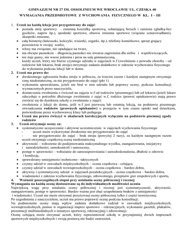 GIMNAZJUM NR 27 IM. OSSOLINEUM WE WROCŁAWIU UL. CZESKA 40 WYMAGANIA PRZEDMIOTOWE Z WYCHOWANIA FIZYCZNEGO W KL. I – III 1. Uczeń na każdą lekcje jest przygotowany do zajęć: posiada strój sportowy - zmienną koszulkę sportową, osłaniającą brzuch i ramiona (gładką-bez guzików, napów itp.), spodenki sportowe, obuwie zmienne sportowe (wiązane sznurowadłami), skarpetki zmienne, całą biżuterię (łańcuszki, kolczyki, wisiorki, zegarki, itp.), telefony komórkowe, sprzęt grający pozostawia w swojej szafce, włosy ma związane, nie opadające na twarz, ma obcięte paznokcie – długością paznokci nie stwarza zagrożenia dla siebie i współćwiczących, nie żuje gumy, nie wnosi jedzenia i picia na salę gimnastyczną, każdy uczeń, który nie bierze czynnego udziału w zajęciach w.f (zwolnienie z powodu choroby - od rodziców lub lekarza, brak stroju) otrzymuje zadanie dodatkowe w zakresie wychowania fizycznego do wykonania podczas lekcji lub w domu 2. Uczeń ma prawo do: dwukrotnego zgłoszenia braku stroju w półroczu, za trzecim razem i każdym następnym otrzymuje cenę niedostateczną, za nie przygotowanie do zajęć (pkt 1) wykonania sprawdzianu, jeżeli nie brał w nim udziału lub poprawy oceny, podczas konsultacji wyznaczonych przez nauczyciela, dostarczenia zwolnienia z ćwiczeń na zajęcia w.f od rodziców (pisemnego) lub od lekarza (jeżeli lekarz zdecyduje o potrzebie dłuższego zwolnienia z zajęć w.f, rodzice (prawni opiekunowie) mają prawo zwrócić się do dyrektora szkoły o zwolnienie z zajęć) zwolnienia z lekcji do domu, jeśli w.f jest pierwszą lub ostatnią lekcją, na podstawie pisemnego oświadczenia rodziców (prawnych opiekunów) o przejęciu w tym czasie opieki nad dzieckiem, potwierdzone przez wychowawcę klasy lub pedagoga ● Uczeń ma prawo ćwiczyć w okularach korekcyjnych wyłącznie na podstawie pisemnej zgody rodziców 3. Uczeń otrzymuje oceny za: systematyczne uczęszczanie i aktywne uczestniczenie w zajęciach wychowania fizycznego uczeń może wykorzystać dwukrotne nie przygotowanie do zajęć nie przygotowanie do zajęć - brak stroju (powyżej 2 razy), za każdym następnym razem uczeń otrzymuje cząstkową ocenę niedostateczną aktywność – wdrożenie do podejmowania maksymalnego wysiłku, zaangażowania, inicjatywy i samodzielności, samokontroli i samooceny, postęp w sprawności – wdrażanie do samousprawniania i samodoskonalenia, dbałość o zdrowie i kondycję, sprawdziany umiejętności techniczno - taktycznych czynny udział w zawodach międzyszkolnych – ocena cząstkowa - celująca, czynny udział w zawodach wewnątrzszkolnych – ocena cząstkowa – bardzo dobra, aktywny i systematyczny udział w zajęciach pozalekcyjnych – ocena cząstkowa – bardzo dobra, wiadomości z zakresu wychowania fizycznego, zdrowotnego, przepisów gier zespołowych i sportu, 4. Ważność poszczególnych stopni przy ustalaniu oceny półrocznej i rocznej Wymagania na każdą ocenę dostosowane są do indywidualnych możliwości ucznia. Największą wagę przy ustalaniu oceny półrocznej i rocznej jest systematyczność, aktywność, zaangażowanie, postęp w sprawności. Bardzo ważna jest chęć uzupełniania braków z umiejętności i wiadomości. Uczeń nie może otrzymać pozytywnej oceny półrocznej tylko z części teoretycznej. Po uzgodnieniu z nauczycielem, uczeń ma prawo poprawić ocenę podczas konsultacji. Na podniesienie oceny mają wpływ zadania dodatkowe (udział w zawodach międzyszkolnych, wewnątrzszkolnych, pomoc w organizacji imprez sportowo – rekreacyjnych, wykonanie gazetek, plakatów, prezentacji multimedialnych o tematyce sportowej, rekreacyjnej i zdrowotnej). Ocenę celującą może otrzymać uczeń, który reprezentował szkołę w przynajmniej dwóch imprezach sportowych międzyszkolnych i swoją postawą nie budzi zastrzeżeń. Zwolnienia od rodziców (prawnych opiekunów) – w przypadku dużej ilości zwolnień pojedynczych, ocena z wychowania fizycznego na zakończenie półrocza lub roku nie może być wyższa niż dobra. Nieobecności nieusprawiedliwione, ucieczki, spóźnienia obniżają ocenę cząstkową za systematyczne uczęszczanie. Uczeń, który nie uczestniczył w sprawdzianie, ma obowiązek zaliczyć sprawdzian w wyznaczonym przez nauczyciela terminie. Konsekwencją odmowy udziału w sprawdzianie jest otrzymanie oceny niedostatecznej, bez możliwości poprawy. Uczeń podczas zajęć wychowania fizycznego, zajęć sportowych pozalekcyjnych i udziału w zawodach sportowych zwraca szczególną uwagę na bezpieczeństwo własne i współćwiczących. Za nieprzestrzeganie wymagań przedmiotowych przez ucznia nauczyciel nie ponosi odpowiedzialności finansowej. Uczniowie zostają zapoznani z wymaganiami przedmiotowymi podczas lekcji organizacyjnych. Wymagania są do wglądu w Mediatece Szkolnej, na stronie internetowej gimnazjum oraz na tablicy przy sali gimnastycznej, o czym zostali poinformowani uczniowie podczas zajęć organizacyjnych i rodzice na zebraniu z wychowawcą. Wymagania przedmiotowe obowiązują od września 2012 roku. Wymagania opracowali i wykorzystują: Iwona Brzozowska Katarzyna Groń Magdalena Jania Elżbieta Kiełczewska Marek Ciaszkiewicz Piotr Mizerski Wrocław, sierpień 2012 GIMNAZJUM NR 27 IM. OSSOLINEUM WE WROCŁAWIU UL. CZESKA 40 WYMAGANIA PRZEDMIOTOWE Z WYCHOWANIA FIZYCZNEGO W KL. I – III 1. Uczeń na każdą lekcje jest przygotowany do zajęć: posiada strój sportowy - zmienną koszulkę sportową, osłaniającą brzuch i ramiona (gładką-bez guzików, napów itp.), spodenki sportowe, obuwie zmienne sportowe (wiązane sznurowadłami), skarpetki zmienne, całą biżuterię (łańcuszki, kolczyki, wisiorki, zegarki, itp.), telefony komórkowe, sprzęt grający pozostawia w swojej szafce, włosy ma związane, nie opadające na twarz, ma obcięte paznokcie – długością paznokci nie stwarza zagrożenia dla siebie i współćwiczących, nie 