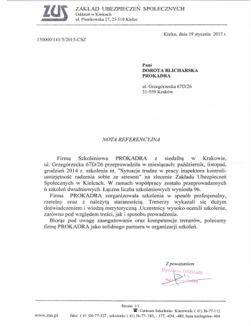 grudzień 2014 r. szkolenia nt. "Sytuacje trudne w pracy inspektora kontroliumiejętność radzenia sobie ze stresem" na zlecenie Zakładu Ubezpieczeń