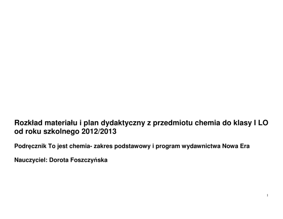 Rozkład materiału i plan dydaktyczny z przedmiotu chemia do klasy I LO od roku szkolnego 2012/2013 Podręcznik To jest chemia- zakres podstawowy i program wydawnictwa Nowa Era Nauczyciel: Dorota Foszczyńska 1 Wyróżnione wymagania edukacyjne odpowiadają wymaganiom ogólnym i szczegółowym zawartym w treściach nauczania podstawy programowej. Natomiast zaznaczone doświadczenia chemiczne są zalecane przez Ewę Gryczman i Krystynę Gisges (autorki podstawy programowej) do przeprowadzenia w zakresie podstawowym (Komentarz do podstawy programowej przedmiotu Chemia) Temat lekcji Treści nauczania Wymagania edukacyjne Podstawowe Ponadpodstawowe (P) (PP) Wymagania szczegółowe podstawy programowej 1. Przedmiotowy system oceniania z chemii dla klasy I LO 2. Pracownia chemiczna – podstawowe szkło i sprzęt laboratoryjny. Przepisy BHP i regulamin pracowni chemicznej • • • • obowiązujące na lekcjach chemii przepisy BHP i regulamin pracowni chemicznej system oznaczeń chemikaliów nazwy kryteria oceniania na lekcjach chemii nowy szkła i sprzętu laboratoryjnego Uczeń: • zna zasady BHP i regulamin obowiązujące w pracowni chemicznej (A) • stosuje zasady obowiązujące w pracowni chemicznej (C) • nazywa wybrane szkło i sprzęt laboratoryjny używany w pracowni chemicznej (B) I. Materiały i tworzywa pochodzenia naturalnego. 3.Skały i minerały. Hydraty • skały wapienne • właściwości i zastosowania skał wapiennych • wykrywanie skał wapiennych wśród innych skał i minerałów z zapisaniem odpowiednich równań reakcji chemicznych • skały gipsowe • rodzaje, właściwości i zastosowania skał gipsowych • hydraty • wzory sumaryczne oraz nazwy hydratów i soli bezwodnych (CaSO4, Uczeń: • definiuje pojęcia: skorupa ziemska, minerały, skały, surowce mineralne (A) • dokonuje podziału surowców mineralnych oraz wymienia przykłady poszczególnych rodzajów surowców (B) • zapisuje wzór sumaryczny i podaje nazwę systematyczną podstawowego związku chemicznego występującego w skałach wapiennych (C) • wymienia rodzaje skał wapiennych (A) • opisuje właściwości i zastosowania skał wapiennych (C) Uczeń: • projektuje doświadczenie chemiczne Odróżnianie skał wapiennych od innych skał i minerałów i zapisuje odpowiednie równania reakcji chemicznych (C) • definiuje pojecie skala twardości minerałów (A) • podaje twardości w skali Mohsa dla wybranych minerałów (B) • wyjaśnia zjawisko powstawania kamienia kotłowego (C) • podaje nazwy hydratów i zapisuje ich wzory sumaryczne (C) Uczeń: 1.1. bada i opisuje właściwości SiO2; wymienia odmiany SiO2 występujące w przyrodzie i wskazuje na ich zastosowania 1.4. opisuje rodzaje skał wapiennych (wapń, marmur, kreda), ich właściwości i zastosowania; projektuje wykrycie skał wapiennych wśród innych skał i minerałów; zapisuje równania reakcji 1.5. zapisuje wzory hydratów 2 • • • • 4. Przeróbka wapieni i gipsu 2 CaSO4 · H2O i CaSO4 · 2H2O) różnice we właściwościach hydratów i substancji bezwodnych zachowanie się hydratów podczas ogrzewania krzemionka odmiany SiO2, ich właściwości i zastosowania • wapno palone, wapno gaszone • gips, gips palony • proces twardnienia zaprawy gipsowej • surowce do produkcji wyrobów ceramicznych, cementu, betonu • równania reakcji chemicznych zachodzących podczas twardnienia zaprawy wapiennej • opisuje sposób identyfikacji CO2 (C) • wymienia rodzaje skał gipsowych oraz opisuje ich podstawowe zastosowania (B) • definiuje pojęcie hydraty (A) • przewiduje zachowanie się hydratów podczas ogrzewania (C) • wymienia główny składnik kwarcu i piasku (A) • zapisuje wzór sumaryczny krzemionki oraz podaje jej nazwę systematyczną (C) • opisuje właściwości tlenku krzemu(IV) (C) • wymienia najważniejsze odmiany SiO2 występujące w przyrodzie i podaje ich zastosowania (B) • podaje nazwy systematyczne wapna palonego i gaszonego • oraz zapisuje wzory sumaryczne tych związków chemicznych (C) • wymienia właściwości wapna palonego i gaszonego (B) • projektuje doświadczenie chemiczne Gaszenie wapna palonego (C) • zapisuje równanie reakcji twardnienia zaprawy wapiennej (C) • zapisuje wzory sumaryczne gipsu i gipsu palonego oraz opisuje sposoby ich otrzymywania (C) • wyjaśnia, czym jest zaprawa gipsowa oraz wymienia jej zastosowania (B) • opisuje różnice we właściwościach hydratów i soli bezwodnych (C) • przewiduje zachowanie się hydratów podczas ogrzewania (C) • projektuje doświadczenie chemiczne Usuwanie wody z hydratów (C) • oblicza zawartość procentową wody w hydratach (D) • projektuje doświadczenie chemiczne Badanie właściwości tlenku krzemu(IV) (C) • opisuje właściwości omawianych odmian kwarcu (C) i soli bezwodnych (CaSO4, (CaSO4)2 · H2O i CaSO4 · 2 H2O; podaje ich nazwy; opisuje różnice we właściwościach hydratów i substancji bezwodnych; przewiduje zachowanie się hydratów podczas ogrzewania i weryfikuje swoje przewidywania poprzez doświadczenie 1.5. wymienia zastosowania • projektuje doświadczenie skał gipsowych; wyjaśnia chemiczne Termiczny proces twardnienia rozkład wapieni (C) zaprawy gipsowej • opisuje sposób otrzymywania (zapisuje odpowiednie wapna palonego i gaszonego równanie reakcji) wraz z zapisaniem odpowiednich równań reakcji chemicznych (C) • omawia proces twardnienia zaprawy wapiennej(B) • zapisuje równanie reakcji otrzymywania gipsu palonego (C) • wyjaśnia, dlaczego gips i gips palony są hydratami (B) • projektuje doświadczenie chemiczne Sporządzanie zaprawy gipsowej i badanie jej twardnienia (C) • zapisuje równanie reakcji 3 5.Przeróbka kwarcu. Cement i beton 6.Źródła zanieczyszczeń gleb i ich ochrona • • • • proces produkcji szkła rodzaje i właściwości szkła cement, beton, ceramika zastosowania zaprawy cementowej, cementu i betonu • gleba • sorpcyjne wła