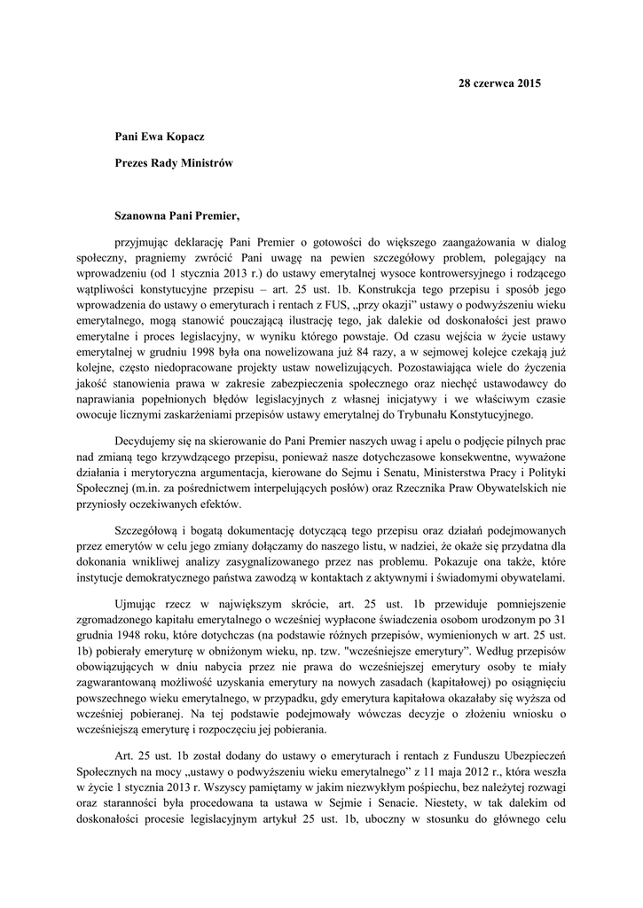 28 czerwca 2015 Pani Ewa Kopacz Prezes Rady Ministrów Szanowna Pani Premier, przyjmując deklarację Pani Premier o gotowości do większego zaangażowania w dialog społeczny, pragniemy zwrócić Pani uwagę na pewien szczegółowy problem, polegający na wprowadzeniu (od 1 stycznia 2013 r.) do ustawy emerytalnej wysoce kontrowersyjnego i rodzącego wątpliwości konstytucyjne przepisu – art. 25 ust. 1b. Konstrukcja tego przepisu i sposób jego wprowadzenia do ustawy o emeryturach i rentach z FUS, „przy okazji” ustawy o podwyższeniu wieku emerytalnego, mogą stanowić pouczającą ilustrację tego, jak dalekie od doskonałości jest prawo emerytalne i proces legislacyjny, w wyniku którego powstaje. Od czasu wejścia w życie ustawy emerytalnej w grudniu 1998 była ona nowelizowana już 84 razy, a w sejmowej kolejce czekają już kolejne, często niedopracowane projekty ustaw nowelizujących. Pozostawiająca wiele do życzenia jakość stanowienia prawa w zakresie zabezpieczenia społecznego oraz niechęć ustawodawcy do naprawiania popełnionych błędów legislacyjnych z własnej inicjatywy i we właściwym czasie owocuje licznymi zaskarżeniami przepisów ustawy emerytalnej do Trybunału Konstytucyjnego. Decydujemy się na skierowanie do Pani Premier naszych uwag i apelu o podjęcie pilnych prac nad zmianą tego krzywdzącego przepisu, ponieważ nasze dotychczasowe konsekwentne, wyważone działania i merytoryczna argumentacja, kierowane do Sejmu i Senatu, Ministerstwa Pracy i Polityki Społecznej (m.in. za pośrednictwem interpelujących posłów) oraz Rzecznika Praw Obywatelskich nie przyniosły oczekiwanych efektów. Szczegółową i bogatą dokumentację dotyczącą tego przepisu oraz działań podejmowanych przez emerytów w celu jego zmiany dołączamy do naszego listu, w nadziei, że okaże się przydatna dla dokonania wnikliwej analizy zasygnalizowanego przez nas problemu. Pokazuje ona także, które instytucje demokratycznego państwa zawodzą w kontaktach z aktywnymi i świadomymi obywatelami. Ujmując rzecz w największym skrócie, art. 25 ust. 1b przewiduje pomniejszenie zgromadzonego kapitału emerytalnego o wcześniej wypłacone świadczenia osobom urodzonym po 31 grudnia 1948 roku, które dotychczas (na podstawie różnych przepisów, wymienionych w art. 25 ust. 1b) pobierały emeryturę w obniżonym wieku, np. tzw. "wcześniejsze emerytury”. Według przepisów obowiązujących w dniu nabycia przez nie prawa do wcześniejszej emerytury osoby te miały zagwarantowaną możliwość uzyskania emerytury na nowych zasadach (kapitałowej) po osiągnięciu powszechnego wieku emerytalnego, w przypadku, gdy emerytura kapitałowa okazałaby się wyższa od wcześniej pobieranej. Na tej podstawie podejmowały wówczas decyzje o złożeniu wniosku o wcześniejszą emeryturę i rozpoczęciu jej pobierania. Art. 25 ust. 1b został dodany do ustawy o emeryturach i rentach z Funduszu Ubezpieczeń Społecznych na mocy „ustawy o podwyższeniu wieku emerytalnego” z 11 maja 2012 r., która weszła w życie 1 stycznia 2013 r. Wszyscy pamiętamy w jakim niezwykłym pośpiechu, bez należytej rozwagi oraz staranności była procedowana ta ustawa w Sejmie i Senacie. Niestety, w tak dalekim od doskonałości procesie legislacyjnym artykuł 25 ust. 1b, uboczny w stosunku do głównego celu ustawy, nie został wyposażony w niezbędne przepisy przejściowe, co doprowadziło do nierównego traktowania emerytów będących w podobnej sytuacji i pozbawiło niektórych z nich możliwości podwyższenia emerytury, czego oczekiwali po osiągnięciu powszechnego wieku emerytalnego. Ci spośród wcześniejszych emerytów, którzy zdołali osiągnąć wymagany wiek przed wejściem w życie tego przepisu (tzn. przed 1 stycznia 2013 r.) mogli uniknąć jego negatywnych skutków i wybrać niepomniejszoną emeryturę kapitałową (jeśli okazałaby się korzystniejsza od dotychczasowej), natomiast ci, którzy tego wieku nie osiągnęli (np. kobiety - wcześniejsze emerytki urodzone w roku 1953), z powodu uszczuplenia zgromadzonego kapitału o wcześniej pobrane świadczenia, zostali praktycznie pozbawieni możliwości zamiany dotychczasowej emerytury na kapitałową i są zmuszeni dozgonnie pozostać na emeryturze wcześniejszej, jako w tej sytuacji wyższej. Co ważne, o planowanym wprowadzeniu tego przepisu, nie związanego bezpośrednio z podwyższeniem wieku emerytalnego, nie informował opinii publicznej ani ustawodawca, ani ZUS, ani media. Sporadyczne wzmianki pojawiły się tuż przed wejściem przepisu w życie, docierając do nielicznych. W efekcie nawet ci, którzy mogli uniknąć negatywnych skutków tej regulacji, nie zdołali z tego skorzystać i złożyli wnioski do ZUS zbyt późno, spotykając się z decyzją odmowną. Pozbawienie niektórych osób realnej możliwości pobierania emerytury kapitałowej (uszczuplona emerytura kapitałowa zwykle jest wyraźnie niższa od dotychczas pobieranej) pociąga za sobą dodatkowe negatywne konsekwencje. Osoby te nie mogą zostać beneficjentami nowych, korzystnych nowelizacji przepisów emerytalnych (np. ustawy z 5 marca 2015 r.), umożliwiających podwyższenie kapitału początkowego, a więc i pobieranego świadczenia. Emeryci urodzeni po roku 1948 pokrzywdzeni kontrowersyjnym art. 25 ust. 1b, podjęli wiele działań apelujących o podjęcie inicjatywy ustawodawczej w celu uzupełnienia tego artykułu o niezbędne przepisy przejściowe, umożliwiające tym osobom uzyskanie emerytury kapitałowej bez jej pomniejszania, a więc na mocy przepisów obowiązujących w czasie, gdy decydowały się na emeryturę we wcześniejszym wieku. Grupą szczególnie zaangażowaną w te działania są kobiety – wcześniejsze emerytki, urodzone w roku 1953, które jako pierwsze doświadczyły skutków art. 25 ust. 1b, gdyż osiągały powszechny wiek emerytalny tuż po jego wejściu w życie. Jesienią 2013 i na początku 2014 roku z ich inicjatywy tra