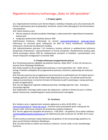 Regulamin konkursu kulinarnego „Ryby na 100 sposobów” I. Przepisy ogólne 1.1. Organizatorem konkursu jest Gmina Słupsk z siedzibą w Słupsku przy ulicy Sportowej 34. Konkurs adresowany jest do gospodyń, kucharek, innych osób zajmujących się kucharstwem niezawodowo. 1.2. Celem konkursu jest:  Wzrost spożycia ryb jako produktu lokalnego z wykorzystaniem regionalnych przepisów kulinarnych  Integracja społeczności lokalnej obszaru SGR 1.3.Promocja konkursu: informacje na stronie www.gminaslupsk.pl, www.sgr.org.pl, informacja na stronach gmin należących do SGR (w miarę możliwości). Przekazanie informacji o konkursie do lokalnych mediów. 1.4. Zaprezentowane potrawy i ich receptury zostaną zebrane w wydawnictwo kulinarne (książeczka drukowana) i zaprezentowane w formie przepisów. Wydawnictwo posłuży jako oferta promująca obszar SGR do rozdawnictwa turystom w hotelach i pensjonatach oraz innych miejscach noclegowych na terenie SGR. II. Przepisy dotyczące przygotowania potraw 2.1. Prezentacja potraw odbędzie się podczas imprezy „Ryby 2012” w dniu 10 czerwca na terenie Parku Wodnego Redzikowo. 2.2. Każdy zespół ma do przygotowania potrawy z trzech gatunków ryb – śledź, dorsz i pstrąg. Produkty niezbędne do przygotowania potrawy uczestnicy zapewniają we własnym zakresie. 2.3. Potrawy powinny być przygotowane do prezentacji na półmiskach po 10 małych porcji z każdego gatunku ryb tak aby możliwa była degustacja przez jury. Do potraw powinna być załączona prezentacja ( na kartce formatu A4 złożonej na pół ) zawierająca: nazwę potrawy i przepis przygotowania. 2.4. Jury po degustacji nagrodzi najlepszą potrawę z każdego gatunku ryby. Zwycięzcy otrzymają nagrody. 2.5. Organizator zastrzega sobie prawo do wyłączenia z udziału w konkursie prac o niskiej jakości estetycznej, niespełniających wyżej wymienionych wymogów. III. Terminarz 3.1. Konkurs wraz z regulaminem zostanie ogłoszony w dniu 16.05.2012 r. na www.gminaslupsk.pl i www.sgr.org.pl , stronach www pozostałych gmin należących do obszaru SGR. Informacja zostanie też przekazana mediom lokalnym. 3.2. Termin zgłaszania zespołów do konkursu - 4.06.2012 r. do godziny 10 na adres mailowy: [email protected] lub telefonicznie pod numerem tel. 59 841 25 51 wew. 22 . W dniu konkursu potrawy należy dostarczyć do godziny 14 do oznaczonego pawilonu na placu przed Parkiem Wodnym Redzikowo. 3.3. Laureata konkursu wyłoni jury konkursu złożone z trzech osób, w tym zawodowego kucharza. 3.4. Wyniki konkursu zostaną ogłoszone podczas festynu „Ryby2012” w dniu 10 czerwca w Parku Wodnym Redzikowo na scenie około godziny 17. IV. Nagrody 4.1. Organizator przewiduje 3 główne nagrody rzeczowe – za każdy przepis z gatunku ryby przysługuje jedna nagroda dla autora lub autorów w przypadku prac zbiorowych, dyplomy oraz fartuszki ochronne z logo konkursu, pozostali uczestnicy nagrody pocieszenia. 4.2. Nagrody zostaną przekazane zwycięzcom w dniu festynu „Ryby 2012” w dniu 10 czerwca 2012 r. V. Wykorzystanie pracy konkursowej 5.1. Autor/autorzy prac przystępując do konkursu oświadcza/ją, że wyraża/ją zgodę na publikację swojego wizerunku i zaprezentowanego przepisu w wydawnictwie kulinarnym, które powstanie po konkursie jako produkt operacji. VI. Informacja o konkursie 6.1. Osobą upoważnioną do udzielania informacji o konkursie jest pani Ewa Guzińska referent ds. promocji i sprzedaży nieruchomości, e-mail: [email protected], tel.(59) 842 84 60 wew. 48