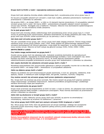 Grypa świń A/H1N1 u ludzi– najczęściej zadawane pytania (Źródło: CDC) Grypa świń jest zakaźną chorobą układu oddechowego świń, wywoływaną przez wirus grypy typu A. Do tej pory przypadki zakaŜeń tym wirusem u ludzi były rzadkie, jednakŜe potwierdzono moŜliwość ich przenoszenia z człowieka na człowieka. Od grudnia 2005 r. do lutego 2009 r. w USA (w 10 stanach) łącznie stwierdzono 12 przypadków zakaŜeń wirusem grypy świń u ludzi. Od marca 2009 r. potwierdzono przypadki zakaŜeń nowym szczepem wirusa typu A/H1N1. Wystąpiły one w Kalifornii i Teksasie. Obecnie trwa dochodzenie epidemiologiczne mające m.in. na celu określenia źródła zakaŜenia. Co to jest grypa świń ? Grypa świń jest chorobą układu oddechowego świń powodowaną przez wirusy grypy typu A. U świń wirusy te powodują liczne zachorowania, jednakŜe śmiertelność na skutek zakaŜenia jest niska. Wirus grypy świń typu A/H1N1 został wyizolowany po raz pierwszy u świń w 1930 roku. Jak duŜo jest wirusów grypy świń ? Tak jak i pozostałe wirusy grypy, tak i wirusy grypy świń stale ulegają zmianom. Świnie mogą zostać zakaŜone przez wirusy grypy ptaków, ludzi i świń. Kiedy dojdzie do jednoczesnego zakaŜenia świni wirusami pochodzącymi od róŜnych gatunków, moŜe dojść do reasortacji, w wyniku której powstanie nowy szczep wirusa. Obecnie od świń izoluje się głównie szczepy H1N1, H1N2, H3N2 i H3N1. GRYPA ŚWIŃ U LUDZI Czy ludzie mogą zachorować na grypę świń ? Zwykle wirusy grypy świń nie zakaŜają ludzi. JednakŜe wcześniej dochodziło do sporadycznych przypadków zakaŜeń, najczęściej na skutek bezpośredniego kontaktu z tymi zwierzętami (np. dzieci bawiące się blisko zwierząt lub pracownicy ferm). W chwili obecnej stwierdzono jednak udokumentowane przypadki przeniesienia wirusów grypy świń bezpośrednio z człowieka na człowieka. Jak często dochodzi do zakaŜenia wirusem grypy świń u ludzi ? Wcześniej amerykańskie CDC otrzymywało zgłoszenia o jednym przypadku rocznie lub co dwa lata, ale od grudnia 2005 r. do lutego 2009 r. stwierdzono 12 przypadków zakaŜenia. Jakie są objawy grypy świń u ludzi? Objawy są podobne do tych towarzyszących grypie sezonowej, w tym np. gorączka, osłabienie, brak apetytu, kaszel. U niektórych osób wystąpił katar, ból gardła, nudności, wymioty i biegunka. Czy moŜna zarazić się wirusem grypy świń przez zjedzenie wieprzowiny? Nie. Grypa świń nie przenosi się przez Ŝywność. Nie moŜna zarazić się grypą świń poprzez zjedzenie mięsa wieprzowego i produktów wieprzowych. Jedzenie prawidłowo przygotowanego i poddanego obróbce termicznej mięsa jest bezpieczne. Jak rozprzestrzenia się grypa świń? Grypa moŜe przenosić się bezpośrednio ze świń na ludzi i z ludzi na świnie. Do zakaŜenia ludzi dochodzi najczęściej poprzez bliski kontakt z zakaŜonymi zwierzętami. MoŜe równieŜ dochodzić do przeniesienia wirusa z człowieka na człowieka. Jakie leki są skuteczne w terapii grypy świń u ludzi? Wyizolowane w USA i Meksyku wirusy grypy świń typu A/H1N1 są oporne na amantadynę i rimantadynę, natomiast są wraŜliwe na oseltamiwir i zanamiwir. Czy wirus grypy świń H1N1 jest tym samym wirusem H1N1 krąŜącym u ludzi? Nie. Wirus grypy świń H1N1 róŜni się genetycznie od wirusa ludzkiego i dlatego teŜ szczepionki przeciwko grypie sezonowej mogą nie zapewnić pełnej ochrony przed zakaŜeniem wirusem odzwierzęcym. INFORMACJA GŁÓWNEGO INSPEKTORATU SANITARNEGO DLA OSÓB UDAJĄCYCH SIĘ DO KRAJÓW, W KTÓRYCH STWIERDZONO PRZYPADKI ZAKAśEŃ WIRUSEM GRYPY ŚWIŃ TYPU A/H1N1 U LUDZI NaleŜy bezwzględnie stosować się do wszelkich zaleceń miejscowej słuŜby zdrowia ściśle przestrzegać reŜimu sanitarnego, a w szczególności: • unikaj bliskiego kontaktu z osobami wykazującymi objawy grypopodobne. Kiedy sam jesteś chory zachowuj odpowiednią odległość od innych osób, tak aby chronić je przed zachorowaniem, • jeśli wystąpią u Ciebie objawy grypopodobne (np. podwyŜszona temperatura ciała, osłabienie, kaszel, brak apetytu, katar, ból gardła), pozostań w domu, • kiedy kaszlesz i kichasz przykrywaj usta i nos chusteczką. To pomoŜe zapobiec zakaŜeniu wirusem innych osób, • myj często ręce wodą z mydłem, • unikaj dotykania oczu, nosa i ust (wirusy i bakterie często rozprzestrzeniają się gdy ludzie dotykają skaŜonych powierzchni, a potem oczu, nosa i ust). Ponadto zaleca się: • w przypadku wystąpienia objawów chorobowych (np. podwyŜszona temperatura ciała, osłabienie, kaszel, brak apetytu, katar, ból gardła) – natychmiast skontaktuj się z lekarzem. INFORMACJA GŁÓWNEGO INSPEKTORATU SANITARNEGO DLA OSÓB POWRACAJĄCYCH Z KRAJÓW, W KTÓRYCH STWIERDZONO PRZYPADKI ZAKAśEŃ WIRUSEM GRYPY ŚWIŃ TYPU A/H1N1 U LUDZI W przypadku wystąpienia w okresie około 10 dni od powrotu do kraju objawów chorobowych (np. podwyŜszona temperatura ciała, osłabienie, kaszel, brak apetytu, katar, ból gardła) naleŜy niezwłocznie udać się do lekarza POZ, najbliŜszego szpitala zakaźnego lub innej placówki leczniczej i poinformować o historii podróŜy