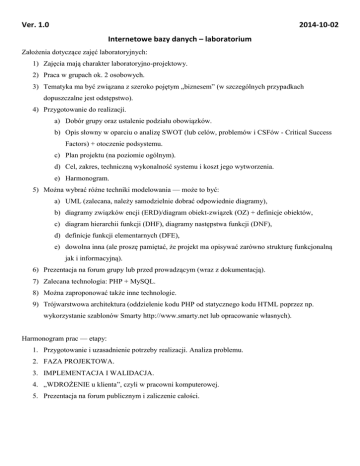 Ver. 1.0 2014-10-02 Internetowe bazy danych – laboratorium Założenia dotyczące zajęć laboratoryjnych: 1) Zajęcia mają charakter laboratoryjno-projektowy. 2) Praca w grupach ok. 2 osobowych. 3) Tematyka ma być związana z szeroko pojętym „biznesem” (w szczególnych przypadkach dopuszczalne jest odstępstwo). 4) Przygotowanie do realizacji. a) Dobór grupy oraz ustalenie podziału obowiązków. b) Opis słowny w oparciu o analizę SWOT (lub celów, problemów i CSFów - Critical Success Factors) + otoczenie podsystemu. c) Plan projektu (na poziomie ogólnym). d) Cel, zakres, techniczną wykonalność systemu i koszt jego wytworzenia. e) Harmonogram. 5) Można wybrać różne techniki modelowania — może to być: a) UML (zalecana, należy samodzielnie dobrać odpowiednie diagramy), b) diagramy związków encji (ERD)/diagram obiekt-związek (OZ) + definicje obiektów, c) diagram hierarchii funkcji (DHF), diagramy następstwa funkcji (DNF), d) definicje funkcji elementarnych (DFE), e) dowolna inna (ale proszę pamiętać, że projekt ma opisywać zarówno strukturę funkcjonalną jak i informacyjną). 6) Prezentacja na forum grupy lub przed prowadzącym (wraz z dokumentacją). 7) Zalecana technologia: PHP + MySQL. 8) Można zaproponować także inne technologie. 9) Trójwarstwowa architektura (oddzielenie kodu PHP od statycznego kodu HTML poprzez np. wykorzystanie szablonów Smarty http://www.smarty.net lub opracowanie własnych). Harmonogram prac — etapy: 1. Przygotowanie i uzasadnienie potrzeby realizacji. Analiza problemu. 2. FAZA PROJEKTOWA. 3. IMPLEMENTACJA I WALIDACJA. 4. „WDROŻENIE u klienta”, czyli w pracowni komputerowej. 5. Prezentacja na forum publicznym i zaliczenie całości.