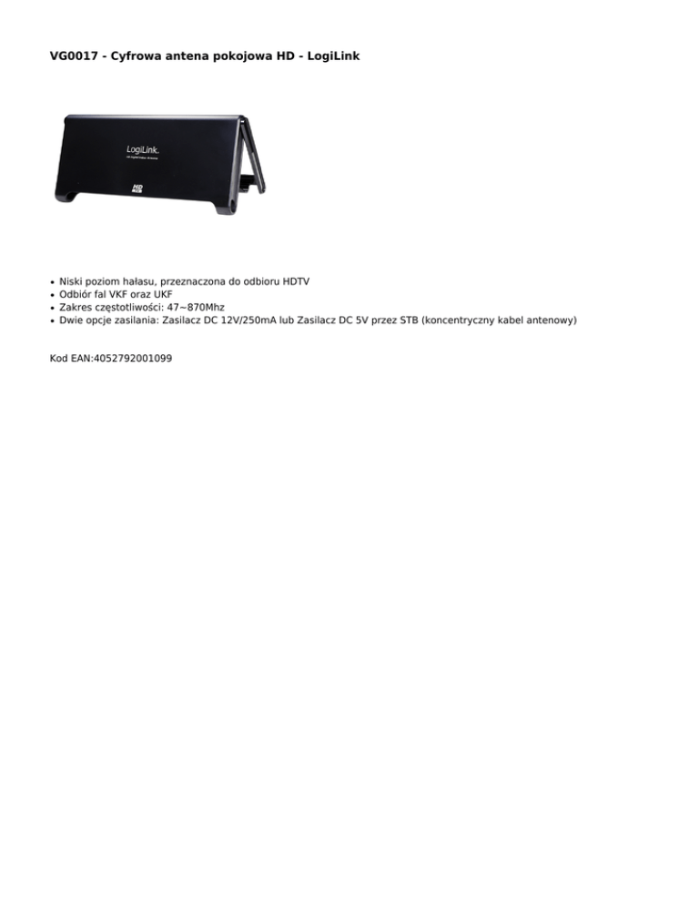 VG0017 - Cyfrowa antena pokojowa HD - LogiLink ● ● ● ● Niski poziom hałasu, przeznaczona do odbioru HDTV Odbiór fal VKF oraz UKF Zakres częstotliwości: 47~870Mhz Dwie opcje zasilania: Zasilacz DC 12V/250mA lub Zasilacz DC 5V przez STB (koncentryczny kabel antenowy) Kod EAN:4052792001099