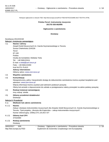 Dz.U./S S35 18/02/2017 62995-2017-PL - - Dostawy - Ogłoszenie o zamówieniu - Procedura otwarta 1 / 18 Niniejsze ogłoszenie w witrynie TED: http://ted.europa.eu/udl?uri=TED:NOTICE:62995-2017:TEXT:PL:HTML Polska-Toruń: Instrumenty muzyczne 2017/S 035-062995 Ogłoszenie o zamówieniu Dostawy Dyrektywa 2014/24/UE Sekcja I: Instytucja zamawiająca I.1) Nazwa i adresy Zespół Szkół Muzycznych im. Karola Szymanowskiego w Toruniu Szosa Chełmińska 224/226 Toruń 87-100 Polska Osoba do kontaktów: Elżbieta Trela Tel.: +48 566122411 E-mail: [email protected] Faks: +48 566122450 Kod NUTS: PL613 Adresy internetowe: Główny adres: www.zsm.torun.pl I.2) Wspólne zamówienie I.3) Komunikacja Nieograniczony, pełny i bezpośredni dostęp do dokumentów zamówienia można uzyskać bezpłatnie pod adresem: www.zsm.torun.pl Więcej informacji można uzyskać pod adresem podanym powyżej Oferty lub wnioski o dopuszczenie do udziału w postępowaniu należy przesyłać na adres podany powyżej I.4) Rodzaj instytucji zamawiającej Inny rodzaj: szkoła I.5) Główny przedmiot działalności Edukacja Sekcja II: Przedmiot II.1) Wielkość lub zakres zamówienia II.1.1) Nazwa: Zakup i dostawa instrumentów muzycznych dla Zespołu Szkół Muzycznych im. Karola Szymanowskiego w Toruniu. Tytuł projektu: „Muzyka dla Kopernika – zakup instrumentów muzycznych”. Numer referencyjny: ZSMuz.071.19.2017.ET II.1.2) Główny kod CPV 37310000 II.1.3) Rodzaj zamówienia Dostawy 18/02/2017 S35 http://ted.europa.eu/TED - - Dostawy - Ogłoszenie o zamówieniu - Procedura otwarta Suplement do Dziennika Urzędowego Unii Europejskiej 1 / 18 Dz.U./S S35 18/02/2017 62995-2017-PL - - Dostawy - Ogłoszenie o zamówieniu - Procedura otwarta 2 / 18 II.1.4) Krótki opis: Przedmiotem zamówienia jest dostawa nowych, nieużywanych, nie będących przedmiotem ekspozycji instrumentów muzycznych z akcesoriami i wyposażeniem wraz z zapewnieniem gwarancji i serwisu do Zespołu Szkół Muzycznych im. Karola Szymanowskiego w Toruniu, o wymaganiach technicznych zgodnych ze Szczegółowym Opisem Przedmiotu Zamówienia zawartym w SIWZ dla każdej z części zamówienia. II.1.5) Szacunkowa całkowita wartość II.1.6) Informacje o częściach To zamówienie podzielone jest na części: tak Oferty można składać w odniesieniu do wszystkich części II.2) Opis II.2.1) Nazwa: Fortepiany z ławą i pokrowcem Część nr: 1 II.2.2) Dodatkowy kod lub kody CPV 37311000 39113300 37321600 II.2.3) Miejsce świadczenia usług Kod NUTS: PL613 II.2.4) Opis zamówienia: Fortepian Yamaha C5X – szt. 10 lub równoważny instrument, tj. spełniający poniższe cechy: — 88 klawiszy — 3 pedały (środkowy pedał: sostenuto) — płyta rezonansowa oraz żebra wykonane ze świerku europejskiego, specjalny system wyprężenia korony zapewniający jej swobodne rezonowanie nawet w najniższych rejestrach dynamicznych — rama wykonana z żeliwa szarego, metodą zapewniającą zwiększoną twardość w części kapodastru oraz krawędzi ramy, a zachowującą większą jej elastyczność w części środkowej — elementy ruchome akcji mechanizmu klawiaturowego wykonane z sezonowanego drewna — stół klawiaturowy wykonany ze świerku z bukowymi wstawkami w miejscach podparcia mechanizmu — rama klawiaturowa wykonana ze świerku oraz europejskiego buku — kołek stroikowy wykonany ze stali hartowanej, niklowany, gwint wielokrotny drobny — popychacze klonowe lub grabowe — belki szkieletowe wykonane ze świerku wysokogórskiego o grubości min. 44 mm, wysokości min. 100 mm rozłożone promieniście i połączone wczepinowo z ramą szkieletu — struny w rejestrze basowym owinięte drutem z czystej miedzi — belki stroikowe wykonane z warstw twardego klonu lub buku, łączonych wertykalnie żywicą, top z twardego klonu lub buku — białe klawisze pokryte imitacją kości słoniowej, zapobiegającej ślizganiu się palców — czarne klawisze wykonane z kompozytu drewna hebanowego lub z hebanu — młotki w części dyszkantowej osadzone na trzonkach o baryłkowatym przekroju — belki mechanizmu grającego tłoczone z aluminium lub mosiądzu — mechanizm łagodnego opuszczania pokrywy klawiatury zabezpieczającym przed jej przypadkowym opadnięciem na ręce pianisty — pedały wykonane z odlewu mosiężnego 18/02/2017 S35 http://ted.europa.eu/TED - - Dostawy - Ogłoszenie o zamówieniu - Procedura otwarta Suplement do Dziennika Urzędowego Unii Europejskiej 2 / 18 Dz.U./S S35 18/02/2017 62995-2017-PL - - Dostawy - Ogłoszenie o zamówieniu - Procedura otwarta 3 / 18 — min. 4 możliwości ustawienia pulpitu — min. 3 pozycje otwarcia pokrywy fortepianu — dodatkowy metalowy wspornik pokrywy — zamki przykrywy fortepianu i pokrywy klawiatury — wykończenie części drewnianych żywicą poliestrową — kolor czarny, polerowany na wysoki połysk — długość od 195 do 211 cm — szerokość od 147 do 151 cm — wysokość od 98 do 101 cm — waga od 345 do 354 kg — instrument wyposażony w koncertową ławę o regulacji hydraulicznej, ergonomicznym skórzanym siedzisku o rozmiarach min. 66 na 33 cm, oraz podstawą wykonaną z metalu. Regulacja wysokości siedziska w zakresie min. 58-45 cm. Siedzisko profilowane z podniesieniem w tylnej części w celu zapewnienia lepszej ergonomii siedzącego — dopasowany do dostarczonego instrumentu pokrowiec z materiału — okres gwarancji jakości: min. 60 miesięcy Dodatkowe wymagania Zamawiającego względem przedmiotu zamówienia, w tym wymogów gwarancji i serwisu zostały określone w SIWZ i we wzorze umowy, stanowiącym załącznik nr 6 do SIWZ. II.2.5) Kryteria udzielenia zamówienia Cena nie jest jedynym kryterium udzielenia zamówienia; wszystkie kryteria są wymienione tylko w dokumentacji zamówienia II.2.6) Szacunkowa wartość II.2.7) Okres obowiązywania zamówienia, umowy ramowej lub dynamicznego systemu zakupów Koniec: 15/07/2017 Niniejsze zamówienie podlega wznowieniu: nie II.