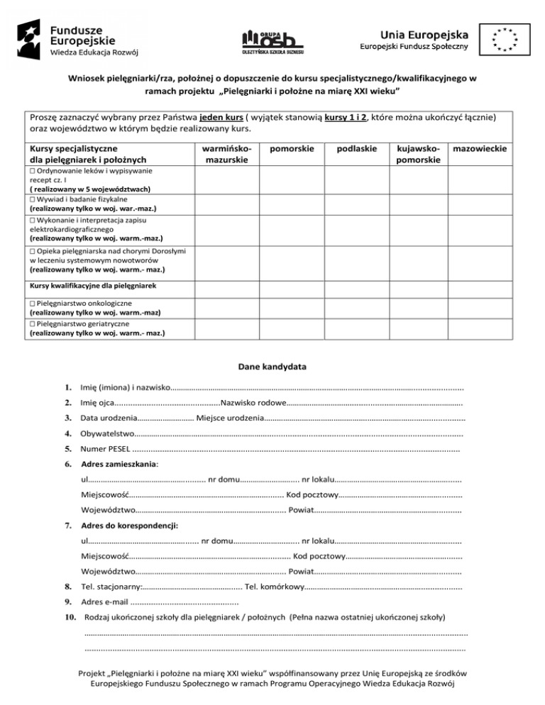 Wniosek pielęgniarki/rza, położnej o dopuszczenie do kursu specjalistycznego/kwalifikacyjnego w ramach projektu „Pielęgniarki i położne na miarę XXI wieku” Proszę zaznaczyć wybrany przez Państwa jeden kurs ( wyjątek stanowią kursy 1 i 2, które można ukończyć łącznie) oraz województwo w którym będzie realizowany kurs. Kursy specjalistyczne dla pielęgniarek i położnych warmińskomazurskie pomorskie podlaskie kujawskopomorskie mazowieckie Ordynowanie leków i wypisywanie recept cz. I ( realizowany w 5 województwach) Wywiad i badanie fizykalne (realizowany tylko w woj. war.-maz.) Wykonanie i interpretacja zapisu elektrokardiograficznego (realizowany tylko w woj. warm.-maz.) Opieka pielęgniarska nad chorymi Dorosłymi w leczeniu systemowym nowotworów (realizowany tylko w woj. warm.- maz.) Kursy kwalifikacyjne dla pielęgniarek Pielęgniarstwo onkologiczne (realizowany tylko w woj. warm.-maz) Pielęgniarstwo geriatryczne (realizowany tylko w woj. warm.- maz.) Dane kandydata 1. Imię (imiona) i nazwisko………………………………………………………………..……….…….……………………...................... 2. Imię ojca..............................................Nazwisko rodowe………………………….................…………….………………. 3. Data urodzenia……………………… Miejsce urodzenia…………………………………………..………………….……................ 4. Obywatelstwo………………………………………………………..................................................................................... 5. Numer PESEL .............................................................................................................................................. 6. Adres zamieszkania: ul……………………………………….......... nr domu…………………….... nr lokalu………………………………………………...... Miejscowość…………………………………………………………....... Kod pocztowy………………………………………….......... Województwo………………………………………………………........ Powiat…………………………………………………............ 7. Adres do korespondencji: ul………………………………………....... nr domu……………………....... nr lokalu………………………………………………...... Miejscowość………………………………………………………….......... Kod pocztowy…………………………………………....... Województwo………………………………………………………........ Powiat…………………………………………………............ 8. Tel. stacjonarny:……………………………………..... Tel. komórkowy……………….…………..……………….….................. 9. Adres e-mail ............................................... 10. Rodzaj ukończonej szkoły dla pielęgniarek / położnych (Pełna nazwa ostatniej ukończonej szkoły) ………………………………………………………………..…………………….……………………………………………............................. ..................................................................................................................................................................... Projekt „Pielęgniarki i położne na miarę XXI wieku” współfinansowany przez Unię Europejską ze środków Europejskiego Funduszu Społecznego w ramach Programu Operacyjnego Wiedza Edukacja Rozwój 11. Uzyskany tytuł zawodowy pielęgniark/położnej .........………………………………............................................... 12. Rok uzyskania dyplomu pielęgniarki / położnej …………………………………………………………………………………...... 13. Numer zaświadczenia o prawie wykonywania zawodu pielęgniarki / położnej Rok wydania………………........... Nazwa Organu wydającego……………..…………………………………….……….…. ………………………………………………………………………………………………………………….............…………..................... 14. Numer rejestru pielęgniarek i położnych 15. Nazwa i adres miejsca zatrudnienia ...……………………………………………………………………………………………..... ……………………………………………………………………………………………………………………………………........................ Zajmowane stanowisko………………………………………………………………………………………………………….............. Oddział ................................................................................................................................................... 1 Pracownik POZ Tak/Nie 16. Oświadczam, że jestem ubezpieczona/ubezpieczony od NNW Tak/Nie2 17. Oświadczam, że nie brałam/brałem udziału w żadnym z wyżej wymienionych kursów, realizowanych w ramach projektu współfinansowanego przez Unię Europejską z Europejskiego Funduszu Społecznego w ramach Programu Operacyjnego Wiedza Edukacja Rozwój 2014 – 2020, Działanie 5.4 Kompetencje zawodowe i kwalifikacje kadr medycznych. ………………………………….. Miejscowość i data ………………………………………… Podpis wnioskodawcy Do wniosku należy dołączyć3: 1) 2) 3) 4) 5) 6) 7) kopia prawa wykonywania zawodu pielęgniarki/ położnej na obszarze Rzeczypospolitej Polskiej, dokumentu potwierdzającego aktualne zatrudnienie w zawodzie pielęgniarki/ położnej na obszarze Rzeczypospolitej Polskiej (którego data sporządzenia nie przekracza 1 miesiąca do d