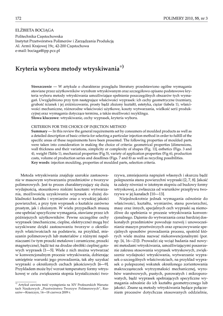 POLIMERY 2010, 55, nr 3 172 EL¯BIETA BOCI¥GA Politechnika Czêstochowska Instytut Przetwórstwa Polimerów i Zarz¹dzania Produkcj¹ Al. Armii Krajowej 19c, 42-200 Czêstochowa e-mail: [email protected] Kryteria wyboru metody wtryskiwania∗) Streszczenie — W artykule o charakterze przegl¹du literatury przedstawiono ogólne wymagania stawiane przez u¿ytkowników wyrobom wtryskiwanym oraz szczegó³owo opisano podstawowe kryteria wyboru metody wtryskiwania umo¿liwiaj¹ce spe³nienie poszczególnych obszarów tych wymagañ. Uwzglêdniono przy tym nastêpuj¹ce w³aœciwoœci wyprasek: ich cechy geometryczne (rozmiary, gruboœæ œcianek i jej zró¿nicowanie, prosty b¹dŸ z³o¿ony kszta³t), estetyka, ciê¿ar (tabela 1), w³aœciwoœci mechaniczne, ró¿norodne w³aœciwoœci u¿ytkowe, koszty wytwarzania, wielkoœæ serii produkcyjnej oraz wymagania dotycz¹ce terminu, a tak¿e mo¿liwoœci recyklingu. S³owa kluczowe: wtryskiwanie, cechy wyprasek, kryteria wyboru. CRITERION FOR THE CHOICE OF INJECTION METHOD Summary — In this review the general requirements set by consumers of moulded products as well as a detailed description of basic criteria for selecting a particular injection method in order to fulfill of the specific areas of these requirements have been presented. The following properties of moulded parts were taken into consideration in making the choice of criteria: geometrical properties [dimensions, wall thickness and their variations, simplicity or complexity of shapes (Fig. 1)], esthetics (Figs. 3 and 4), weight (Table 1), mechanical properties (Fig 5), variety of application properties (Fig 6), production costs, volume of production series and deadlines (Figs. 7 and 8) as well as recycling possibilities. Key words: injection moulding, properties of moulded parts, selection criteria. Metoda wtryskiwania znajduje szerokie zastosowanie w masowym wytwarzaniu przedmiotów z tworzyw polimerowych. Jest to proces charakteryzuj¹cy siê du¿¹ wydajnoœci¹, stosunkowo niskimi kosztami wytwarzania, mo¿liwoœci¹ uzyskiwania wyprasek o du¿ej dok³adnoœci kszta³tu i wymiarów oraz o wysokiej jakoœci powierzchni, a przy tym wyprasek o kszta³cie zarówno prostym, jak i z³o¿onym. W wielu przypadkach musz¹ one spe³niaæ specyficzne wymagania, stawiane przez ich póŸniejszych u¿ytkowników. Pewne szczególne cechy wyprasek (mechaniczne, cieplne, elektryczne) mog¹ byæ uzyskiwane dziêki zastosowaniu tworzyw o okreœlonych w³aœciwoœciach na podstawie, na przyk³ad, mieszanin polimerowych lub materia³ów z ró¿nymi nape³niaczami (w tym proszki metalowe i ceramiczne, proszki magnetyczne), b¹dŸ te¿ na drodze obróbki cieplnej gotowych wyprasek [1—5]. Wiele z nich mo¿na wytwarzaæ w konwencjonalnym procesie wtryskiwania, dobieraj¹c umiejêtnie warunki jego prowadzenia, tak aby uzyskaæ wypraski o okreœlonych cechach jakoœciowych [6—9]. Przyk³adem mo¿e byæ wzrost temperatury formy wtryskowej w celu zwiêkszenia stopnia krystalicznoœci two∗) Artyku³ zawiera treœæ wyst¹pienia na XIV Profesorskich Warsztatach Naukowych „Przetwórstwo Tworzyw Polimerowych”, Rzeszów—Krasiczyn, 14—18 czerwca 2009 r. rzywa, zmniejszenia naprê¿eñ w³asnych i skurczu b¹dŸ polepszenia stanu powierzchni wypraski [2, 7, 8]. Jakoœæ ta zale¿y równie¿ w istotnym stopniu od budowy formy wtryskowej, a zw³aszcza od warunków przep³ywu tworzywa w jej kana³ach [10—13]. Niejednokrotnie jednak wymagania odnoœnie do w³aœciwoœci, kszta³tu, wymiarów, stanu powierzchni, masy oraz innych, specjalnych cech wypraski s¹ niemo¿liwe do spe³nienia w procesie wtryskiwania konwencjonalnego. D¹¿enie do wytwarzania coraz bardziej doskona³ych przedmiotów powoduje rozwój i unowoczeœnianie maszyn przetwórczych oraz opracowywanie specjalnych sposobów prowadzenia procesu, spoœród których wiele mo¿na nazwaæ niekonwencjonalnymi (por. np. [4, 16—21]). Prowadzi siê wci¹¿ badania nad nowymi metodami wtryskiwania, umo¿liwiaj¹cymi poszerzenie zakresu stosowania wyprasek wtryskowych, zwiêkszenie wydajnoœci wtryskiwania, wytwarzanie wyprasek o szczególnych w³aœciwoœciach, na przyk³ad wyprasek o polepszonej wskutek okreœlonego zorientowania makrocz¹steczek wytrzyma³oœci mechanicznej, wyrobów warstwowych, pustych, porowatych i mikroporowatych, b¹dŸ wyprasek spe³niaj¹cych specyficzne wymagania odnoœnie do ich kszta³tu geometrycznego lub jakoœci. Znane s¹ metody wtryskiwania bêd¹ce po³¹czeniem procesów dotychczas stosowanych oddzielnie, POLIMERY 2010, 55, nr 3 takie jak wtryskiwanie z dekorowaniem lub laminowaniem w formie albo wtryskiwanie z monta¿em w formie. Oddzieln¹ grupê stanowi¹ metody, w których dziêki z³o¿onemu ruchowi podzespo³ów formy uzyskuje siê wypraski o du¿ej dok³adnoœci, jednorodnych w³aœciwoœciach, z niewielkimi naprê¿eniami w³asnymi, np. soczewki, b¹dŸ te¿ takie z³o¿one formy, jakie umo¿liwiaj¹ znaczne zwiêkszenie wydajnoœci produkcji. W ksi¹¿ce Autorki [14] przedstawiono klasyfikacjê i charakterystykê wielu znanych z dotychczasowej literatury specjalnych metod wtryskiwania opisanych w niniejszym artykule. Podstawowa znajomoœæ ró¿nych metod wtryskiwania mo¿e pomóc w podejmowaniu decyzji o wyborze w³aœciwego sposobu wytwarzania wyrobów z uwzglêdnieniem zarówno ich jakoœci, jak i kosztów wytwarzania. Zagadnienie wyboru metody wytwarzania nie jest jednak ³atwe, nale¿y tu bowiem rozwa¿yæ wiele czynników zwi¹zanych z w³aœciwoœciami, budow¹, rozmiarami, mas¹ i wygl¹dem wypraski. Istotne s¹ ponadto informacje dotycz¹ce mo¿liwoœci wytwarzania, takie jak znajomoœæ technologii procesu wtryskiwania i ró¿nych jego odmian, dane o posiadanych maszynach i urz¹dzeniach pomocniczych, umiejêtnoœciach wykonawców, a tak¿e w³aœciwoœciach materia³ów przetwarzanych. OGÓLNA CHARAKTERYSTYKA PODSTAWOWYCH KRYTERIÓW WYBORU METODY WTRYSKIWANIA Niejednokrotnie do uzyskania