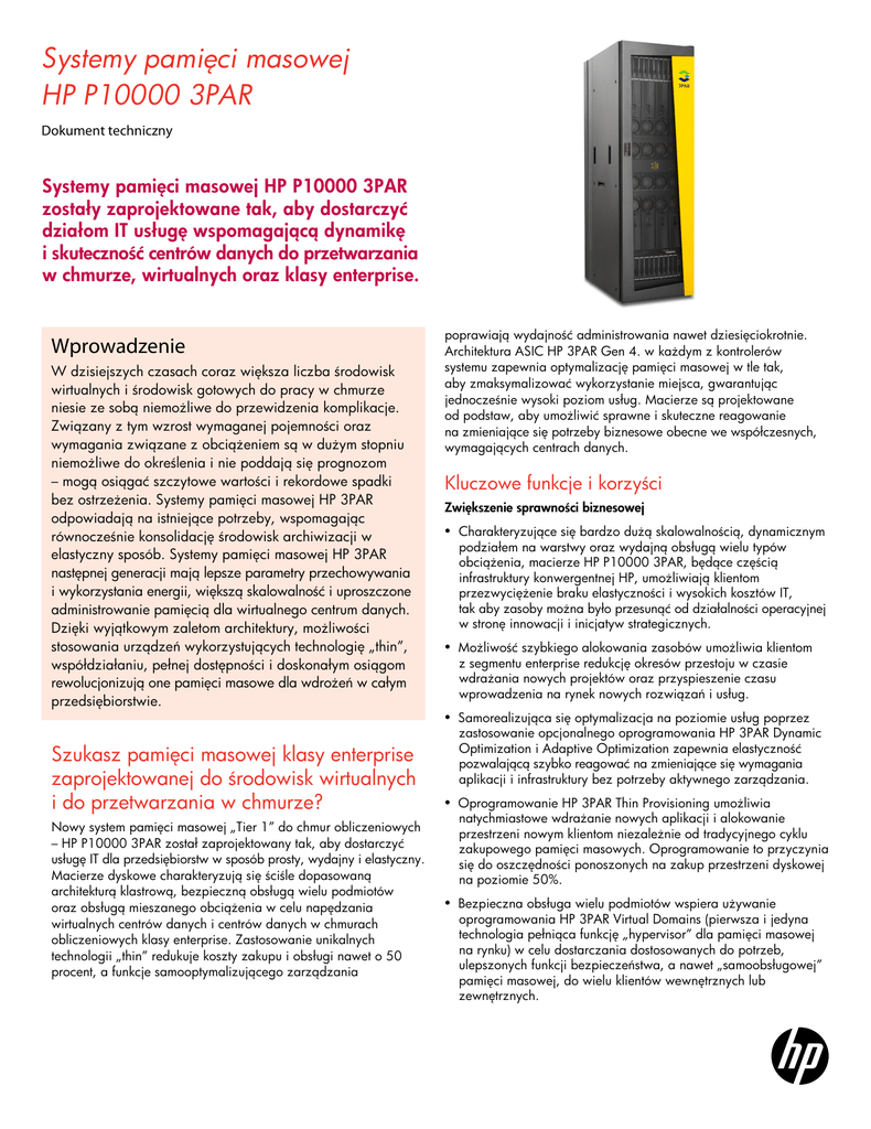 Systemy pamięci masowej HP P10000 3PAR Dokument techniczny Systemy pamięci masowej HP P10000 3PAR zostały zaprojektowane tak, aby dostarczyć działom IT usługę wspomagającą dynamikę i skuteczność centrów danych do przetwarzania w chmurze, wirtualnych oraz klasy enterprise. Wprowadzenie W dzisiejszych czasach coraz większa liczba środowisk wirtualnych i środowisk gotowych do pracy w chmurze niesie ze sobą niemożliwe do przewidzenia komplikacje. Związany z tym wzrost wymaganej pojemności oraz wymagania związane z obciążeniem są w dużym stopniu niemożliwe do określenia i nie poddają się prognozom – mogą osiągać szczytowe wartości i rekordowe spadki bez ostrzeżenia. Systemy pamięci masowej HP 3PAR odpowiadają na istniejące potrzeby, wspomagając równocześnie konsolidację środowisk archiwizacji w elastyczny sposób. Systemy pamięci masowej HP 3PAR następnej generacji mają lepsze parametry przechowywania i wykorzystania energii, większą skalowalność i uproszczone administrowanie pamięcią dla wirtualnego centrum danych. Dzięki wyjątkowym zaletom architektury, możliwości stosowania urządzeń wykorzystujących technologię „thin”, współdziałaniu, pełnej dostępności i doskonałym osiągom rewolucjonizują one pamięci masowe dla wdrożeń w całym przedsiębiorstwie. Szukasz pamięci masowej klasy enterprise zaprojektowanej do środowisk wirtualnych i do przetwarzania w chmurze? Nowy system pamięci masowej „Tier 1” do chmur obliczeniowych – HP P10000 3PAR został zaprojektowany tak, aby dostarczyć usługę IT dla przedsiębiorstw w sposób prosty, wydajny i elastyczny. Macierze dyskowe charakteryzują się ściśle dopasowaną architekturą klastrową, bezpieczną obsługą wielu podmiotów oraz obsługą mieszanego obciążenia w celu napędzania wirtualnych centrów danych i centrów danych w chmurach obliczeniowych klasy enterprise. Zastosowanie unikalnych technologii „thin” redukuje koszty zakupu i obsługi nawet o 50 procent, a funkcje samooptymalizującego zarządzania poprawiają wydajność administrowania nawet dziesięciokrotnie. Architektura ASIC HP 3PAR Gen 4. w każdym z kontrolerów systemu zapewnia optymalizację pamięci masowej w tle tak, aby zmaksymalizować wykorzystanie miejsca, gwarantując jednocześnie wysoki poziom usług. Macierze są projektowane od podstaw, aby umożliwić sprawne i skuteczne reagowanie na zmieniające się potrzeby biznesowe obecne we współczesnych, wymagających centrach danych. Kluczowe funkcje i korzyści Zwiększenie sprawności biznesowej • Charakteryzujące się bardzo dużą skalowalnością, dynamicznym podziałem na warstwy oraz wydajną obsługą wielu typów obciążenia, macierze HP P10000 3PAR, będące częścią infrastruktury konwergentnej HP, umożliwiają klientom przezwyciężenie braku elastyczności i wysokich kosztów IT, tak aby zasoby można było przesunąć od działalności operacyjnej w stronę innowacji i inicjatyw strategicznych. • Możliwość szybkiego alokowania zasobów umożliwia klientom z segmentu enterprise redukcję okresów przestoju w czasie wdrażania nowych projektów oraz przyspieszenie czasu wprowadzenia na rynek nowych rozwiązań i usług. • Samorealizująca się optymalizacja na poziomie usług poprzez zastosowanie opcjonalnego oprogramowania HP 3PAR Dynamic Optimization i Adaptive Optimization zapewnia elastyczność pozwalającą szybko reagować na zmieniające się wymagania aplikacji i infrastruktury bez potrzeby aktywnego zarządzania. • Oprogramowanie HP 3PAR Thin Provisioning umożliwia natychmiastowe wdrażanie nowych aplikacji i alokowanie przestrzeni nowym klientom niezależnie od tradycyjnego cyklu zakupowego pamięci masowych. Oprogramowanie to przyczynia się do oszczędności ponoszonych na zakup przestrzeni dyskowej na poziomie 50%. • Bezpieczna obsługa wielu podmiotów wspiera używanie oprogramowania HP 3PAR Virtual Domains (pierwsza i jedyna technologia pełniąca funkcję „hypervisor” dla pamięci masowej na rynku) w celu dostarczania dostosowanych do potrzeb, ulepszonych funkcji bezpieczeństwa, a nawet „samoobsługowej” pamięci masowej, do wielu klientów wewnętrznych lub zewnętrznych. Redukcja całkowitego kosztu posiadania związanego z pamięcią masową nawet o 50% Nawet dziesięciokrotne zwiększenie skuteczności administracyjnej bloków konstrukcyjnych do przetwarzania w chmurze obliczeniowej • Zaawansowana wirtualizacja wewnętrzna, możliwość segmentacji danych i obsługi mieszanego obciążenia ograniczają zużycie fizycznej przestrzeni, zasilania oraz potrzeby chłodzenia bez ograniczania wydajności. • • Dwa układy ASIC HP 3PAR Gen 4. z wbudowanym mechanizmem Thin w każdym węźle kontrolera napędzają proces zwany „thin conversion”, w celu zmniejszenia wymagań dotychczas stosowanej pamięci masowej i odzysku przydzielonej, lecz nieużywanej przestrzeni w celu zachowania optymalnego wykorzystania miejsca. System operacyjny HP 3PAR InForm, działający na wszystkich macierzach HP 3PAR, umożliwia o wiele bardziej uproszczone, samorealizujące się przydzielanie zasobów i zarządzanie odciążające administratorów od żmudnych, manualnych zadań oraz zmniejsza ryzyko wystąpienia błędu. • Oprogramowanie HP 3PAR Thin Provisioning eliminuje konieczność ciągłego planowania wykorzystania macierzy, umożliwiając administratorom przydzielanie przestrzeni tylko raz w czasie życia aplikacji. • Oprogramowanie HP 3PAR Thin Provisioning pozwala unikać marnowania miejsca, umożliwiając klientom nabywanie tylko takiej ilości przestrzeni dyskowej, jakiej potrzebują na zapisane dane. • • Praca z oprogramowaniem HP 3PAR Virtual Copy, pozbawioną rezerwacji technologią „thin copy-on-write”, w celu redukcji przestrzeni powiązanej z często wykonywanymi migawkami na podstawie dysków i tworzącej wirtualne kopie, które można montować i wykorzyst