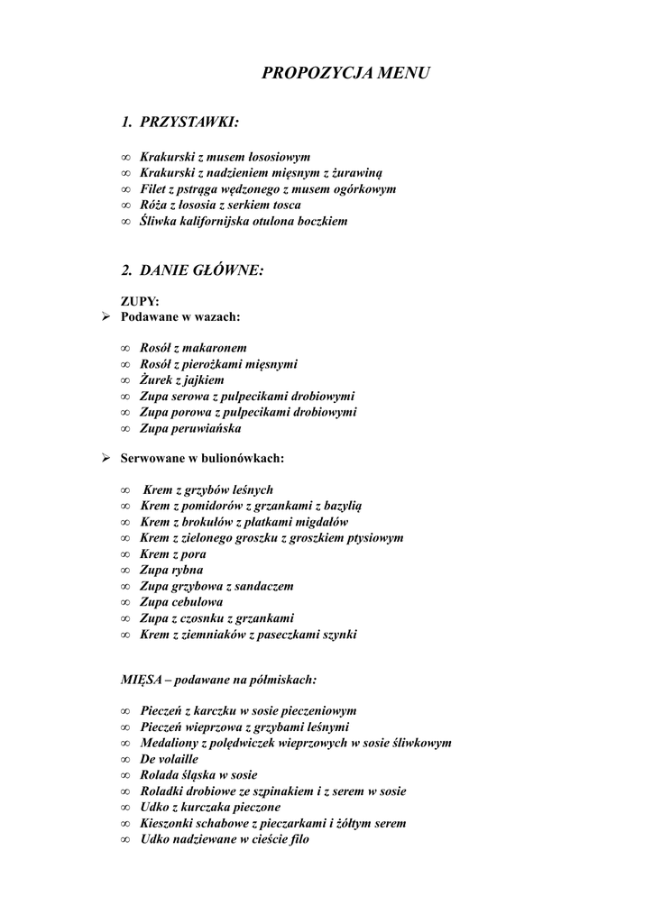 PROPOZYCJA MENU 1. PRZYSTAWKI: • • • • • Krakurski z musem łososiowym Krakurski z nadzieniem mięsnym z żurawiną Filet z pstrąga wędzonego z musem ogórkowym Róża z łososia z serkiem tosca Śliwka kalifornijska otulona boczkiem 2. DANIE GŁÓWNE: ZUPY: Podawane w wazach: • • • • • • Rosół z makaronem Rosół z pierożkami mięsnymi Żurek z jajkiem Zupa serowa z pulpecikami drobiowymi Zupa porowa z pulpecikami drobiowymi Zupa peruwiańska Serwowane w bulionówkach: • • • • • • • • • • Krem z grzybów leśnych Krem z pomidorów z grzankami z bazylią Krem z brokułów z płatkami migdałów Krem z zielonego groszku z groszkiem ptysiowym Krem z pora Zupa rybna Zupa grzybowa z sandaczem Zupa cebulowa Zupa z czosnku z grzankami Krem z ziemniaków z paseczkami szynki MIĘSA – podawane na półmiskach: • • • • • • • • • Pieczeń z karczku w sosie pieczeniowym Pieczeń wieprzowa z grzybami leśnymi Medaliony z polędwiczek wieprzowych w sosie śliwkowym De volaille Rolada śląska w sosie Roladki drobiowe ze szpinakiem i z serem w sosie Udko z kurczaka pieczone Kieszonki schabowe z pieczarkami i żółtym serem Udko nadziewane w cieście filo • • • • • • • Udko faszerowane z pieczarkami Kotlet schabowy Filet z kurczaka w panierce Pierś z kurczaka w sosie śmietanowo- cebulowym Filet z kurczaka z krewetkami koktajlowymi w sosie pietruszkowym Kieski schabowe faszerowane kapustą kiszoną i pieczarkami w sosie pieczeniowym Schabowe cygaro z fetą i boczkiem w sosie pieprzowym RYBY – podawane na półmiskach: Filet z dorsza w cieście Filet z dorsza w sosie cytrynowo – maślanym Filet z dorsza w panierce Filet z łososia w sosie cytrynowo – maślanym SURÓWKI: • Surówka z białej kapusty • Surówka z czerwonej kapusty z jabłkiem • Mizeria • Surówka z marchwi i jabłka • Surówka z kapusty pekińskiej • Surówka z selera • Buraczki • Kapusta biała zasmażana • Kapusta czerwona na ciepło • Surówka z kapusty kiszonej • Warzywa gotowane na parze DODATKI: • Ziemniaki po polsku • Ziemniaki zapiekane • Kluski śląskie • Frytki • Kopytka • Kopytka zasmażane z kapustą kiszoną 2. PRZEKĄSKI: • • • • Sałatka gyros (kapusta pekińska, filet z kurczaka, cebula, ogórek konserwowy, kukurydza konserwowa) Sałatka jarzynowa (marchew, ziemniaki, kukurydza i groszek konserwowy, por, seler, pietruszka, ogórek kiszony, jajka) Sałatka z kolbami kukurydzy (kukurydza konserwowa, kukurydza mini, ogórek konserwowy, jajko, pieczarka marynowana, ser żółty) Sałatka z selera i szynki (seler konserwowy, szynka, kukurydza konserwowa, • • • • • • • • • • • • • • • • • • • • • • • • • • • • • • • • • • • • • • • ananas) Sałatka grecka (ser feta, sałata lodowa, pomidor, ogórek, oliwki, papryka) Sałatka krewetkowa z makaronem ( makaron kokardki, krewetki koktajlowe, ananas) Sałatka z kurczaka z ryżem (filet z kurczaka, ryż, kukurydza konserwowa, ananas) Sałatka ze słonecznikiem (kapusta pekińska, kukurydza konserwowa, filet z kurczaka, prażony słonecznik) Sałatka makaronowa (filet z kurczaka, brokuły, ser żółty, kukurydza, makaron kokardki) Sałatka z kurczakiem i malinami (filet z kurczaka, sałata lodowa, pomarańcza, malina) Sałatka meksykańska (sałata, pomidor, mięso mielone – wieprzowe, pieczarka, cebula, fasolka czerwona, kukurydza konserwowa, ser żółty, chipsy) Sałatka kus-kus (kasza kus-kus, polędwiczki wieprzowe, ogórek konserwowy, papryka konserwowa) Sałatka kardynalska (filet śledziowy, burak czerwony, jabłko, cebula) Brokuły z pomidorami, jajkami w sosie czosnkowym Śledzie z cebulką i ogórkiem Śledzie w śmietanie Śledź po japońsku Pieczeń rzymska Roladki drobiowe nadziewane szpinakiem Roladki drobiowe nadziewane grzybami Roladki drobiowe nadziewane warzywami Roladki wieprzowe nadziewane brokułami Pieczysty karczek Schab ze śliwką Pieczysty schab Pieczysty boczek Galantyna z kurczaka Schab w galarecie Tymbaliki drobiowe – galaretka drobiowa z warzywami Galareta wieprzowa Wędliny Jaja faszerowane pieczarkami Jaja w sosie tatarskim Pieczarki zapiekane z żółtym serem w panierce Pomidor, ogórek Pomidor faszerowany trzema rodzajami sera Deska serów Ryba po grecku Ryba po japońsku Roladki z wędzonym łososiem i szpinakiem Pikle Pieczywo Sosy do mięs: chrzanowy, czosnkowy, żurawinowy 3. DANIA NA GORĄCO: • • • • • • • • • • • • • • Gulaszowa Zupa peruwiańska Warzywa zapiekane w sosie beszamelowym Filet z dorsza w sosie cytrynowo – maślanym Ostrogonow Żeberka po bawarsku Flaczki Bigos Golonka na kapuście Szaszłyk Barszcz czerwony + krokiet/pasztecik Barszcz czerwony z pierogami ruskimi/pierogami z mięsem Gołąbki w sosie pomidorowym Bogracz 4. NAPOJE: • • • • Woda niegazowana z cytryną Sok owocowy Napoje gazowane: coca-cola, fanta, sprite Kawa, herbata bez ograniczeń 5. DESERY: • • • • • • • Lody z gorącymi malinami Pucharek lodowy Szarlotka na ciepło z lodami Ciasta Owoce Sałatka owocowa Fontanna czekoladowa z dodatkami 6. ALKOHOLE: • • • Szampan Piwo Żywiec beczka 20l Wina czerwone i białe