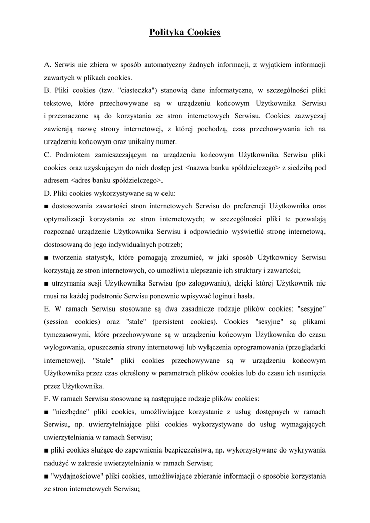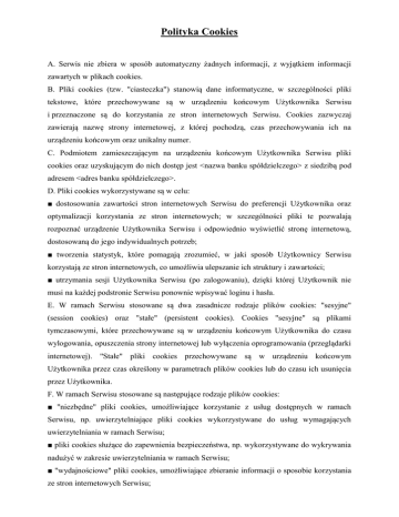 Polityka Cookies A. Serwis nie zbiera w sposób automatyczny żadnych informacji, z wyjątkiem informacji zawartych w plikach cookies. B. Pliki cookies (tzw. "ciasteczka") stanowią dane informatyczne, w szczególności pliki tekstowe, które przechowywane są w urządzeniu końcowym Użytkownika Serwisu i przeznaczone są do korzystania ze stron internetowych Serwisu. Cookies zazwyczaj zawierają nazwę strony internetowej, z której pochodzą, czas przechowywania ich na urządzeniu końcowym oraz unikalny numer. C. Podmiotem zamieszczającym na urządzeniu końcowym Użytkownika Serwisu pliki cookies oraz uzyskującym do nich dostęp jest <nazwa banku spółdzielczego> z siedzibą pod adresem <adres banku spółdzielczego>. D. Pliki cookies wykorzystywane są w celu: ■ dostosowania zawartości stron internetowych Serwisu do preferencji Użytkownika oraz optymalizacji korzystania ze stron internetowych; w szczególności pliki te pozwalają rozpoznać urządzenie Użytkownika Serwisu i odpowiednio wyświetlić stronę internetową, dostosowaną do jego indywidualnych potrzeb; ■ tworzenia statystyk, które pomagają zrozumieć, w jaki sposób Użytkownicy Serwisu korzystają ze stron internetowych, co umożliwia ulepszanie ich struktury i zawartości; ■ utrzymania sesji Użytkownika Serwisu (po zalogowaniu), dzięki której Użytkownik nie musi na każdej podstronie Serwisu ponownie wpisywać loginu i hasła. E. W ramach Serwisu stosowane są dwa zasadnicze rodzaje plików cookies: "sesyjne" (session cookies) oraz "stałe" (persistent cookies). Cookies "sesyjne" są plikami tymczasowymi, które przechowywane są w urządzeniu końcowym Użytkownika do czasu wylogowania, opuszczenia strony internetowej lub wyłączenia oprogramowania (przeglądarki internetowej). "Stałe" pliki cookies przechowywane są w urządzeniu końcowym Użytkownika przez czas określony w parametrach plików cookies lub do czasu ich usunięcia przez Użytkownika. F. W ramach Serwisu stosowane są następujące rodzaje plików cookies: ■ "niezbędne" pliki cookies, umożliwiające korzystanie z usług dostępnych w ramach Serwisu, np. uwierzytelniające pliki cookies wykorzystywane do usług wymagających uwierzytelniania w ramach Serwisu; ■ pliki cookies służące do zapewnienia bezpieczeństwa, np. wykorzystywane do wykrywania nadużyć w zakresie uwierzytelniania w ramach Serwisu; ■ "wydajnościowe" pliki cookies, umożliwiające zbieranie informacji o sposobie korzystania ze stron internetowych Serwisu; ■ "funkcjonalne" pliki cookies, umożliwiające "zapamiętanie" wybranych przez Użytkownika ustawień i personalizację interfejsu Użytkownika, np. w zakresie wybranego języka lub regionu, z którego pochodzi Użytkownik, rozmiaru czcionki, wyglądu strony internetowej itp.; ■ "reklamowe" pliki cookies, umożliwiające dostarczanie Użytkownikom treści reklamowych bardziej dostosowanych do ich zainteresowań. G. W wielu przypadkach oprogramowanie służące do przeglądania stron internetowych (przeglądarka internetowa) domyślnie dopuszcza przechowywanie plików cookies w urządzeniu końcowym Użytkownika. Użytkownicy Serwisu mogą dokonać w każdym czasie zmiany ustawień dotyczących plików cookies. Ustawienia te mogą zostać zmienione w szczególności w taki sposób, aby blokować automatyczną obsługę plików cookies w ustawieniach przeglądarki internetowej bądź informować o ich każdorazowym zamieszczeniu w urządzeniu Użytkownika Serwisu. Informacje dotyczące sposobów zmian ustawienia cookies w najpopularniejszych przeglądarkach internetowych znajdują się w dalszej części niniejszego dokumentu. Szczegółowe informacje o możliwości i sposobach obsługi plików cookies dostępne są w ustawieniach oprogramowania (przeglądarki internetowej) oraz w plikach pomocy dostępnych w menu przeglądarki. H. <nazwa banku spółdzielczego> informuje, że ograniczenia stosowania plików cookies mogą wpłynąć na niektóre funkcjonalności dostępne na stronach internetowych Serwisu. I. Pliki cookies wykorzystywane zamieszczane mogą być w również urządzeniu przez końcowym Użytkownika współpracujących z Serwisu <nazwa banku spółdzielczego> reklamodawców oraz partnerów. INSTRUKCJA Jak usunąć pliki cookies ? Jak wyłączyć przechowywanie na komputerze plików cookies ? Jak przywrócić przechowywanie plików cookies ? Sposób zmiany ustawień plików cookies może różnić się w zależności od przeglądarki internetowej, z której korzysta użytkownik. Informacje na temat plików cookies znajdują się w zakładce "Pomoc" w każdej przeglądarce internetowej, a także na stronie http://www.aboutcookies.org Pliki cookies w przeglądarkach internetowych: W opcjach przeglądarki należy wybrać opcję odpowiadającą za ustawienia prywatności: Google Chrome Domyślne ustawienia przeglądarki Google Chrome zezwalają na przechowywanie cookies. Aby zmienić ustawienia należy: ■ kliknąć w menu "Ustawienia Google Chrome" i wybrać opcję "Ustawienia"; ■ kliknąć w "Pokaż ustawienia zaawansowane" na dole strony; ■ wybrać opcję "Ustawienia treści" w opcjach "Prywatność"; ■ wybrać żądane ustawienia; ■ aby wprowadzić specjalne ustawienia dla danego serwisu należy kliknąć w "Zarządzaj wyjątkami" i wybrać własne ustawienia dla witryn; ■ aby zatwierdzić zmiany należy kliknąć w przycisk "Gotowe". Microsoft Internet Explorer Domyślne ustawienia przeglądarki Microsoft Internet Explorer zezwalają na przechowywanie plików cookies, ale blokują pliki, które mogą pochodzić z serwisów niestosujących polityki prywatności. Aby zmienić ustawienia należy: ■ kliknąć w menu "Narzędzia" i wybrać "Opcje Internetowe"; ■ wybrać zakładkę "Prywatność"; ■ za pomocą suwaka określić żądany poziom ustawień (najwyższy blokuje cookies całkowicie, najniższy zezwala na przechowywanie wszystkich cookies); LUB: ■ kliknąć pr